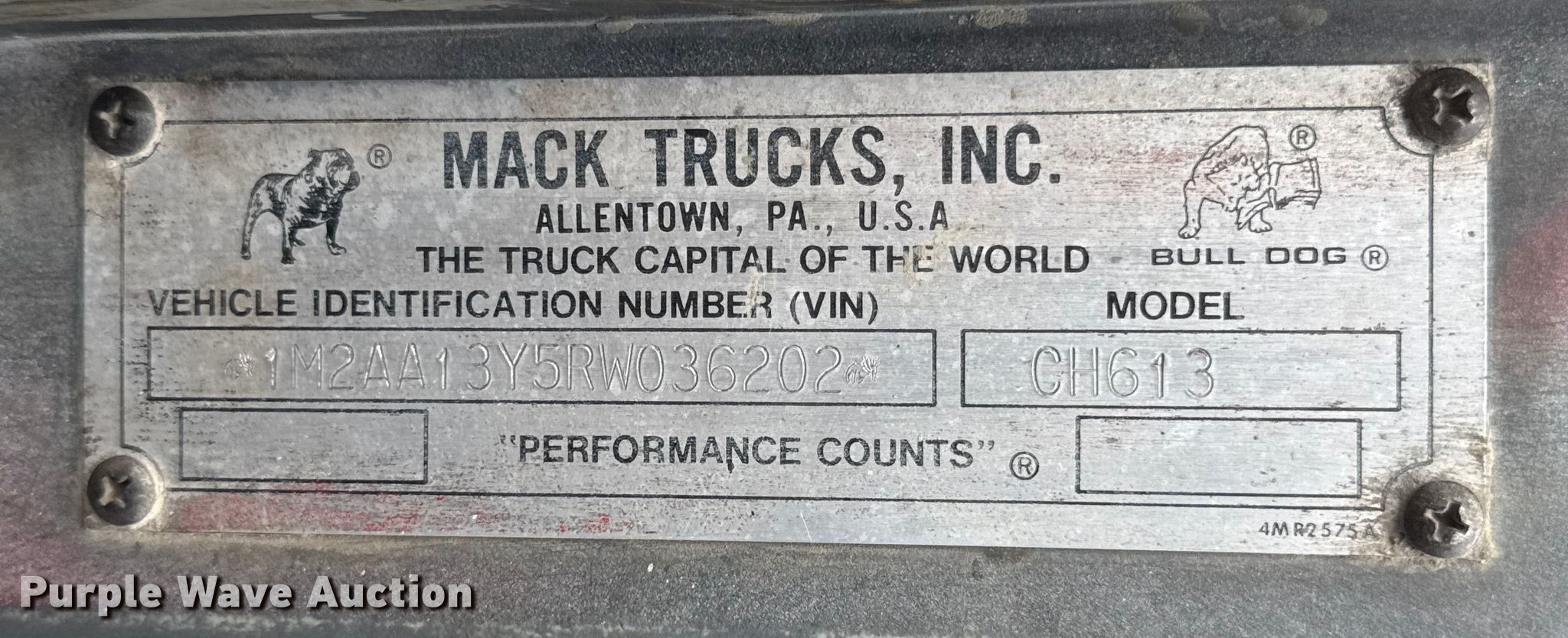 Purple Wave is selling a used Truck Tractor in Illinois. This item is a 1994 Mack CH613 semi truck with the following: Miles: 511,391 on odometer, Hours: 44,943 on meter, VIN: 1M2AA13Y5RW036202
