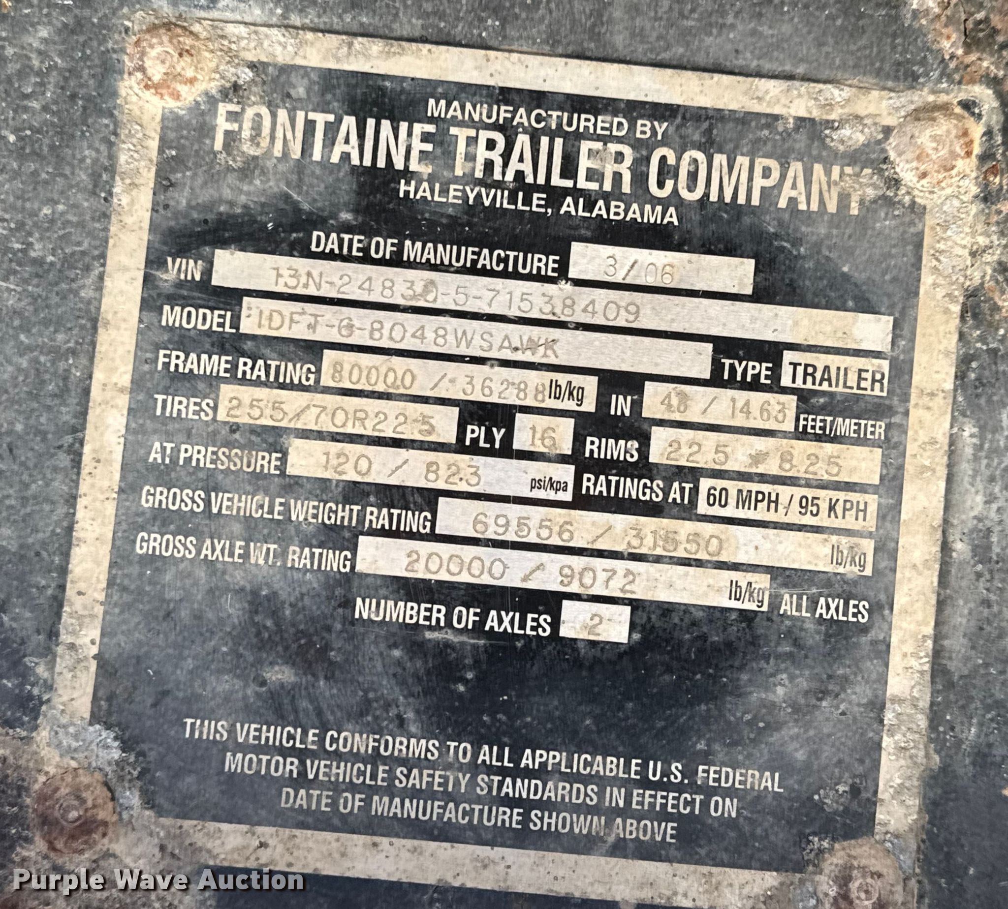 2006 Fontaine IDFT-6-8048WSAWK drop deck equipment trailer. VIN: 13N24830571538409, Unit #: 802. Dimensions Overall Length: 48', Width: 102", Deck Length: 37' 10", Width: 102", Top deck length: 10', Deck height: 38". Features Deck type: Aluminum, Steel, Wood. Chassis Landing gear: Dual, Suspension: Air, Brakes: Air, Axles: Spread, GVWR: 69,556 lbs, GAWR: 20,000 lbs. Tires Aluminum wheels, Size: 225/70R22.5. Kansas title. Title has a lien that will be released following the close of the auction. Title distribution may be delayed up to 30 days from verification of funds. Sun Valley. Hutchinson, KS 67501