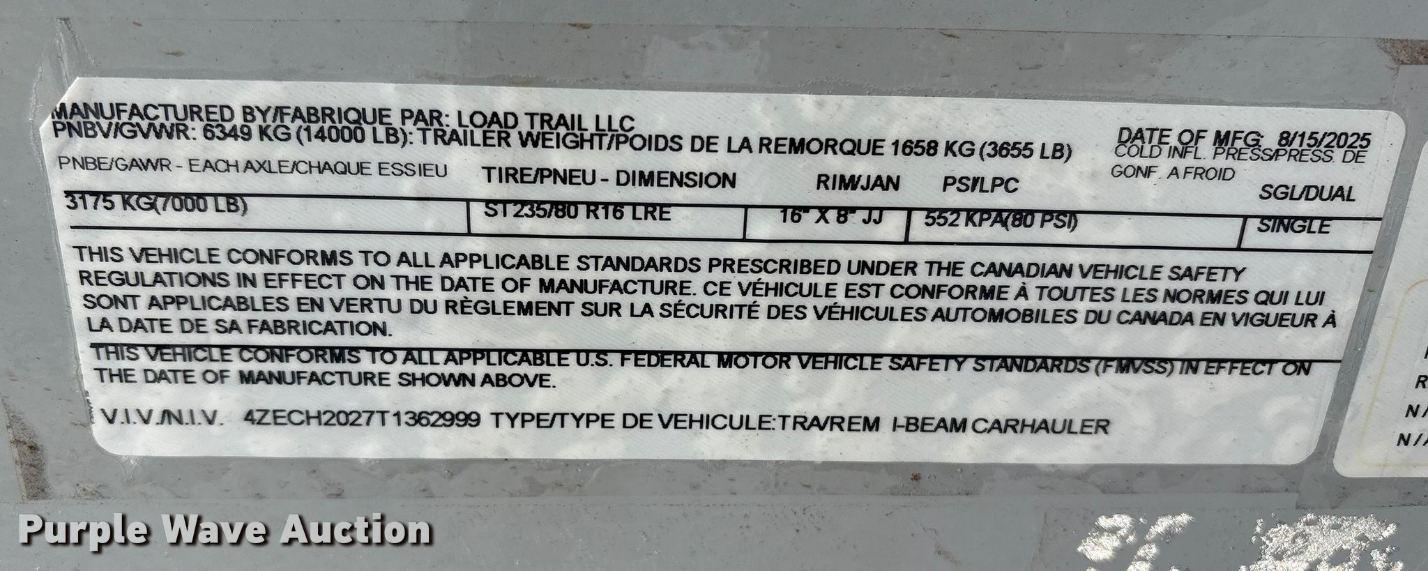 2026 Load Trail I-Beam equipment trailer. VIN: 4ZECH2027T1362999. Dimensions Overall Length: 25' 8", Width: 101", Deck Length: 20', Width: 83", Tail length: 2', Ramps: Manual Length: 62". Features Deck type: Wood. Chassis Ball hitch: 2 5/16", Landing gear: Single, Suspension: Spring, Brakes: Electric, Axles: Tandem, GVWR: 14,000 lbs. Tires Steel wheels, Size: 235/80R16. Notes Welding defects. Seller is a Connecticut licensed motor vehicle dealer. The buyer may be required to pay sales tax and/or registration fees to the dealer prior to taking possession. Buyers may be required to provide identification to the licensed dealer to comply with state laws. Manufacturer's Certificate of Origin will be assigned and distributed by the dealer. Please contact the seller for distribution questions. Harwinton, CT 06791