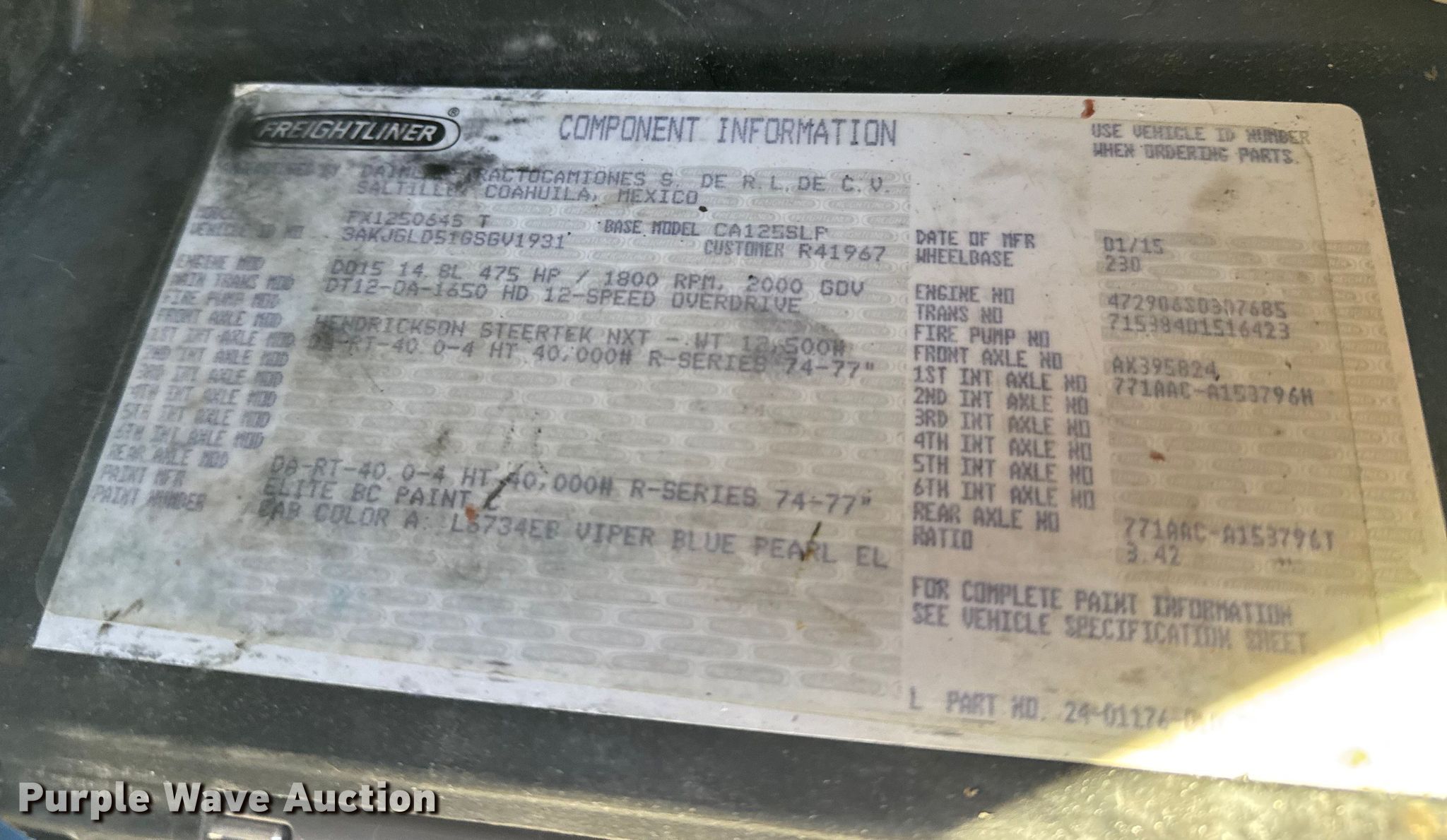 2016 Freightliner Cascadia semi truck. Miles: Unknown, VIN: 3AKJGLD51GSGV1931. Engine Detroit Diesel DD15, Serial: 472906S0307685, Displacement: 14.8L, Cylinders: 6, Fuel type: Diesel, HP: 475, Engine brake. Transmission Automated manual. Chassis Axles: Tandem, Differential lock: Inter-axle, Suspension: Air Dump valves, Brakes: Air, GVWR: 52,350 lbs FAWR: 12,350 lbs, IAWR: 20,000 lbs, RAWR: 20,000 lbs. Interior AC, Heat, Heated mirrors, Power windows, Power locks, Cruise control, Air ride cab, Sleeper Sleeper length: 60", Beds: Single. Features Deck plate: Aluminum, Fifth wheel type: Air operated, Sliding, Fuel tank: Dual. Tires Front: 11R22.5, Rear: 295/75R22.5. Notes Dead battery, Seats missing, Non-operational engine , Non-operational unit, Unit must be towed or hauled. Kansas title. Mileage has not been verified. Odometer discrepancy will be marked on the title. Title distribution may be delayed up to 14 days from verification of funds. Russell, KS 67665