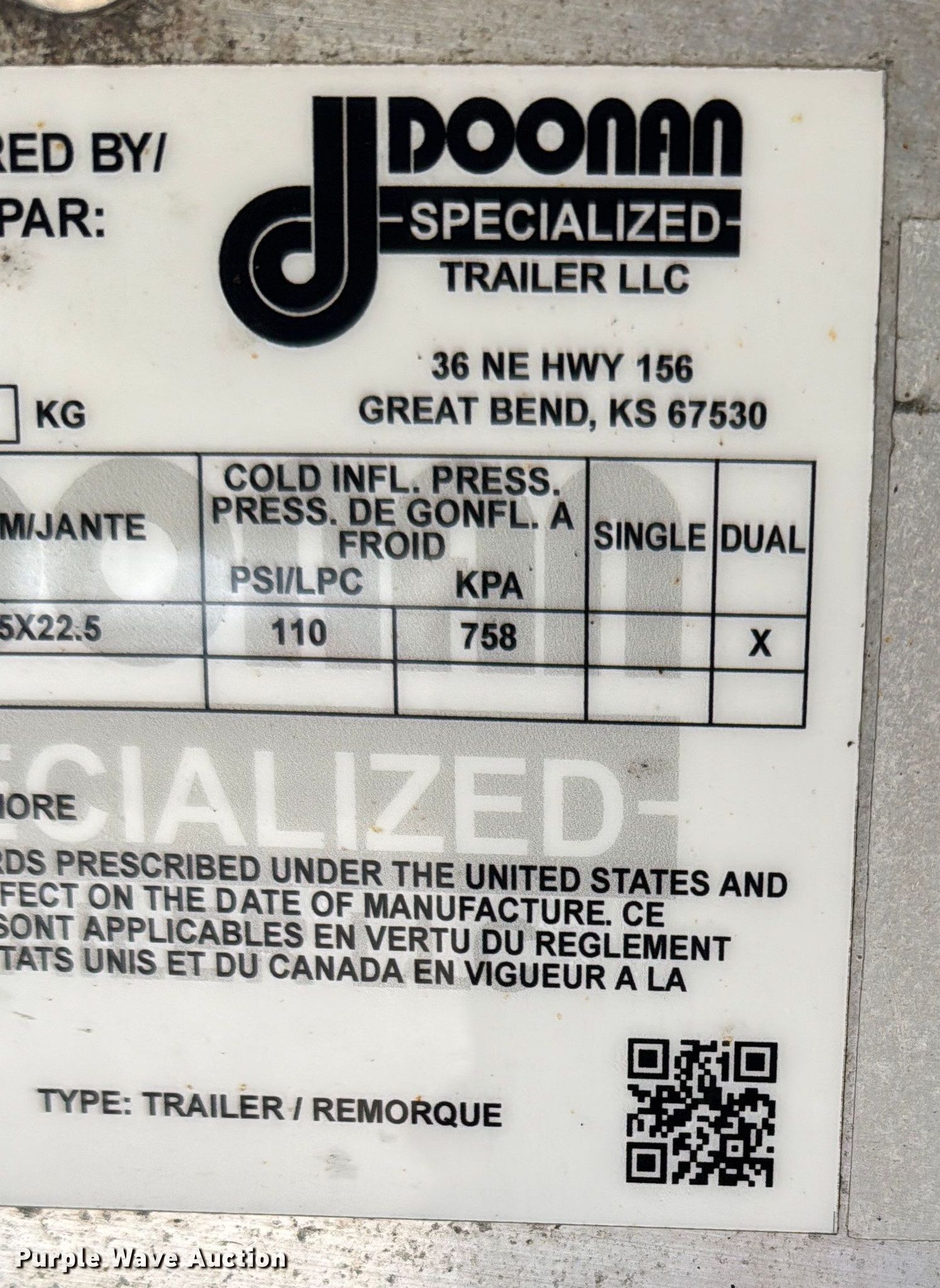 2021 Doonan flatbed trailer. VIN: 1D9BV5326M1609160. Dimensions Overall Length: 53', Width: 102", Deck Length: 53', Width: 96". Features Deck type: Aluminum, Wood. Chassis Landing gear: Dual, Suspension: Air, Brakes: Air, Axles: Spread, GVWR: 90,000 lbs. Tires Aluminum wheels, Size: 295/75R22.5. Kansas title. Title distribution may be delayed up to 14 days from verification of funds. Great Plains Trucking Inc.. Salina, KS 67401