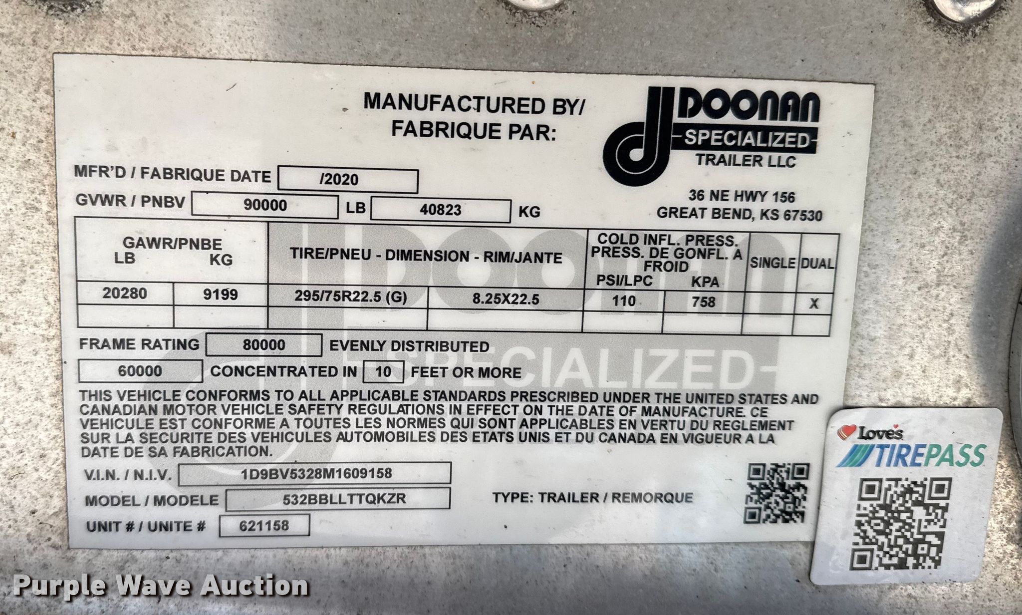 2021 Doonan flatbed trailer. VIN: 1D9BV5328M1609158. Dimensions Overall Length: 53', Width: 102", Deck Length: 53' 96". Features Deck type: Aluminum, Wood. Chassis Landing gear: Dual, Suspension: Air, Brakes: Air, Axles: Spread, GVWR: 90,000 lbs. Tires Aluminum wheels, Size: 295/75R22.5. Kansas title. Title distribution may be delayed up to 14 days from verification of funds. Great Plains Trucking Inc.. Salina, KS 67401