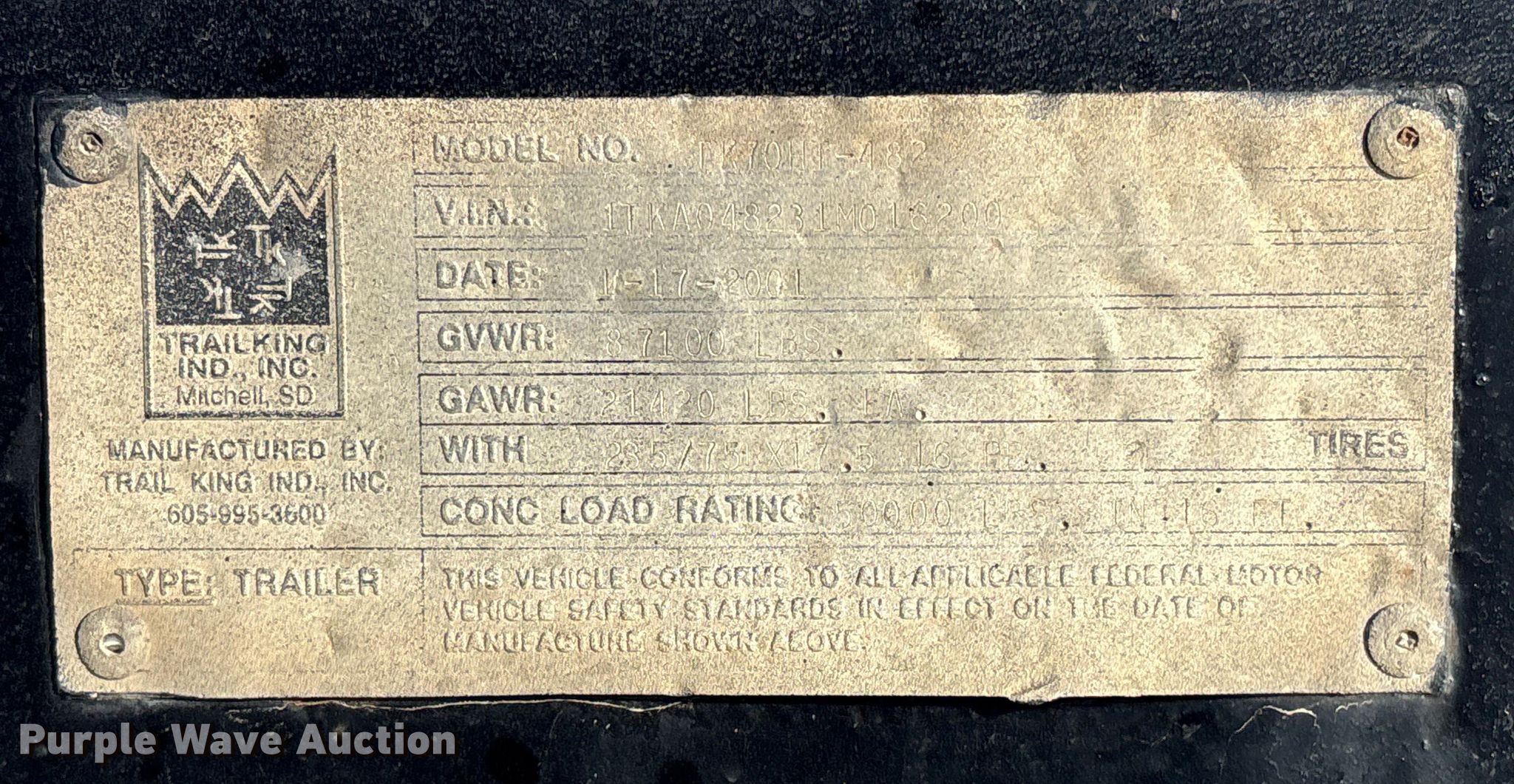 Purple Wave is selling a used Equip. Trailer in Oklahoma. This item is a 2001 Trail King TK70HT-482 Equipment Trailer with the following: VIN: 1TK?048231M016200