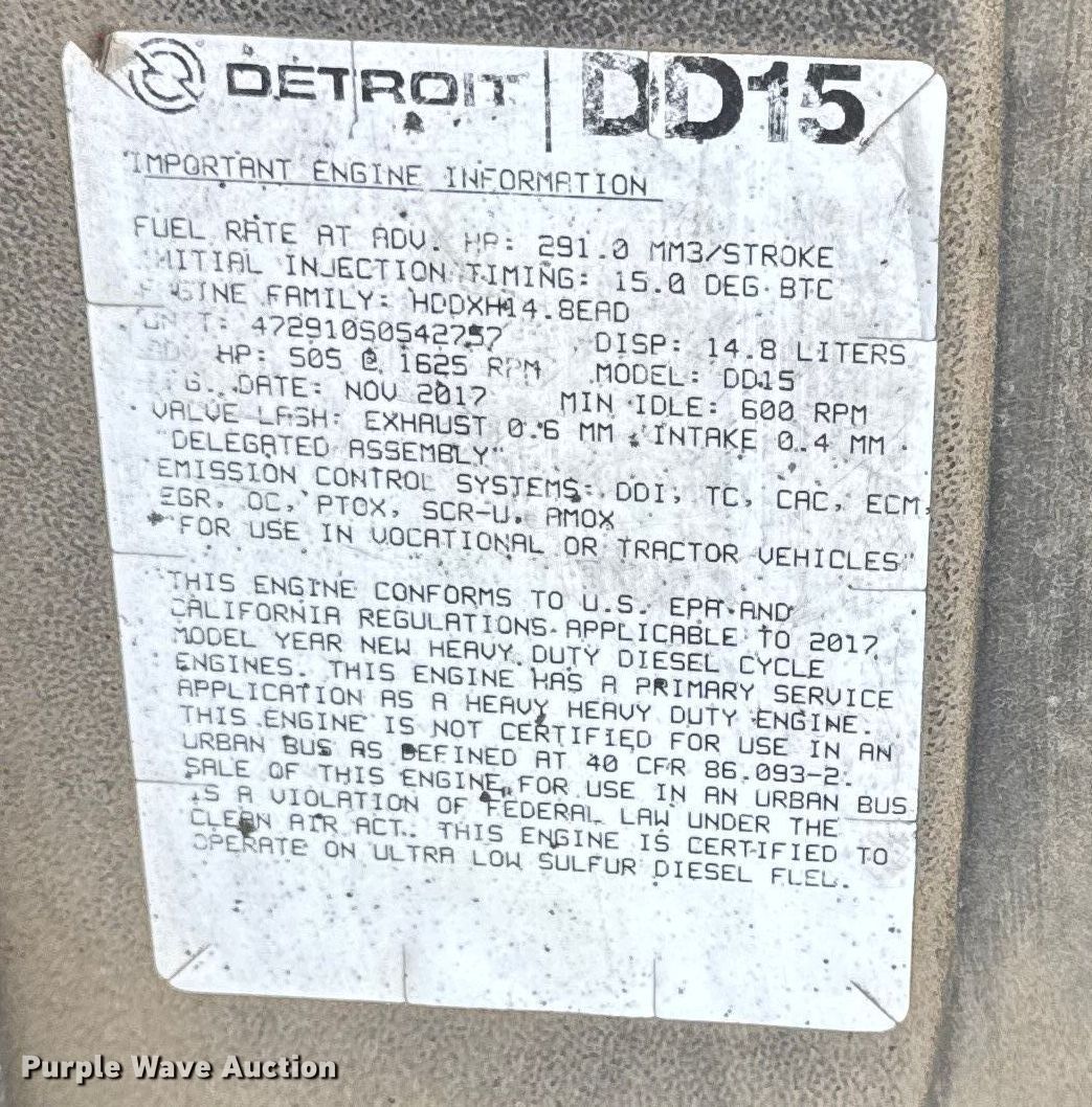 2018 Freightliner Cascadia semi truck. Miles: 839,313 on odometer, Hours: 30,328 on meter, VIN: 3AKJHHDR0JSJN4936, Unit #: 94699585. Engine Detroit Diesel DD15, Displacement: 14.8L, Cylinders: 6, Fuel type: Diesel, Engine brake. Transmission Automated manual. Chassis Axles: Tandem, Differential lock: Inter-axle, Suspension: Air Dump valves, Brakes: Air, GVWR: 52,350 lbs FAWR: 12,350 lbs, IAWR: 20,000 lbs, RAWR: 20,000 lbs. Interior AC, Heat, Heated mirrors, Power windows, Cruise control, Air ride cab, Sleeper Sleeper length: 72", Beds: Double bunk, Rear climate control. Features Deck plate: Aluminum, Fifth wheel type: Air operated, Sliding, Fuel tank: Dual. Tires Size: 295/75R22.5. Notes Dash warning indicator: Check engine, Windshield chipped or cracked, Possible engine issues, white smoke. Repossessed item, stored at a secured facility. Please review REQUIRED REMOVAL INSTRUCTIONS. Titles will be distributed after confirmation of payment and removal. Indiana title. Title distribution may be delayed up to 30 days from verification of funds. Lender Owned. 641 Joliet Street. Dyer, IN 46311