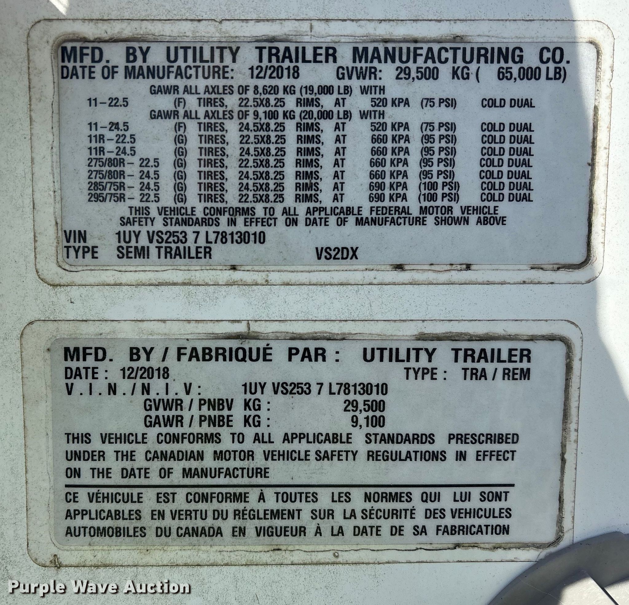 2020 Utility VS2DX dry van trailer. VIN: 1UYVS2537L7813010, Unit #: 96294375. Dimensions Overall Length: 53', Width: 8' 6". Features Deck type: Wood, E-track rail system. Chassis Landing gear: Dual, Suspension: Air, Brakes: Air, Axles: Tandem Sliding, GVWR: 65,000 lbs. Tires Steel wheels, Size: 295/75R22.5. Repossessed item, stored at a secured facility. Please review REQUIRED REMOVAL INSTRUCTIONS. Titles will be distributed after confirmation of payment and removal. West Virginia title. Title distribution may be delayed up to 30 days from verification of funds. Lender Owned. 14600 Old Gentilly Road. New Orleans, LA 70129