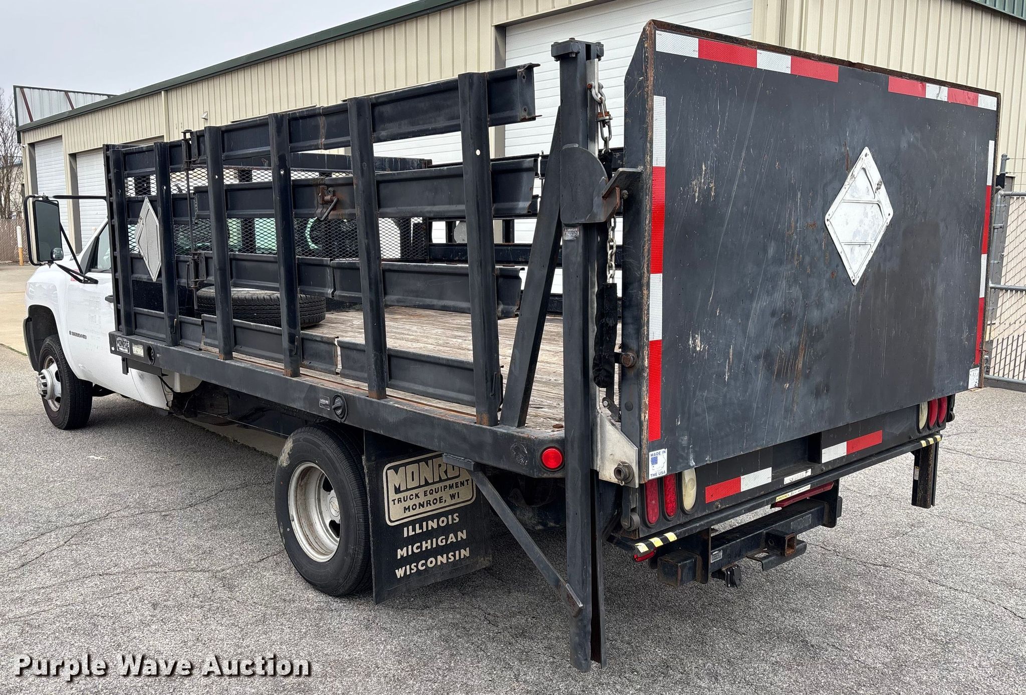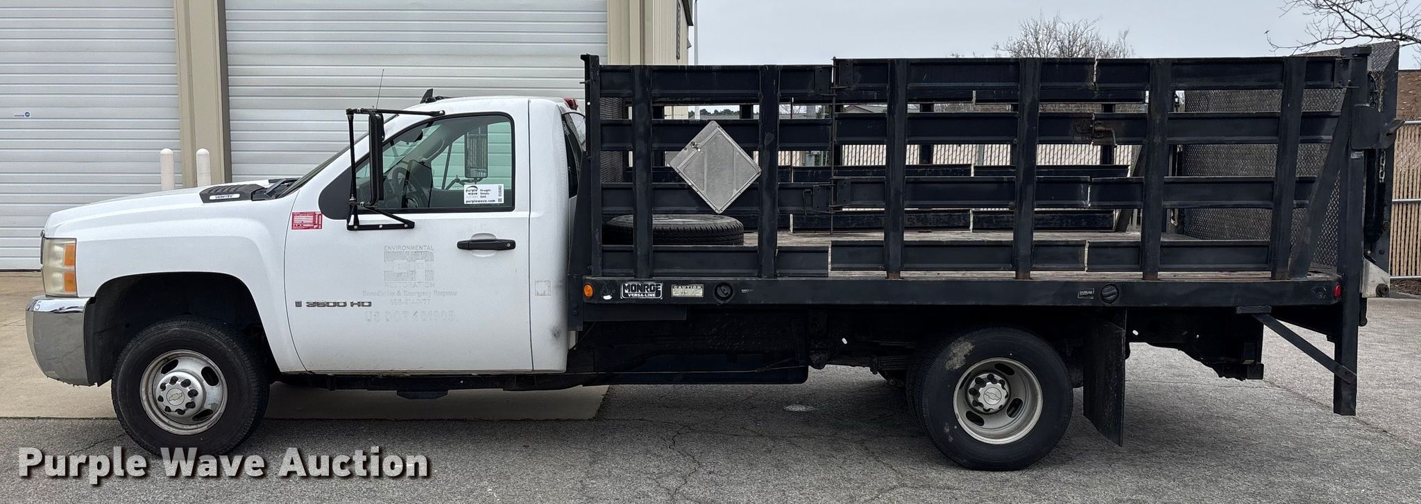 2007 Chevrolet Silverado 3500HD flatbed pickup truck. Miles: 144,067 on odometer, VIN: 1GBJC34K87E584884. Engine Displacement: 6.0L, Cylinders: 8, Fuel type: Gas. Transmission Automatic. Interior AC, Heat. Features Bed Flatbed, MONROE VERSA-LINE, Length: 12' 4", Width: 96", Tommy end gate lift Capacity: 1,600 lbs. Tires Size: LT215/85R16. Notes Dash warning indicator: Check engine. Missouri title. Title distribution may be delayed up to 14 days from verification of funds. Environmental Restoration, LLC. Garner, NC 27529