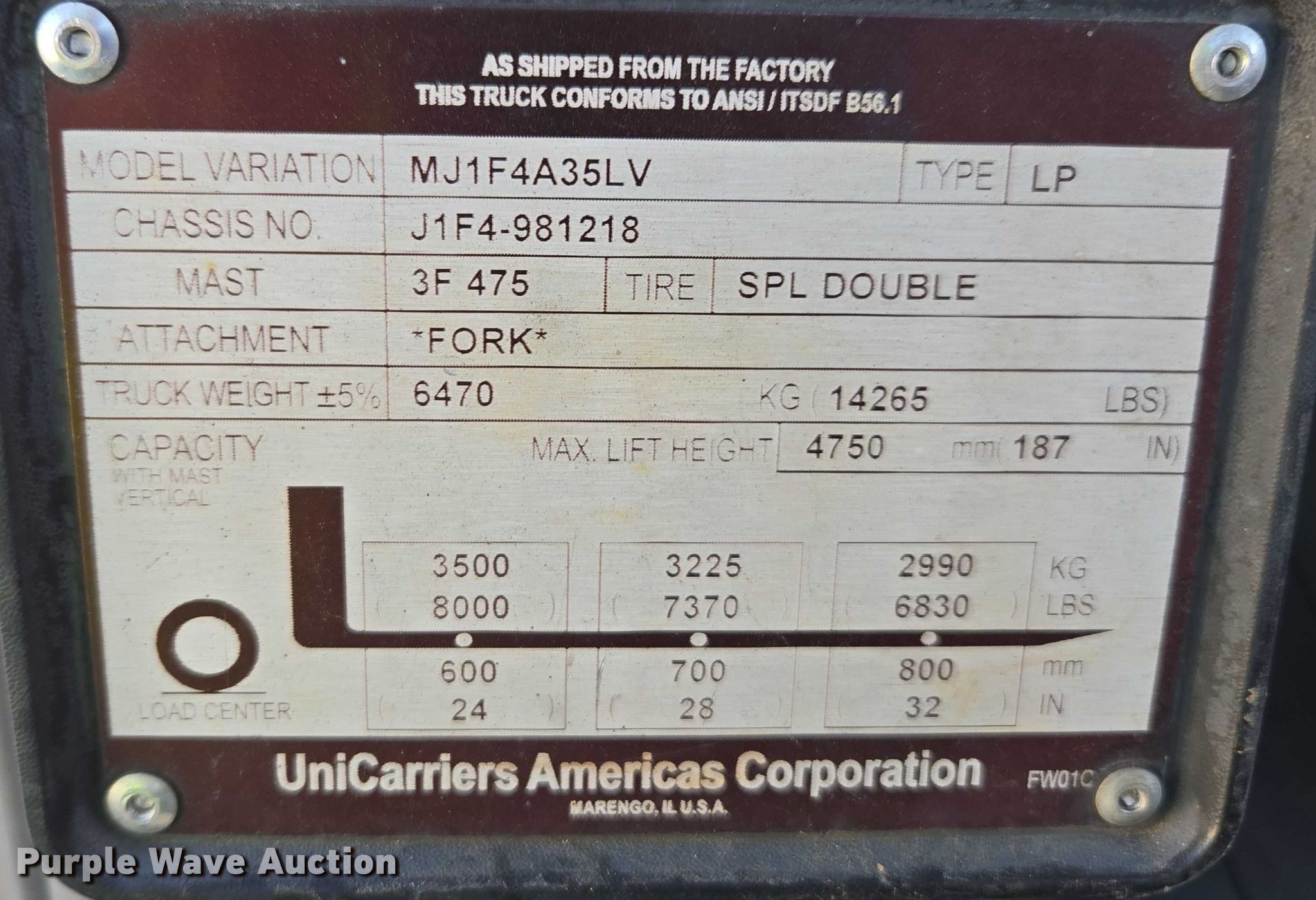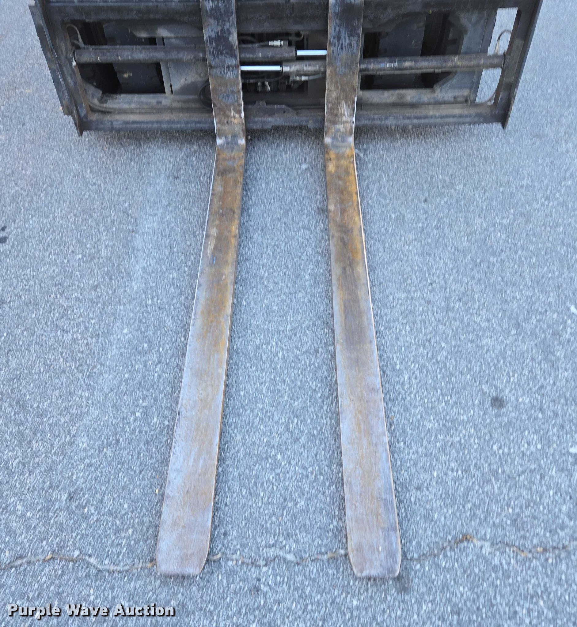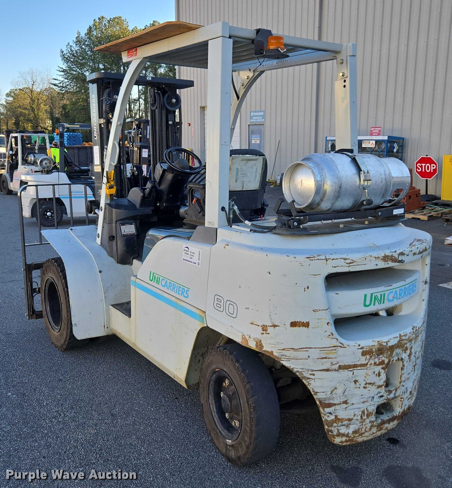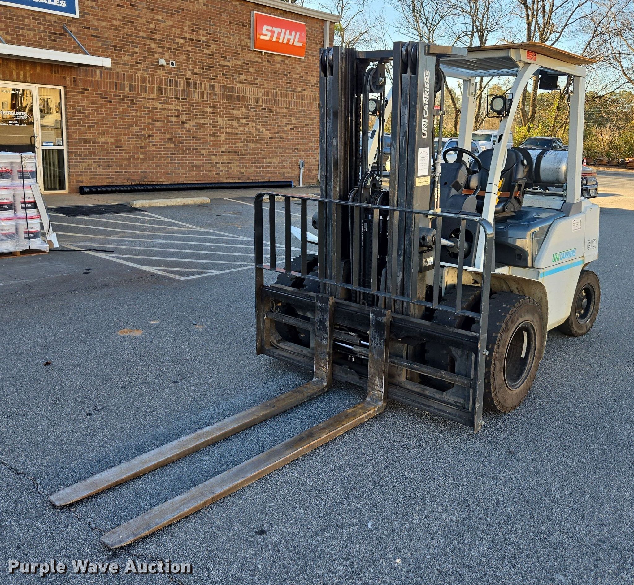 2016 UniCarriers PF80YLP forklift. Hours: 2,904 on meter, Miles or hours may vary, unit still in use, Serial: J1F4-981218, Unit #: SFS2863. Engine GCT, Displacement: 4.5L, Cylinders: 6, Fuel type: LPG LP bottle: Not included. Transmission Automatic. Operators station OROPS. Features Maximum lift capacity: 8,000 lbs, Maximum lift height: 187", Collapsed mast height: 89", Mast stages: 3, Side shift, Mast tilt, Fork positioner, Fork length: 72". Tires Front: 8.25-15, Rear: 7.00-12, Solid. Notes Warning indicator: Master warning. Ferguson. Marietta, GA 30062