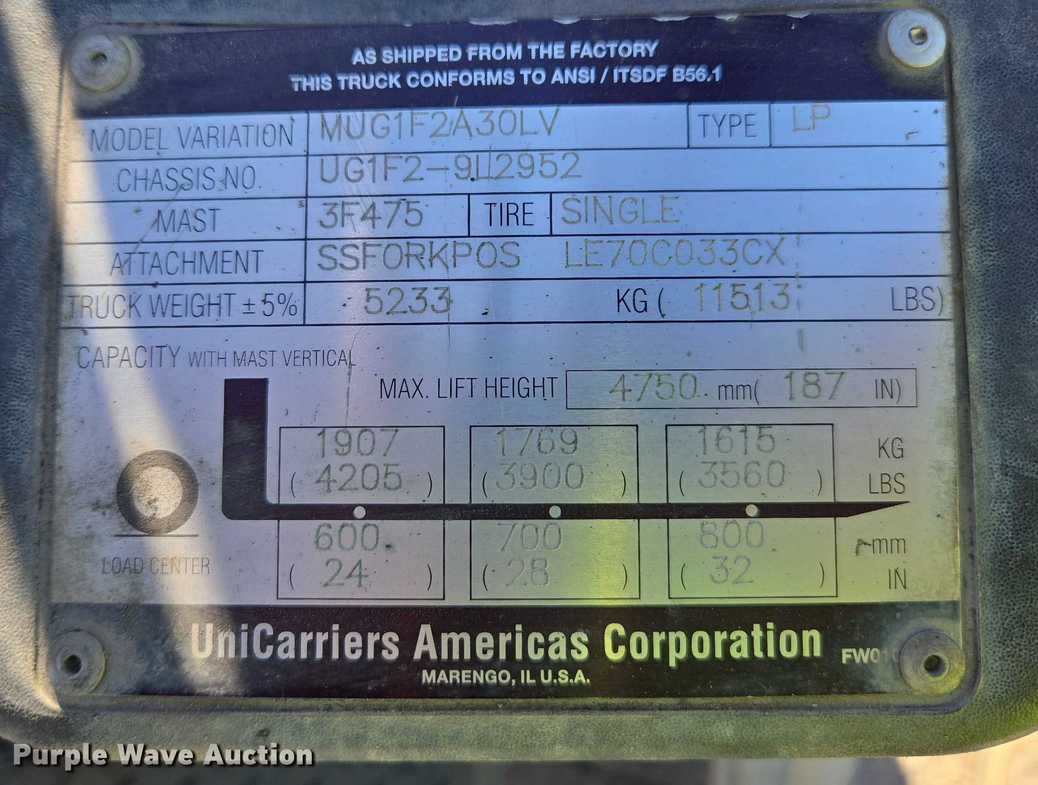 2013 Nissan PF60 forklift. Hours: 6,294 on meter, Serial: UG1F2-9L2952, Unit #: SFS2882. Engine Cylinders: 4, Fuel type: LPG LP bottle: Not included. Transmission Automatic. Operators station OROPS. Features Maximum lift capacity: 4,205 lbs, Maximum lift height: 187", Collapsed mast height: 89", Mast stages: 3, Side shift, Mast tilt, Fork positioner, Fork length: 41". Tires Front: 28x9-15, Rear: 6.50-10, Solid. Notes Warning indicator: Master warning. Ferguson. Macon, GA 31201