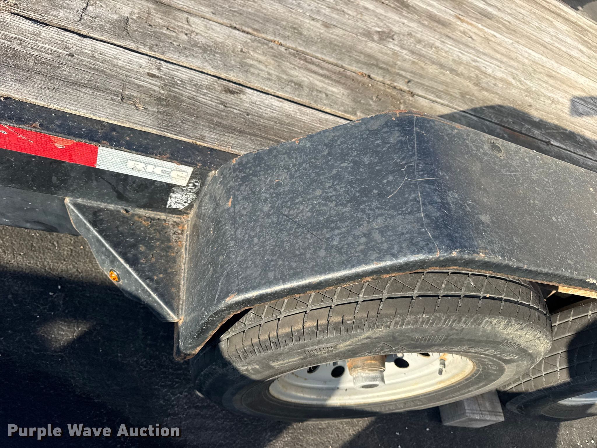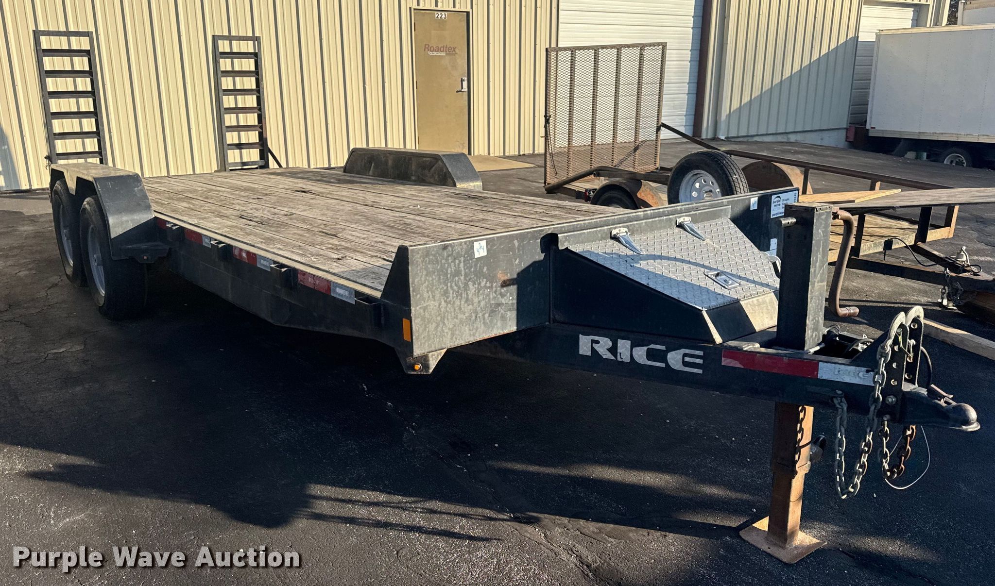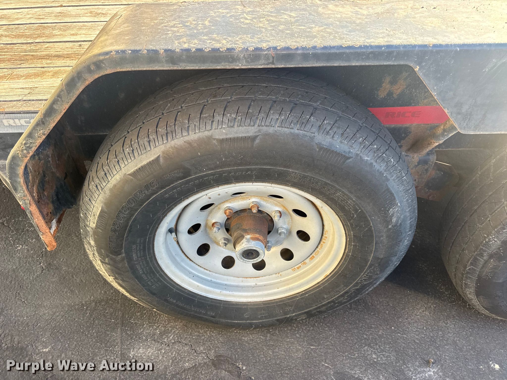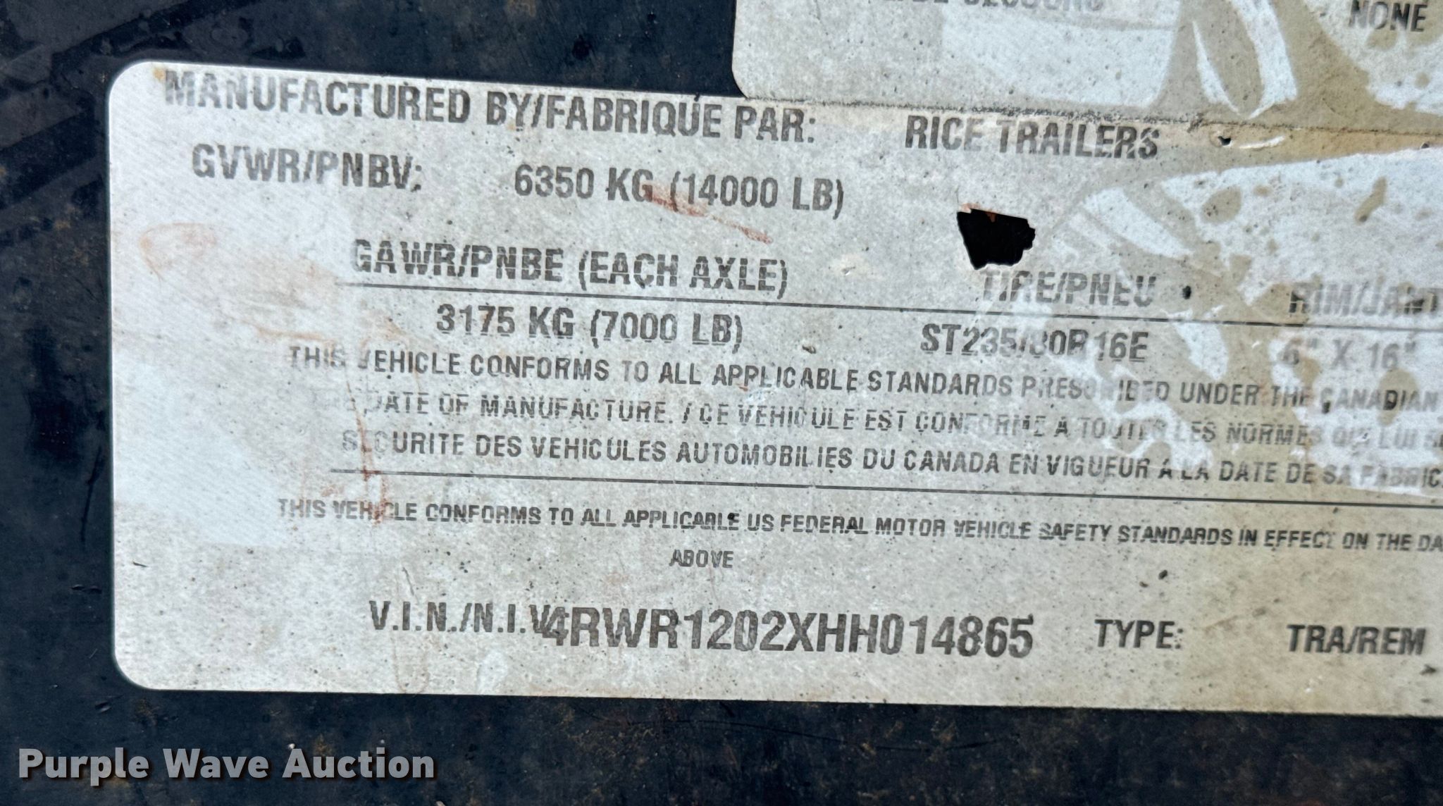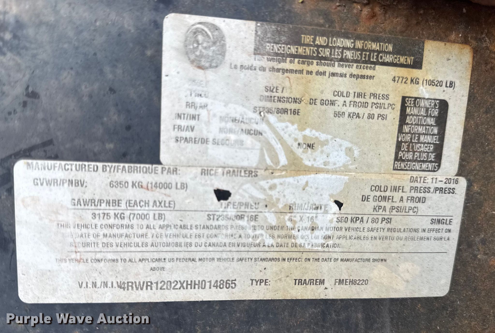 2017 Rice FMEH8220 equipment trailer. VIN: 4RWR1202XHH014865. Dimensions Overall Length: 25' 10", Width: 102", Deck Length: 18', Width: 82", Tail length: 25", Ramps: Manual Length: 51". Features Deck type: Wood. Chassis Ball hitch: 2 5/16", Landing gear: Single, Suspension: Spring, Brakes: Electric, Axles: Tandem, GVWR: 14,000 lbs, GAWR: 7,000 lbs. Tires Steel wheels, Size: ST235/80R16. Missouri title. Title distribution may be delayed up to 14 days from verification of funds. HTH Companies, Inc.. Union, MO 63084