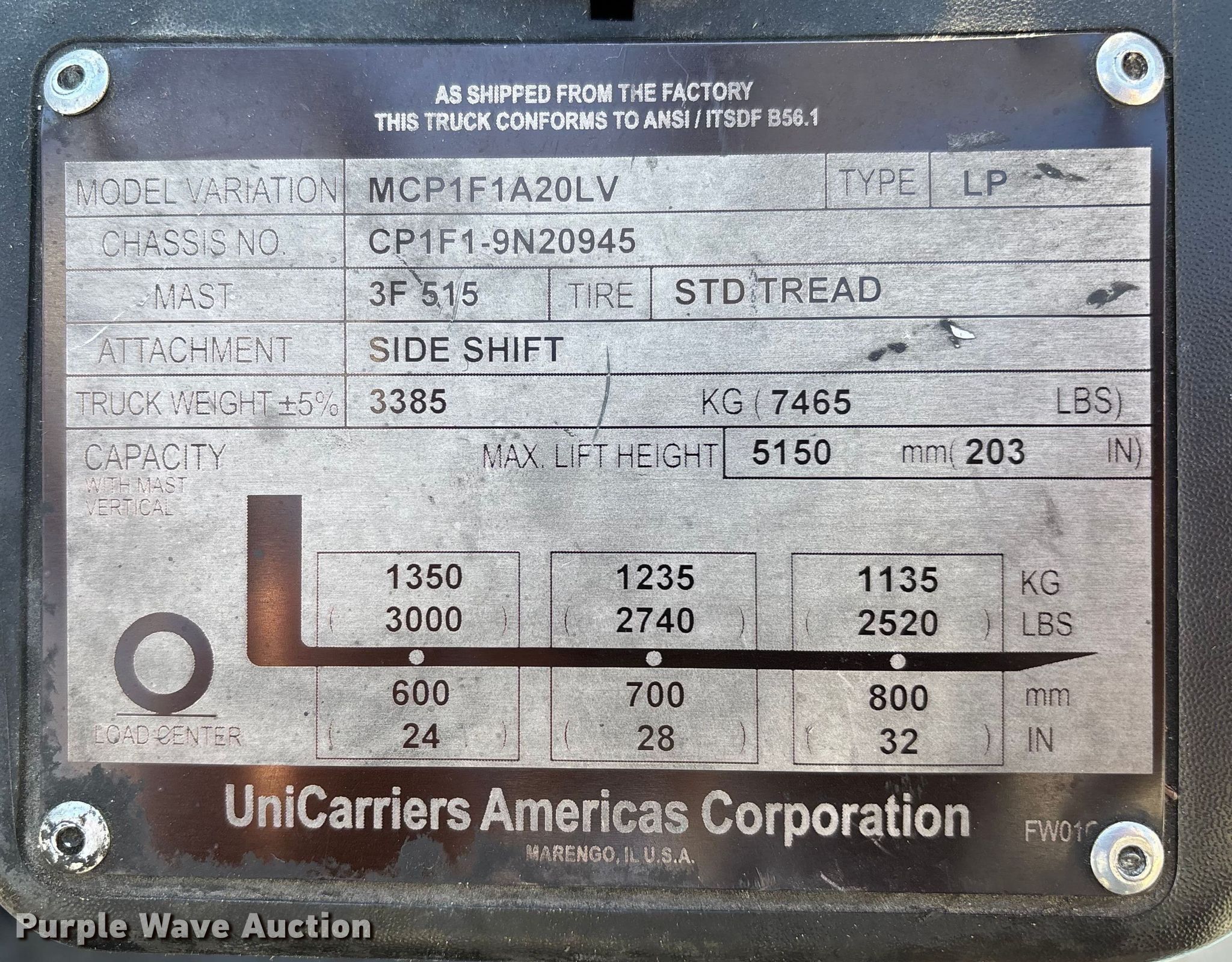 Purple Wave is selling a used Cushion Tire or Pneumatic Forklift in Texas. This item is a 2017 UniCarriers CFS40 forklift with the following: Hours: 4,567 on meter, Serial: CP1F1-9N20945, Unit #: SFS2884