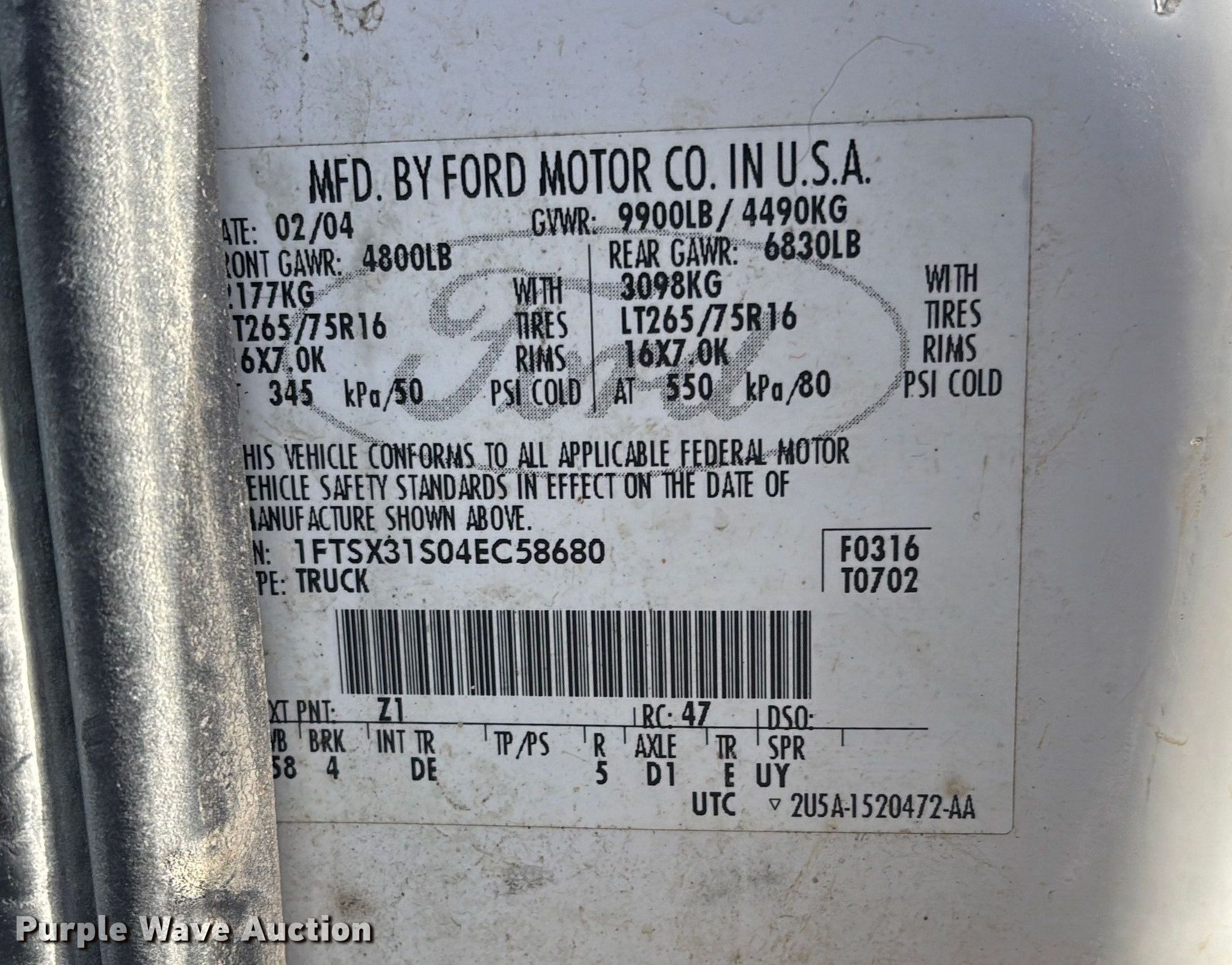 Purple Wave is selling a used 3/4 or 1 Ton Pickup or Van in Iowa. This item is a 2004 Ford F350 Super Duty Ext. Cab pickup truck with the following: Miles: 231,085 on odometer, VIN: 1FTSX31S04EC58680