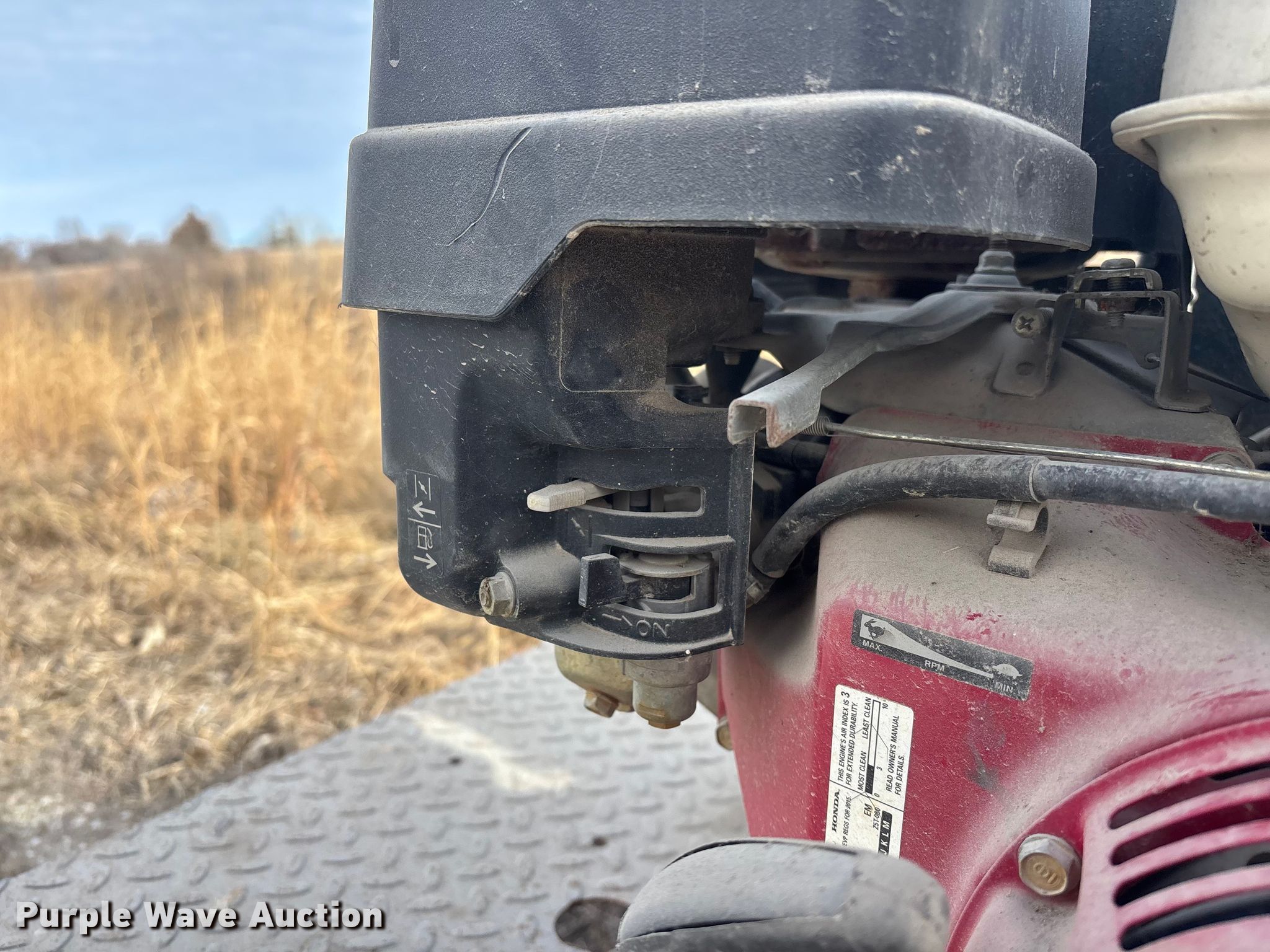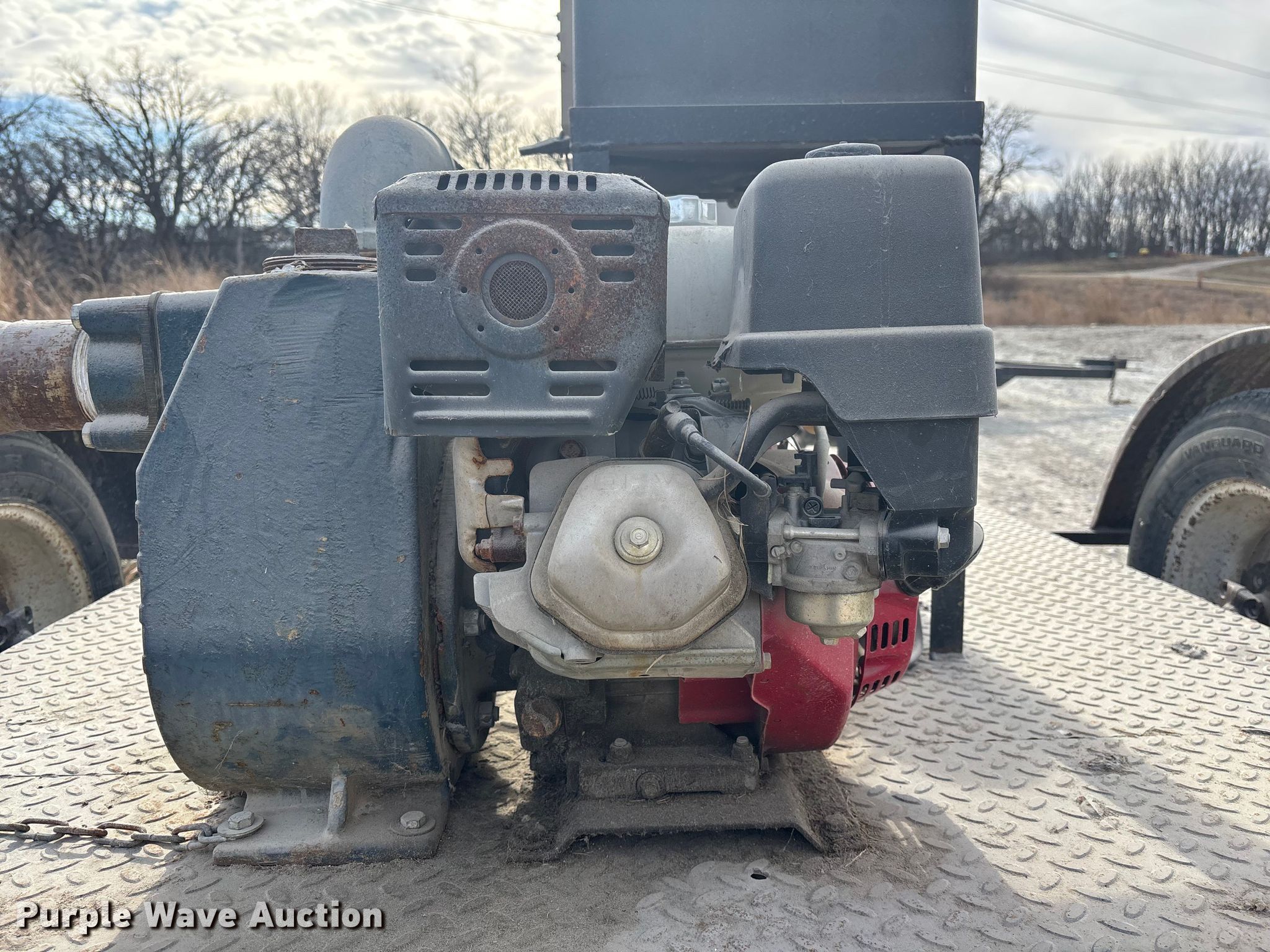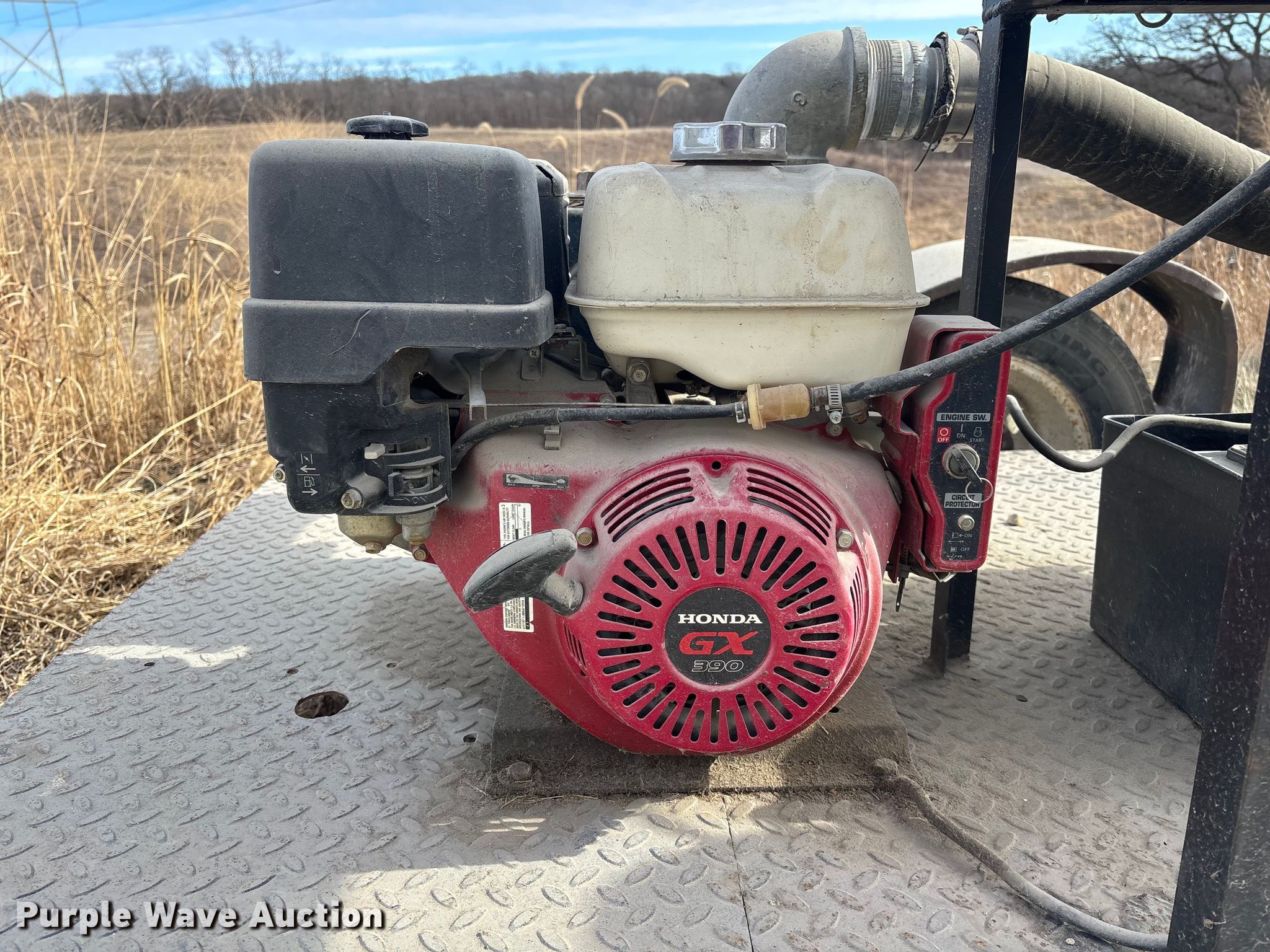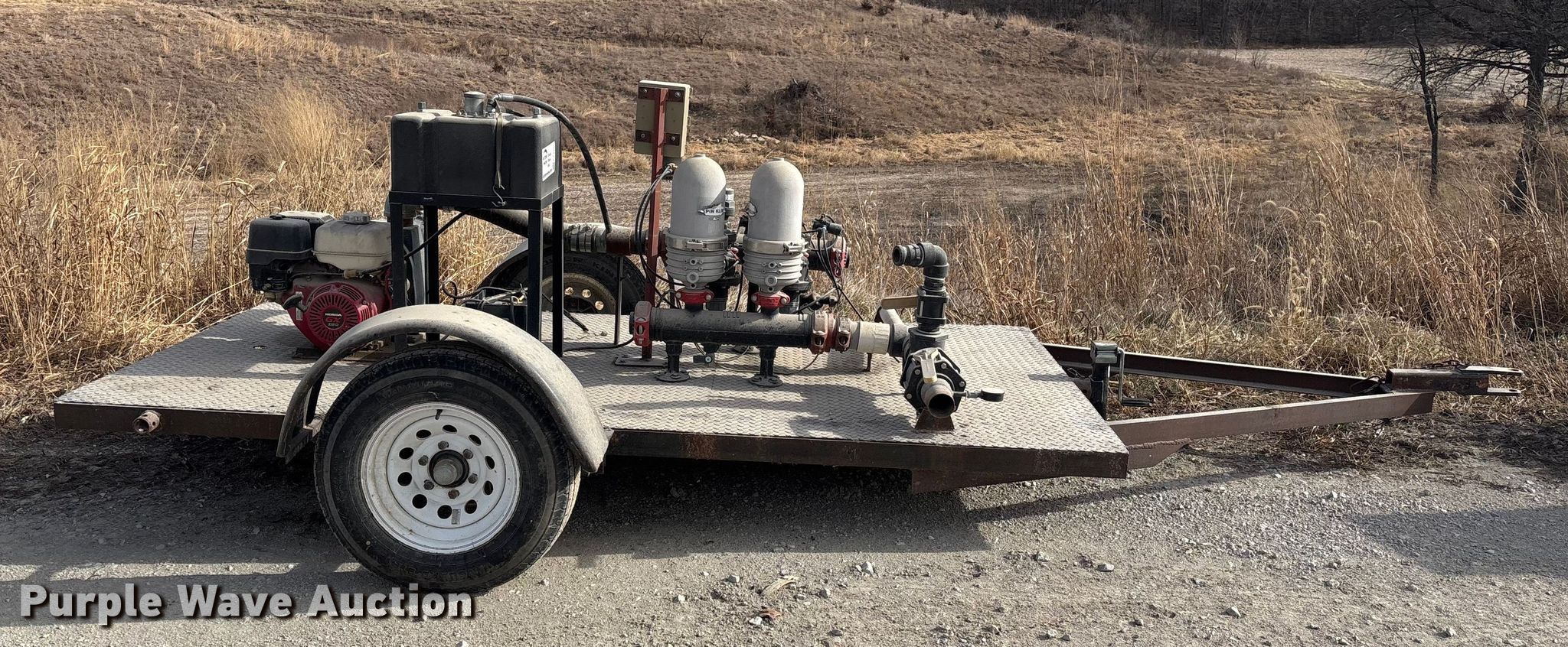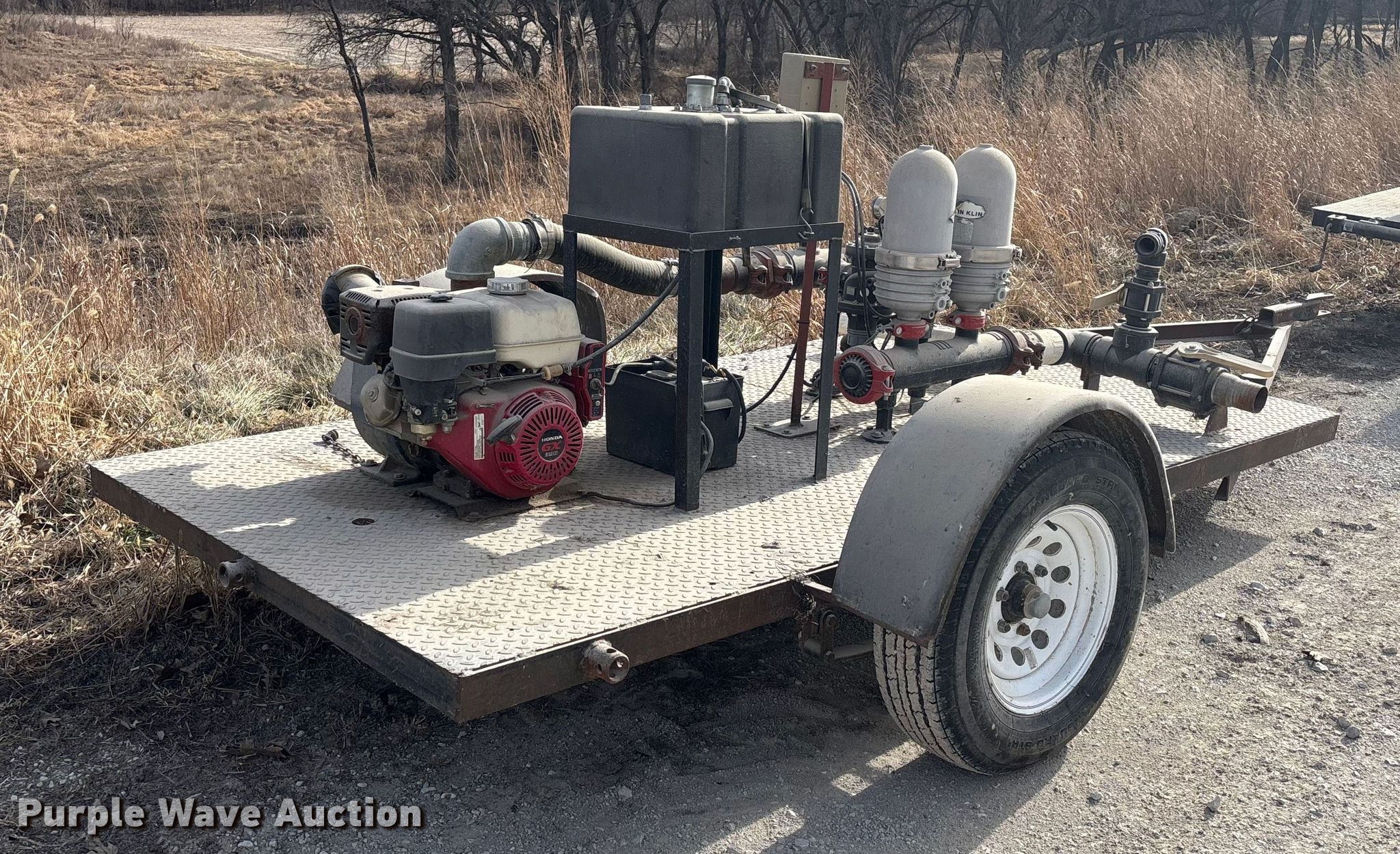 Shop built pump trailer. Dimensions. Overall Length: 176", Width: 84". Engine Honda GX390, Displacement: 389 cc, Cylinders: 1, Fuel type: Gas. Features Franklin Electric 9028113 pump Serial: 12G19-02-05007P, Arkal Filtration System Serial: 10050142. Tires Front: 205/75R15. Notes Dead battery, Unknown operating condition. Transfer of ownership documentation will be a bill of sale. ALLENDAN SEED CO. Winterset, IA 50273