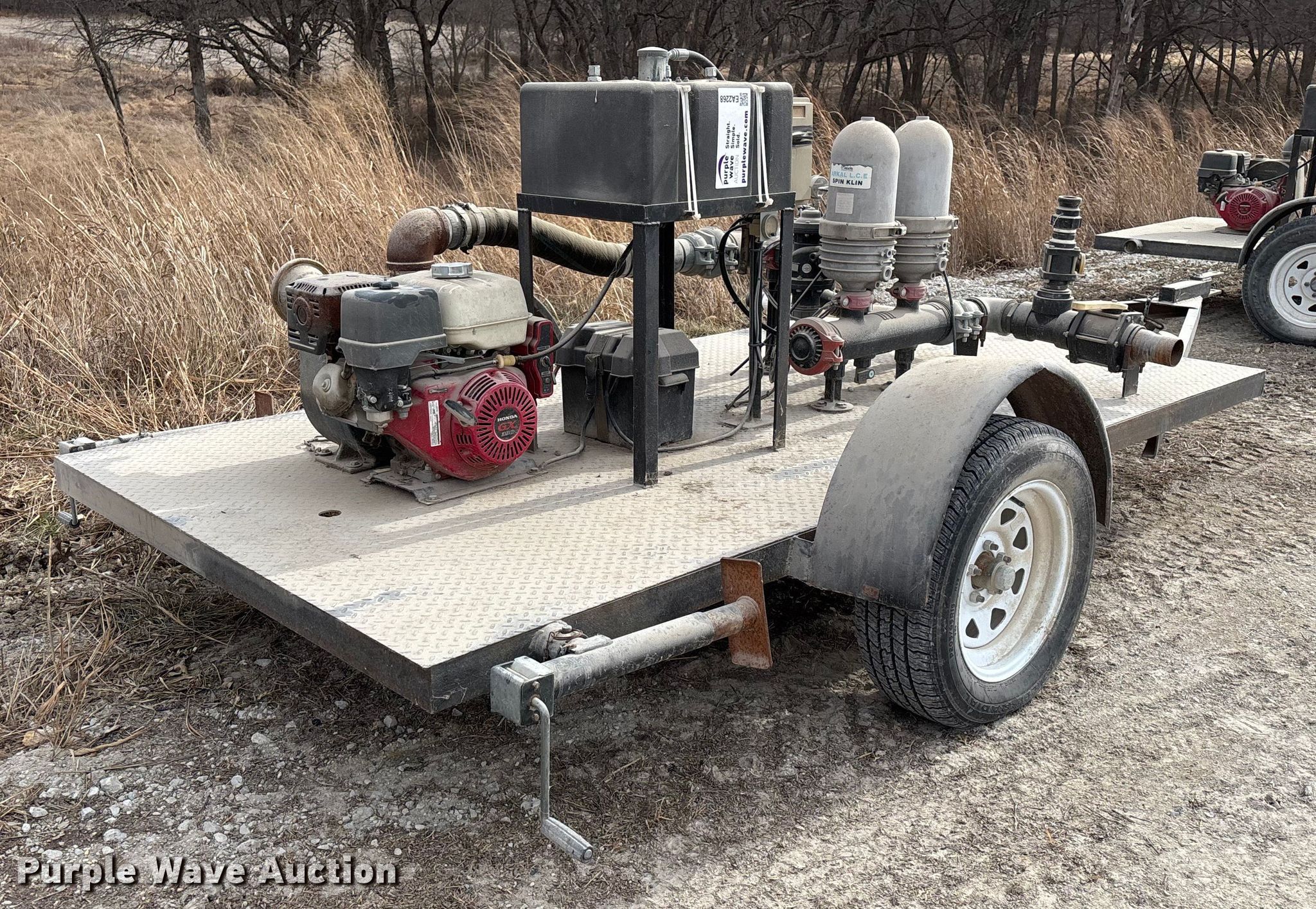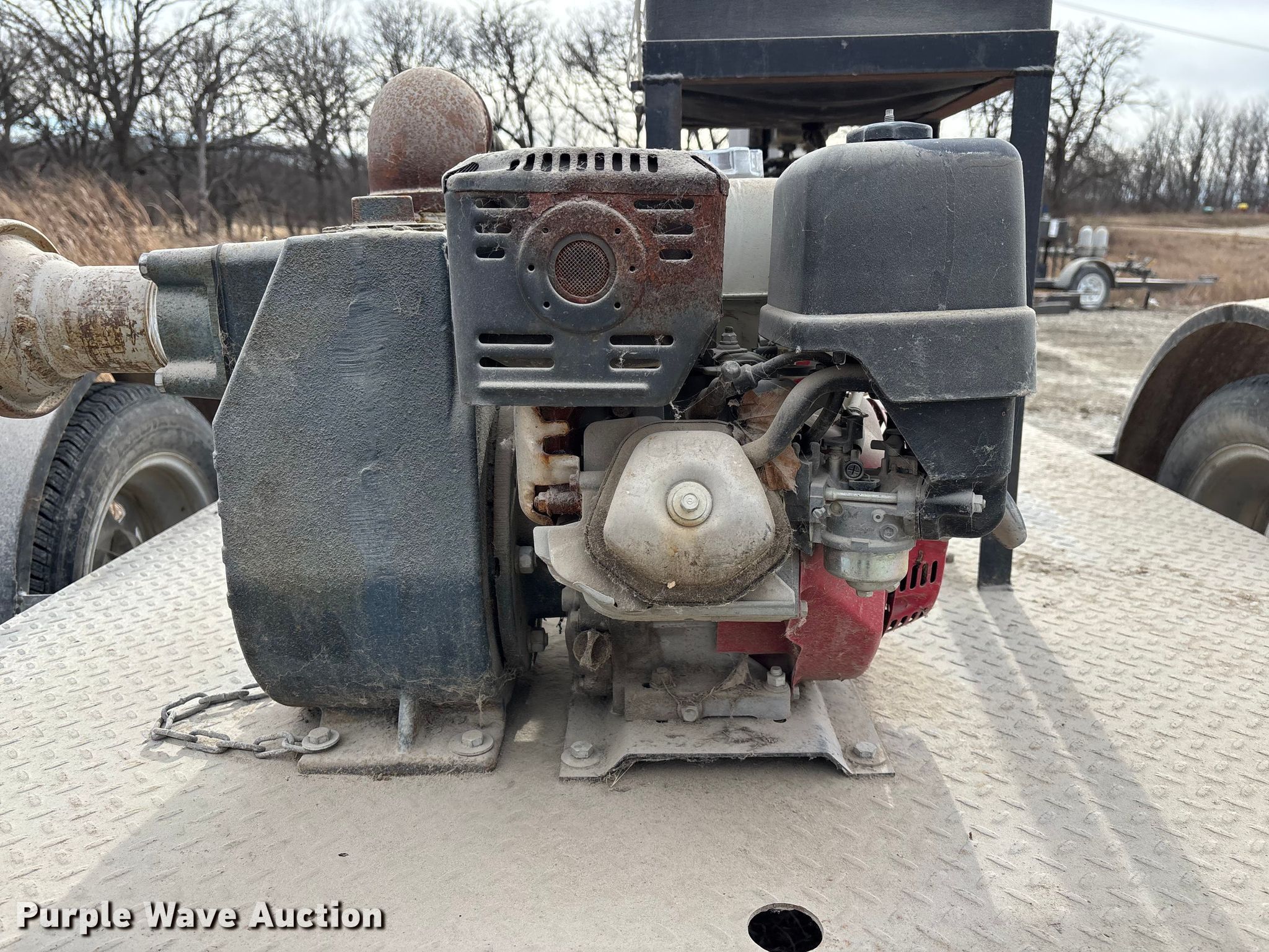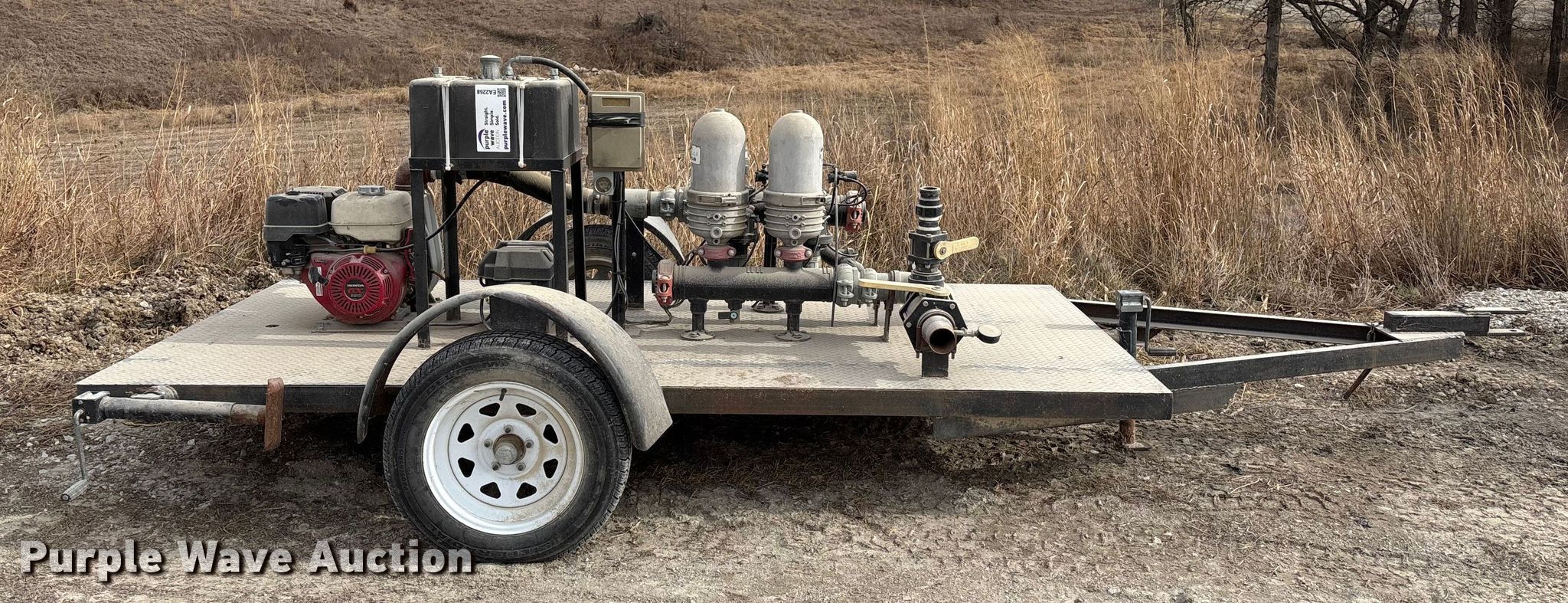 Shop built pump trailer. Dimensions. Overall Length: 177", Width: 84". Engine Honda GX390, Displacement: 389 cc, Cylinders: 1, Fuel type: Gas. Features Franklin Electric FMIG30-13H pump, Serial: 17E19-00023P, Arkal filtration system, Serial: 11060091. Notes Dead battery, Unknown operating condition. Transfer of ownership documentation will be a bill of sale. ALLENDAN SEED CO. Winterset, IA 50273