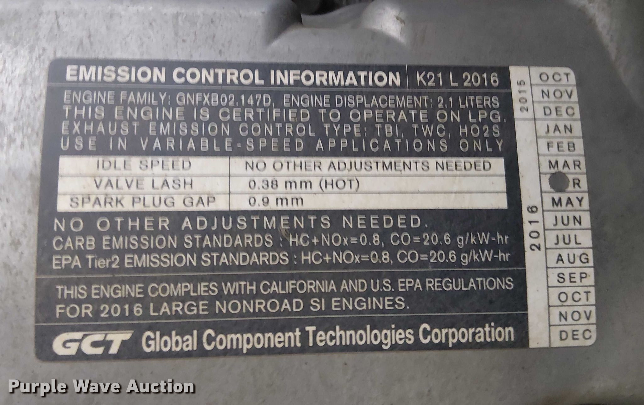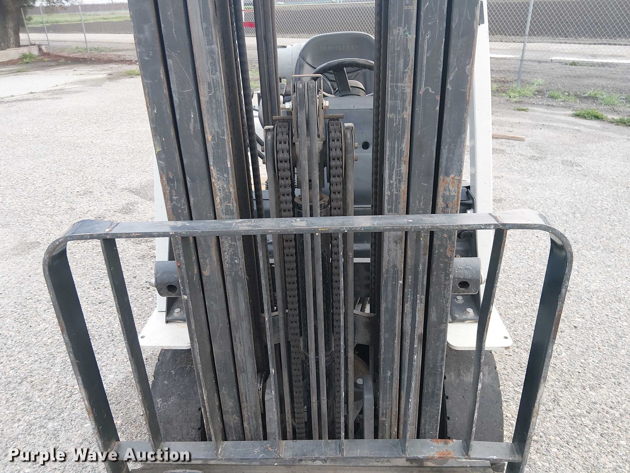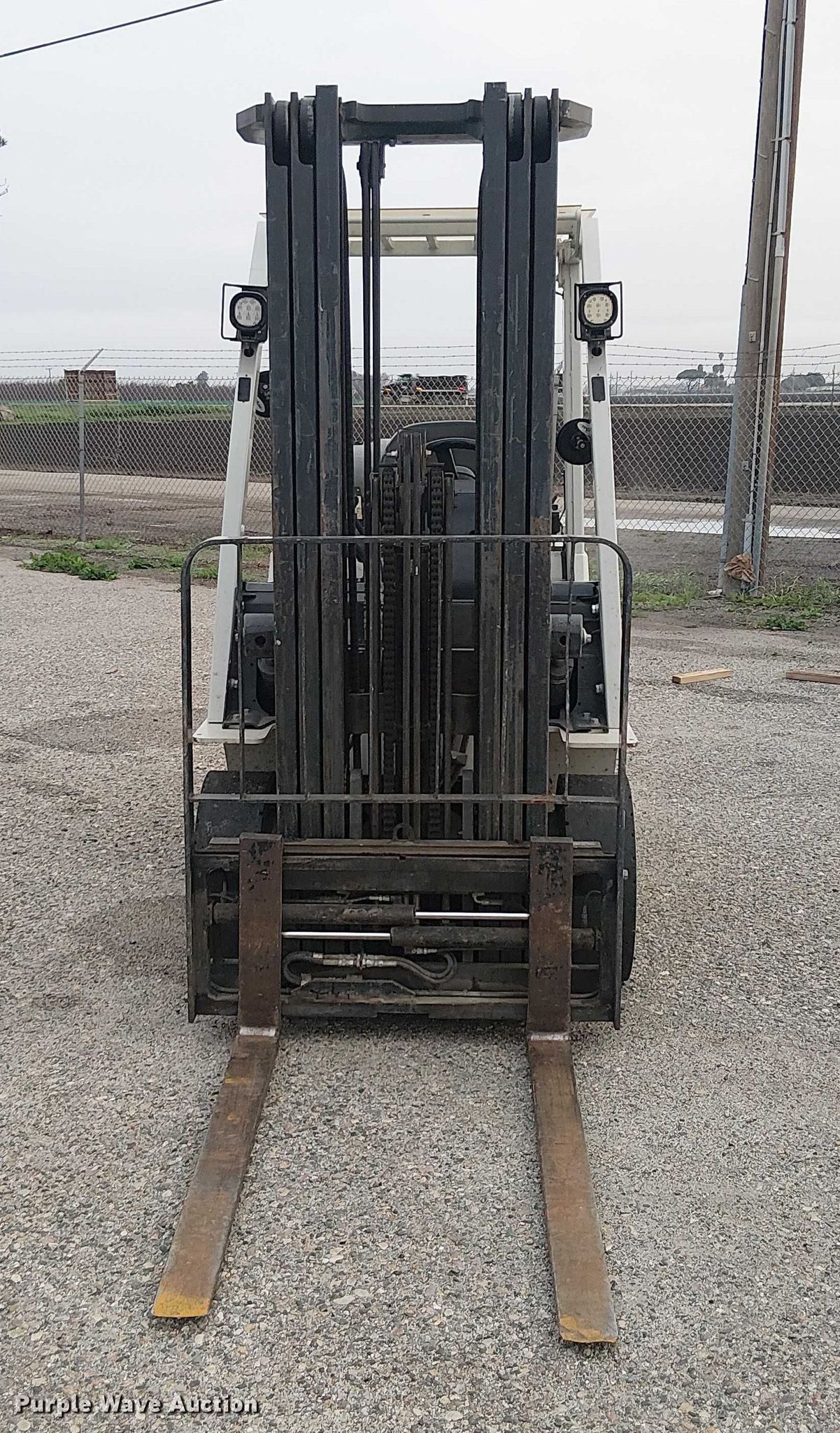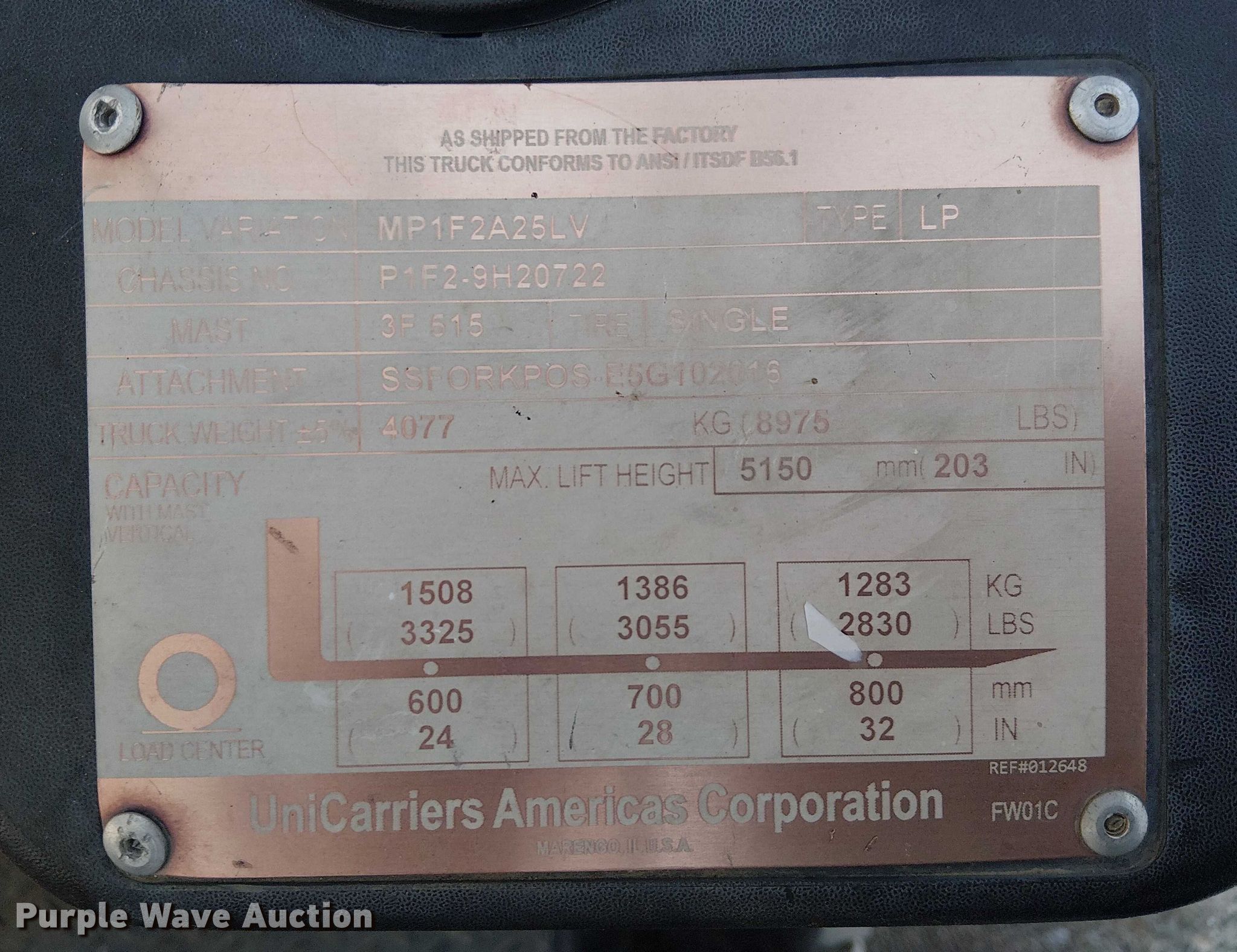 2016 UniCarriers PF50 forklift. Hours: 3,451 on meter, Miles or hours may vary, unit still in use, Serial: P1F2-9H20722, Unit #: SFS2808. Engine GCT K21L, Displacement: 2.1L, Cylinders: 4, Fuel type: LPG LP bottle: Not included. Transmission Automatic. Operators station OROPS, Canopy. Features Maximum lift capacity: 3,325 lbs, Maximum lift height: 203", Collapsed mast height: 88", Mast stages: 3, Side shift, Mast tilt, Fork positioner, Fork length: 46". Tires Front: 7.00-12, Rear: 6.00-9, Solid. Notes Warning indicator: Master warning. Ferguson. Hollister, CA 95023