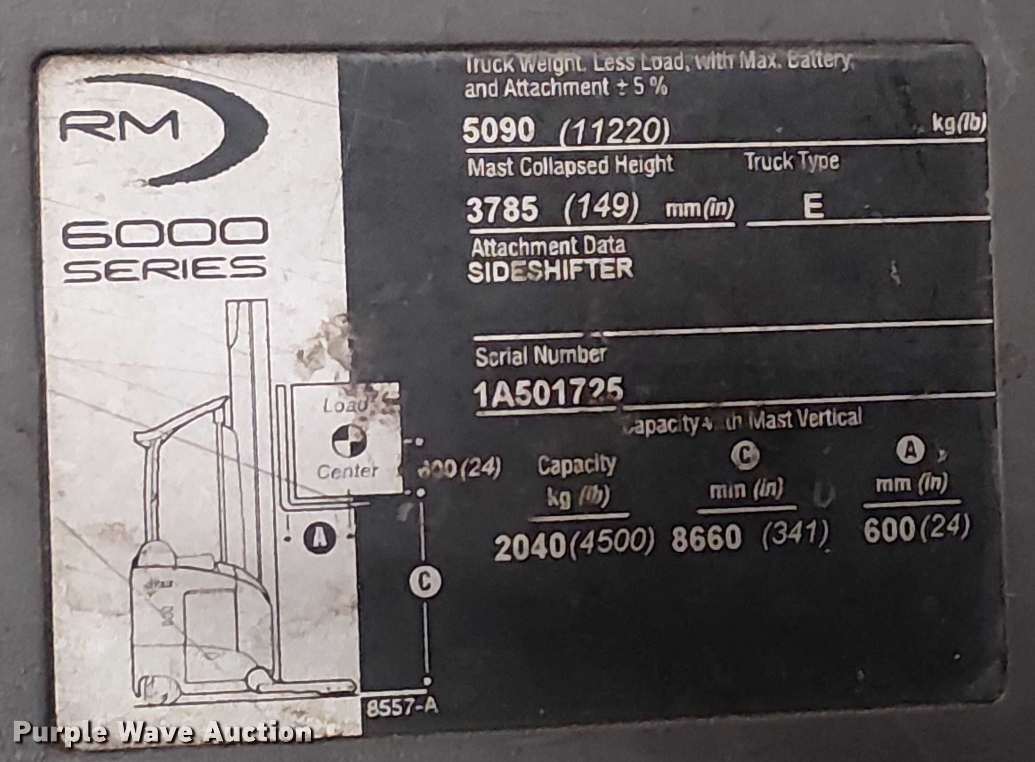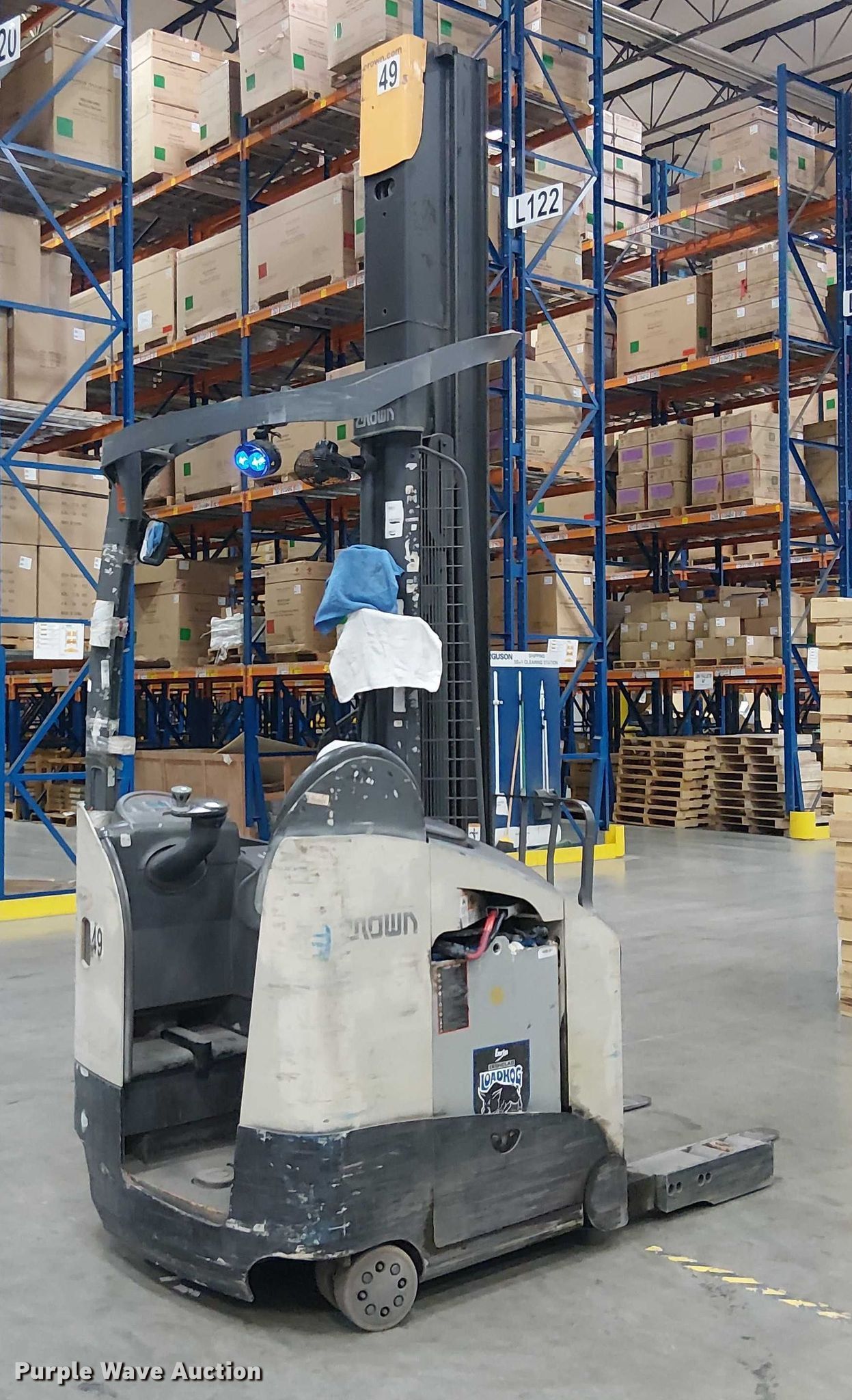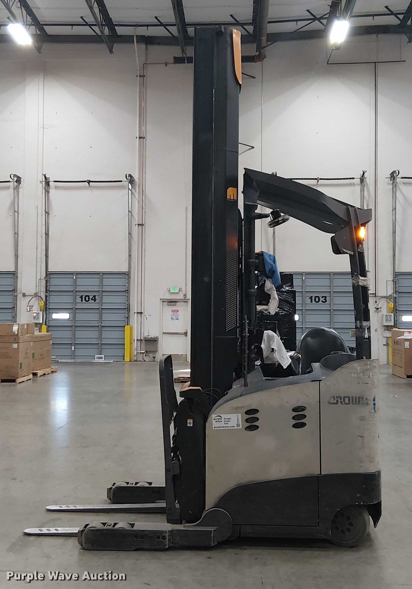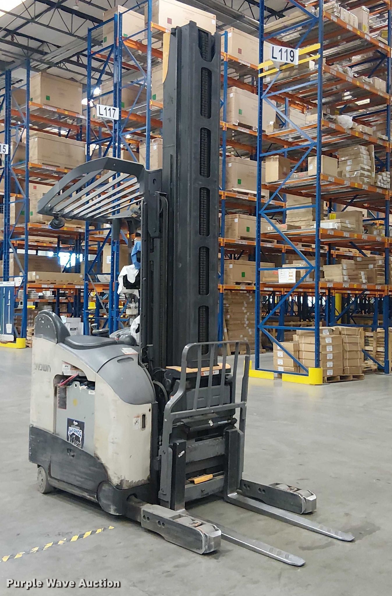 Purple Wave is selling a used Warehouse Forklift in California. This item is a 2017 Crown RM6095S-45 order picker with the following: Hours: 12,256 on meter, Miles or hours may vary, unit still in use, Serial: 1A501725, Unit #: SFS2838