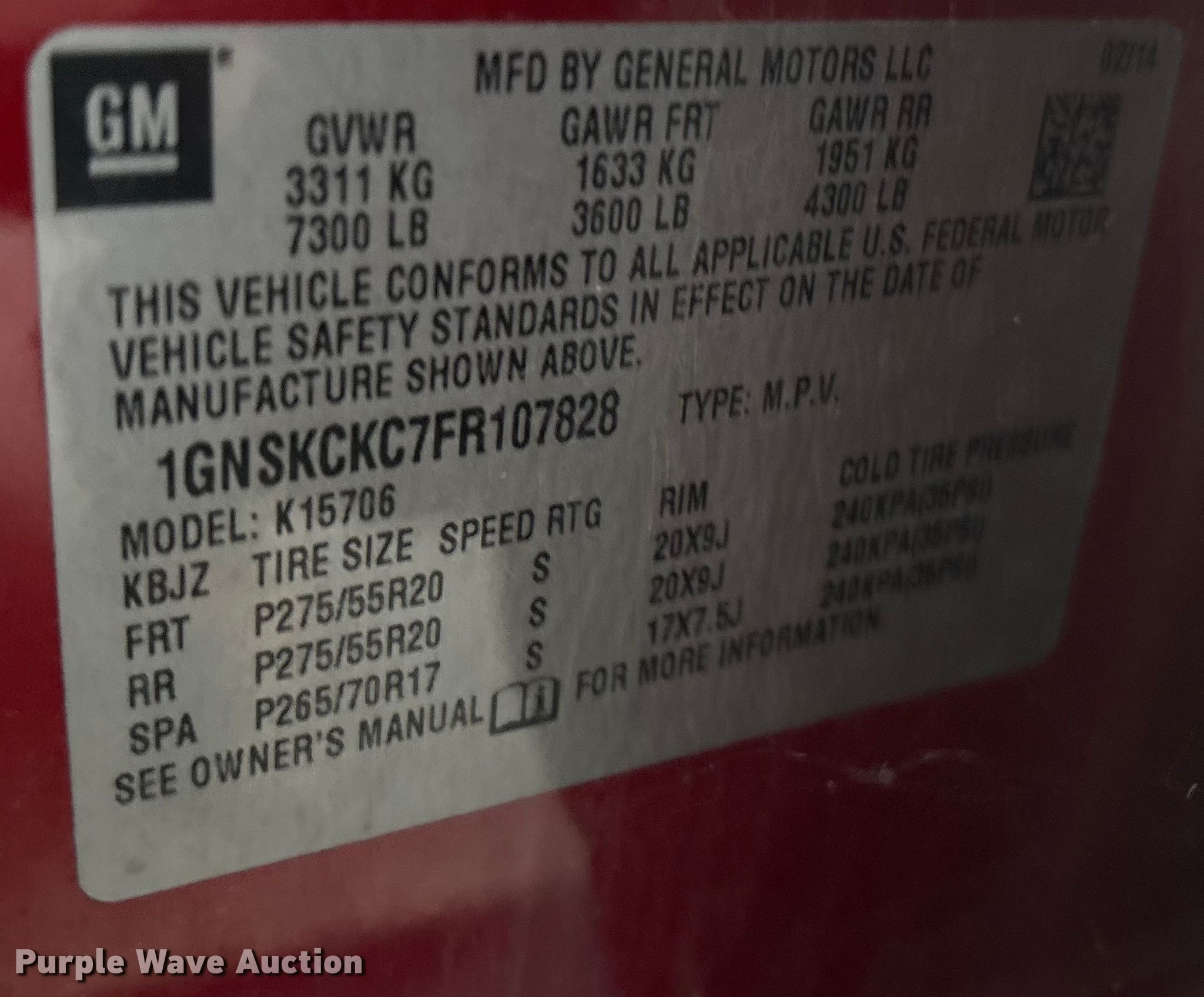 Purple Wave is selling a used Passenger Vehicle in Oklahoma. This item is a 2015 Chevrolet Tahoe LTZ SUV with the following: Miles: 97,906 on odometer, VIN: 1GNSKCKC7FR107828