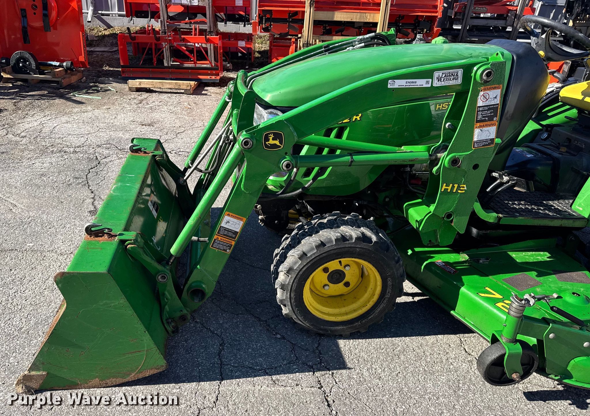 2015 John Deere 2032R MFWD tractor. Hours: 895 on meter, Serial: 1LV2032RCFH114777. Engine Yanmar, Cylinders: 3, Fuel type: Diesel. Transmission Hydrostatic, Differential lock. Features PTO: 540, Three point Top link, Loader John Deere H130, Controls: Joystick, Bucket Width: 62", John Deere belly mower Serial: 1M04172XEFM110150, Width: 72". Tires Front: 23X8.50-12SS, Rear: 14-17.5. Farm Power Lawn & Leisure, Inc.. Columbia, MO 65201