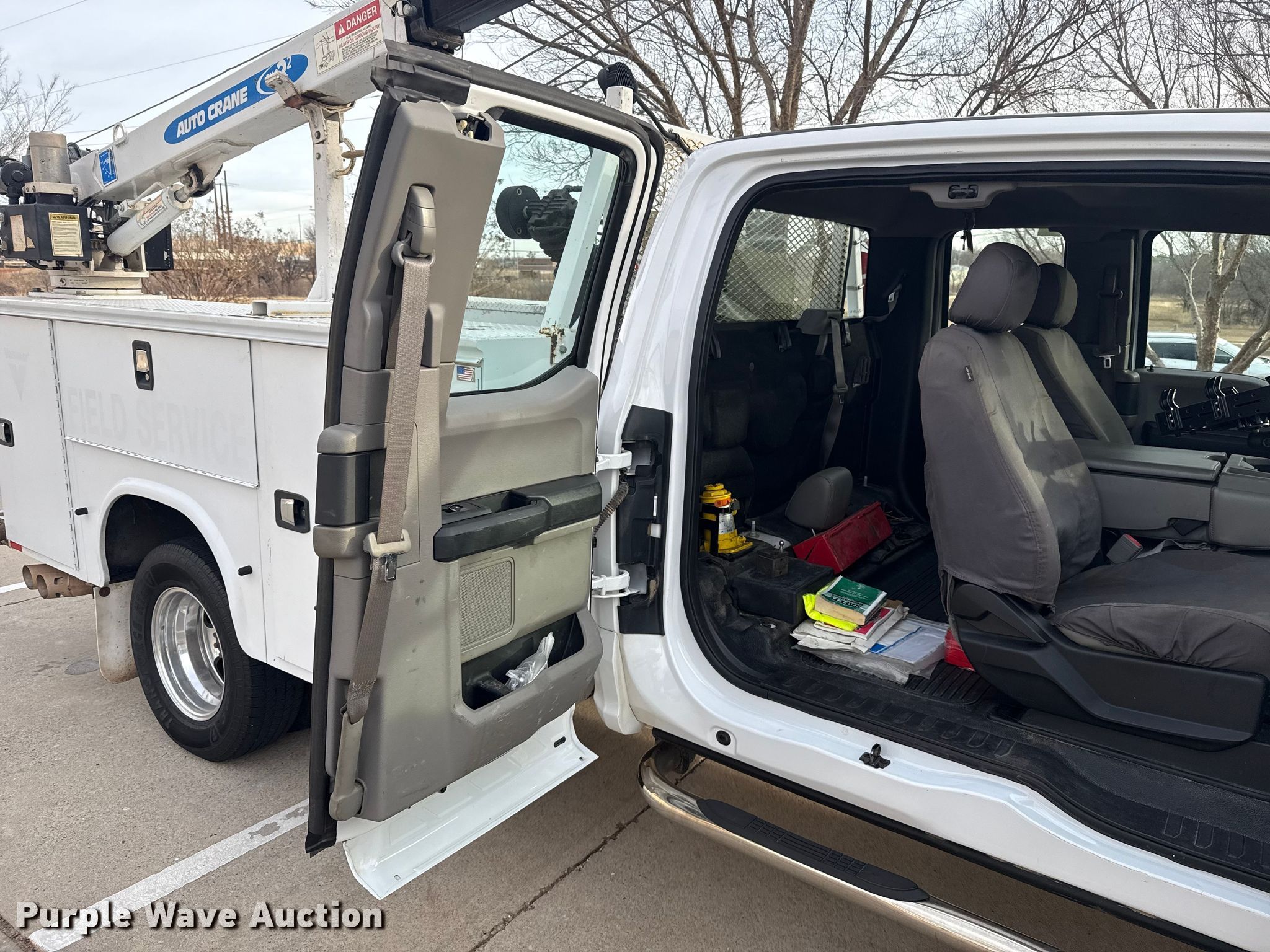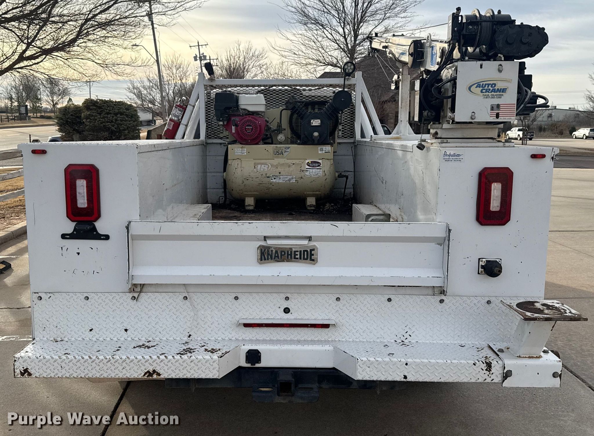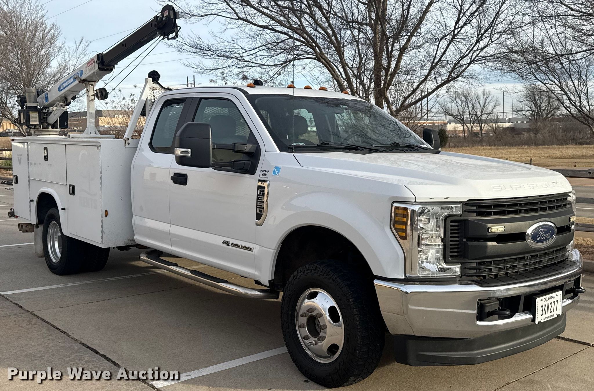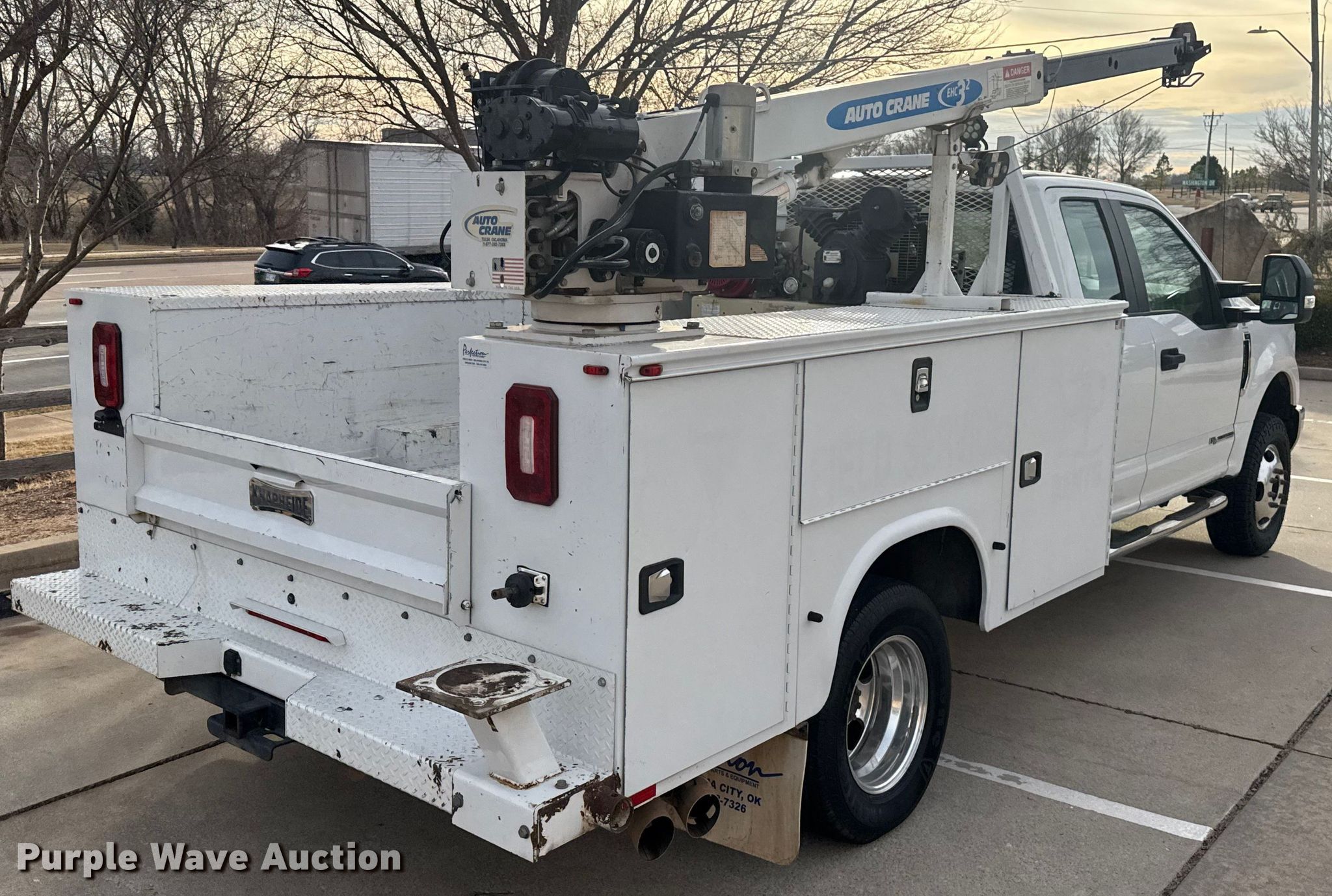 2018 Ford F350 Super Duty Ext. Cab utility bed pickup truck. Miles: 178,253 on odometer, VIN: 1FD8X3HTXJEC18736. Engine Displacement: 6.7L, Cylinders: 8, Fuel type: Diesel. Transmission Automatic, Four wheel drive. Interior AC, Heat, Heated mirrors, Power windows, Power locks, Cruise control, Backup camera, Auxiliary controls, Brake controller. Features Bed Utility bed, Knapheide 6108D54, Serial: 20181019-0600887, Length: 8' 11", Width: 94", Ingersoll Rand air compressor, Auto crane EHC3 crane Boom length: 7', Maximum reach: 16', Capacity: 3,200 pounds. Tires Size: LT245/75R17. Notes Dash warning indicator: TPMS, Traction control, Windshield chipped or cracked, Jump start required during on-site data collection, Driver rear outside dual tire damaged, needs replaced, Unknown operating condition of air compress. Oklahoma title. Title distribution may be delayed up to 30 days from verification of funds. Norman, OK 73069