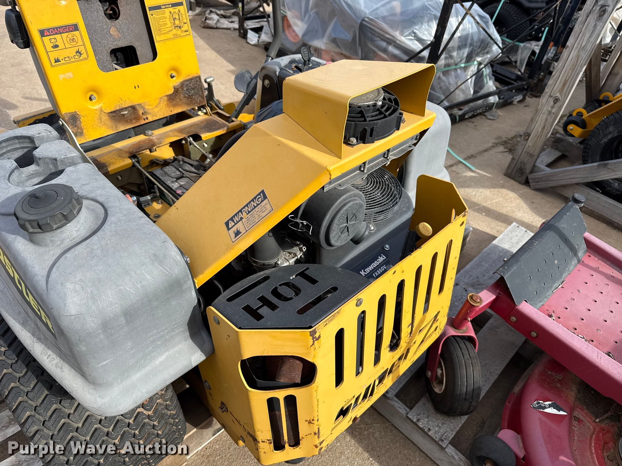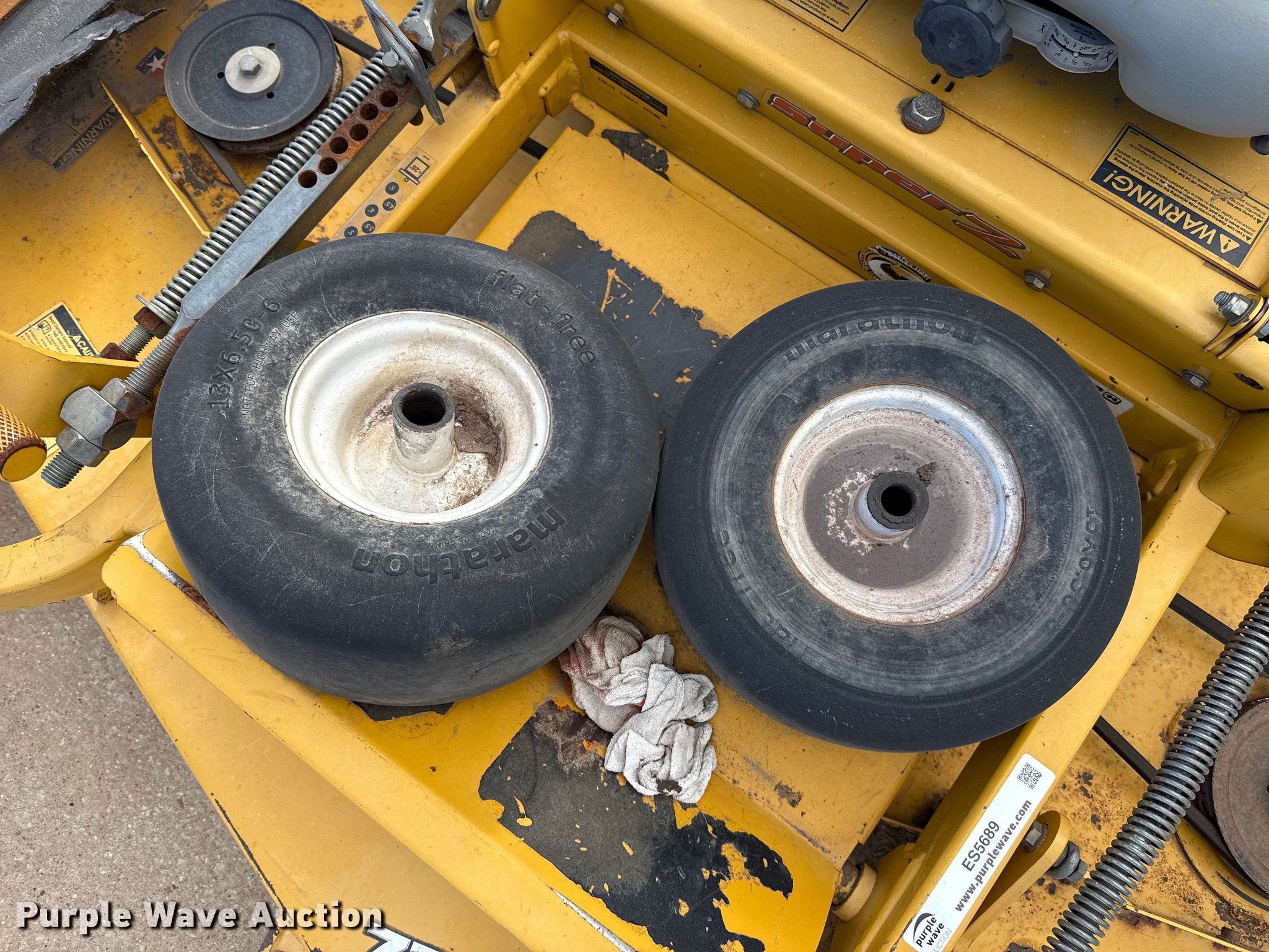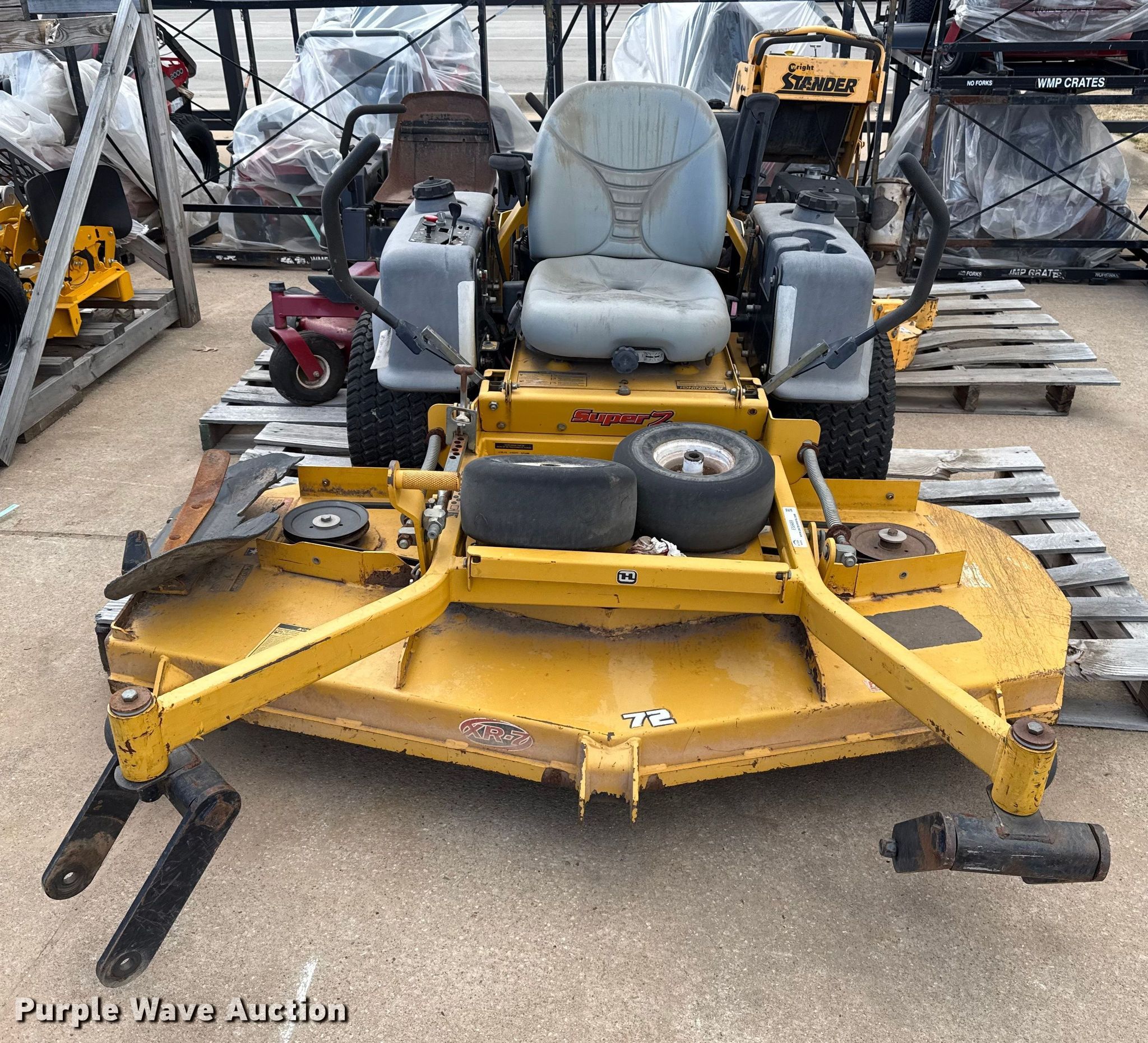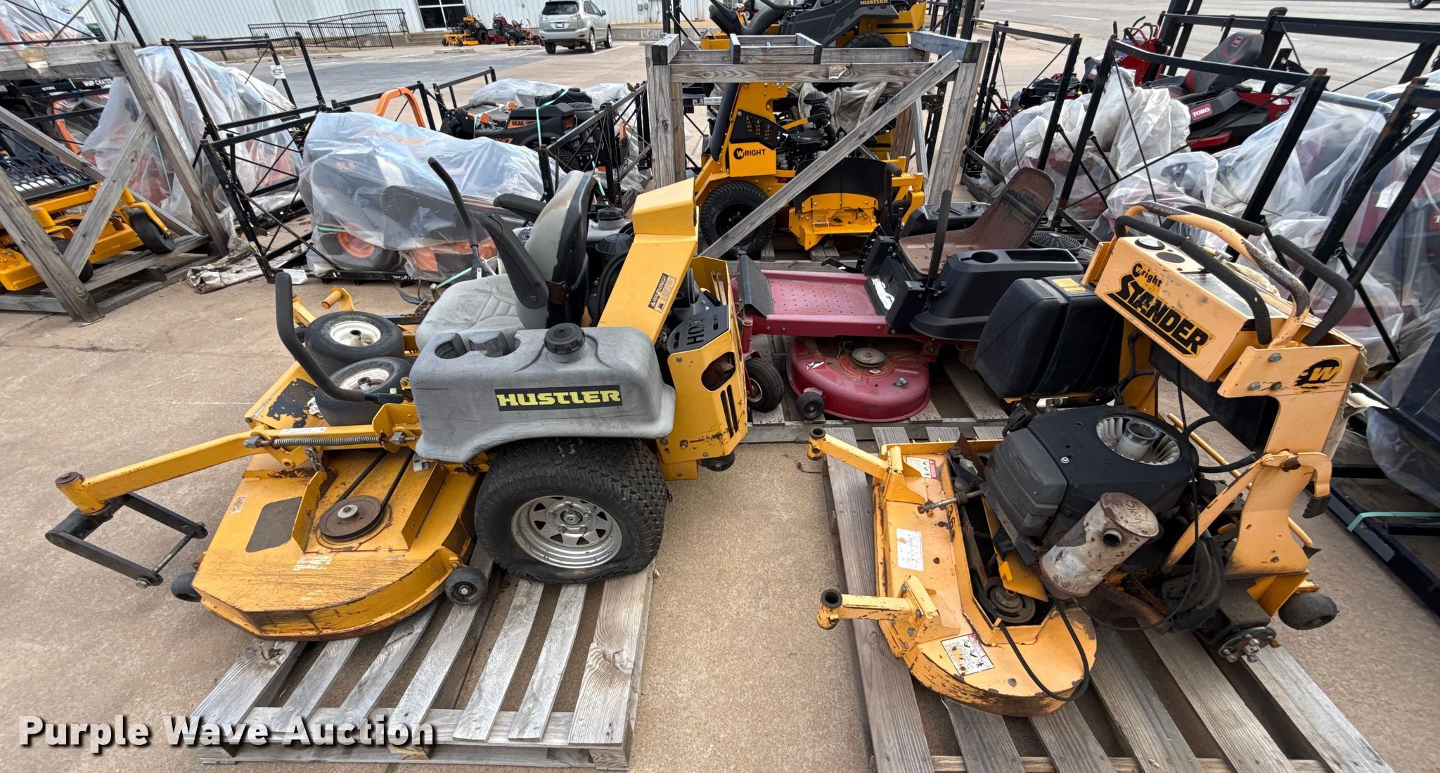Hustler Super Z ZTR lawn mower. Cutting width: 72". Engine Kawasaki FX850, Displacement: 852 C.I.D, Cylinders: 2, Fuel type: Gas. Transmission Hydrostatic. Chassis PTO. Tires Front: 13X6.50-6, Rear: 24X12.00-12. Notes Dead battery, Parts missing, Flat tires, Front tires removed, Non-operational unit. Wright Stander lawn mower Hours: 2,513 on meter, Cutting width: 36". Engine Kawasaki, Cylinders: 2, Fuel type: Gas. Transmission Hydrostatic. Chassis PTO. Features Stand on. Notes Parts missing Wheels, Engine parts, Non-operational unit. Toro lawn mower Hours: Unknown, Cutting width: 40". Engine Kohler, Cylinders: 2, Fuel type: Gas. Transmission Hydrostatic. Chassis PTO. Features Counter weights. Tires Front: 4.10/3.50-4, Rear: 18X7.50-8. Notes Dead battery, Flat tire, Non-operational unit. Kinnunen Sales & Service. Stillwater, OK 74074