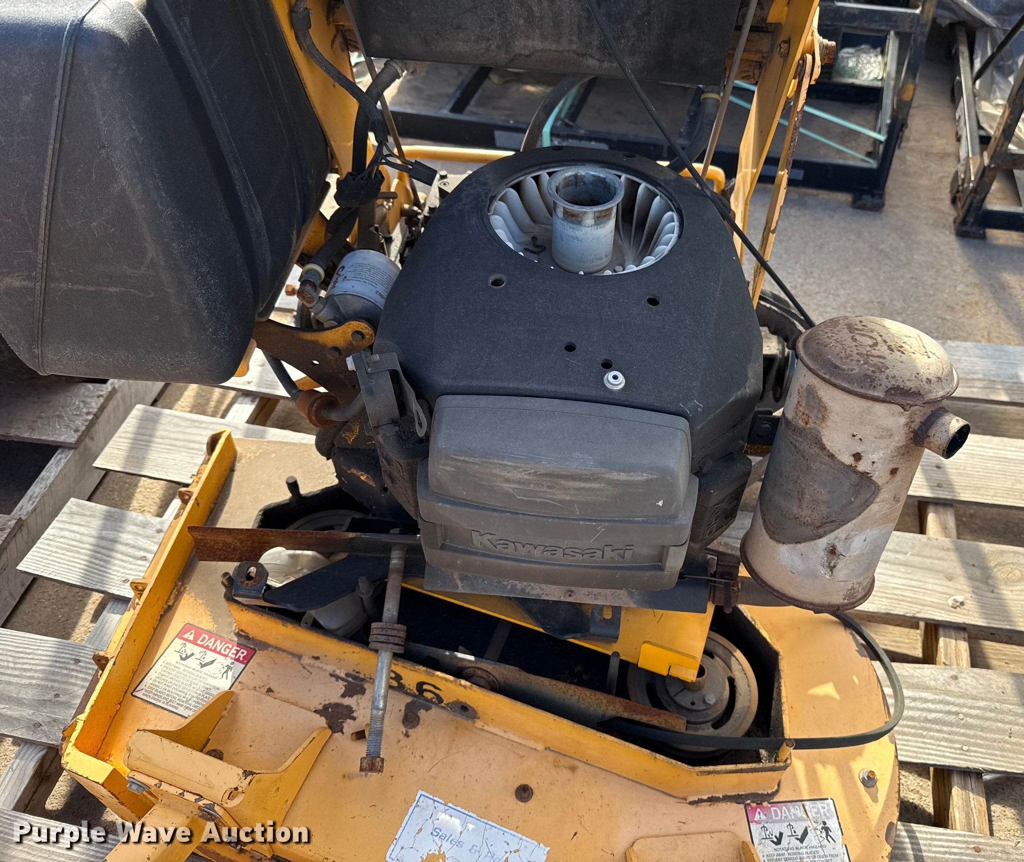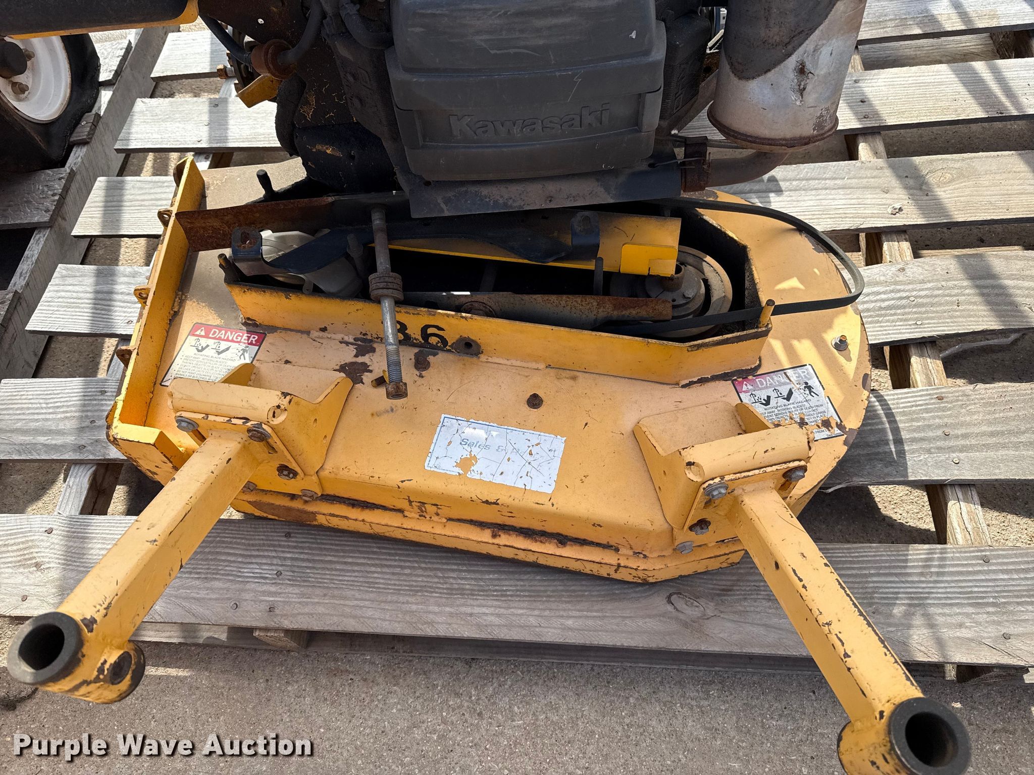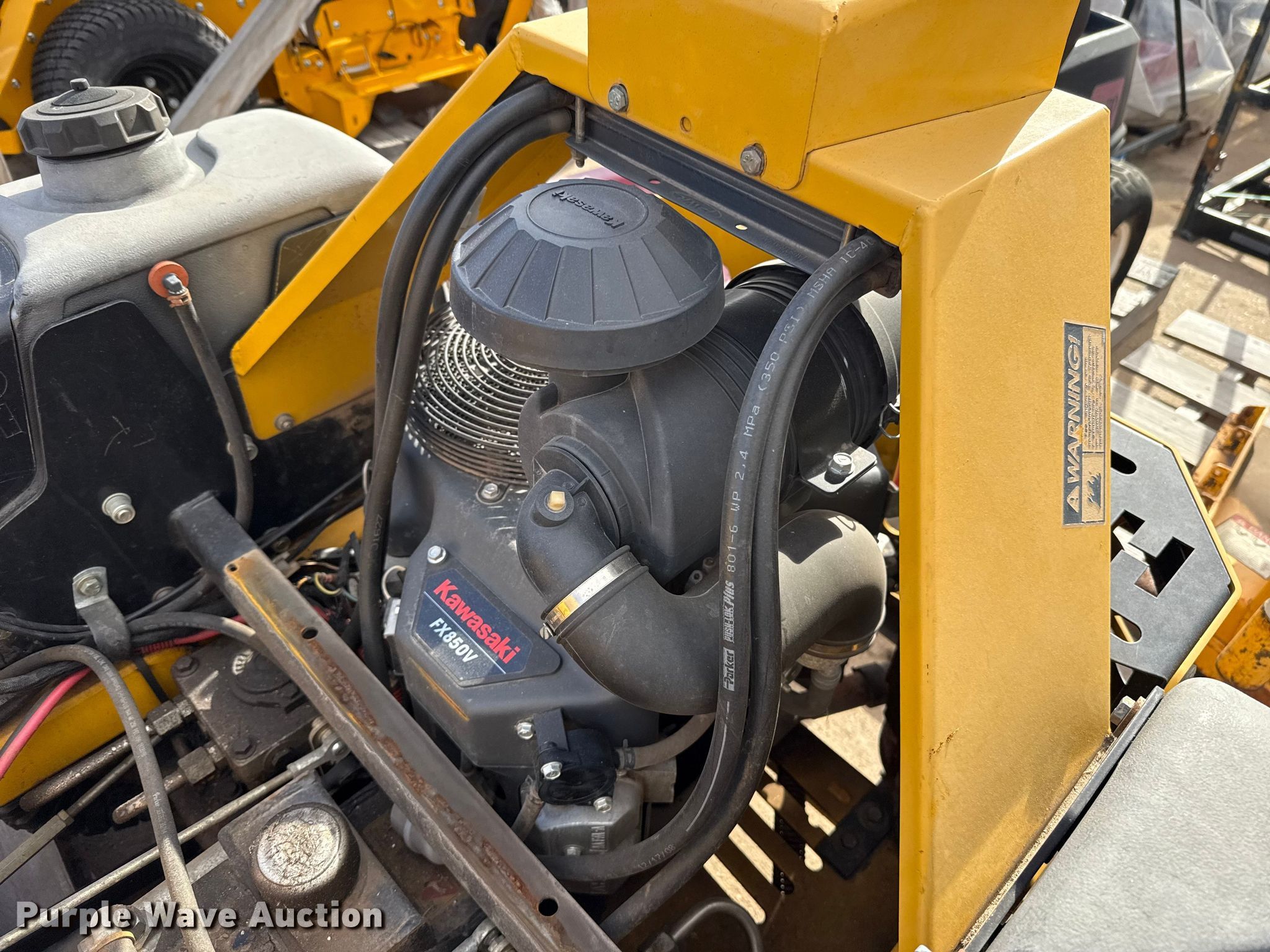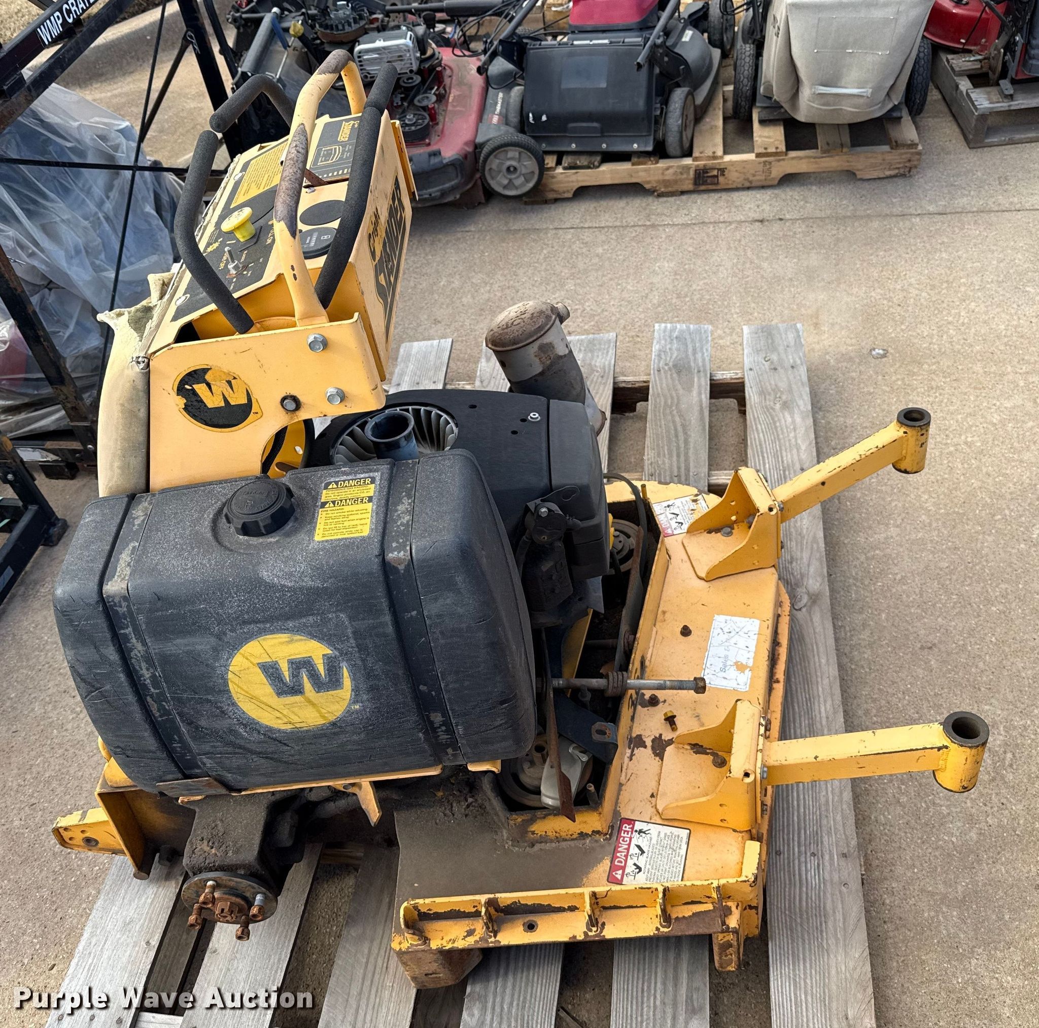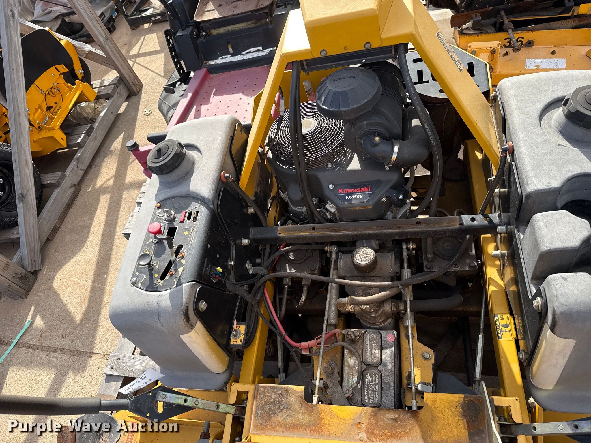 Hustler Super Z ZTR lawn mower. Cutting width: 72". Engine Kawasaki FX850, Displacement: 852 C.I.D, Cylinders: 2, Fuel type: Gas. Transmission Hydrostatic. Chassis PTO. Tires Front: 13X6.50-6, Rear: 24X12.00-12. Notes Dead battery, Parts missing, Flat tires, Front tires removed, Non-operational unit. Wright Stander lawn mower Hours: 2,513 on meter, Cutting width: 36". Engine Kawasaki, Cylinders: 2, Fuel type: Gas. Transmission Hydrostatic. Chassis PTO. Features Stand on. Notes Parts missing Wheels, Engine parts, Non-operational unit. Toro lawn mower Hours: Unknown, Cutting width: 40". Engine Kohler, Cylinders: 2, Fuel type: Gas. Transmission Hydrostatic. Chassis PTO. Features Counter weights. Tires Front: 4.10/3.50-4, Rear: 18X7.50-8. Notes Dead battery, Flat tire, Non-operational unit. Kinnunen Sales & Service. Stillwater, OK 74074
