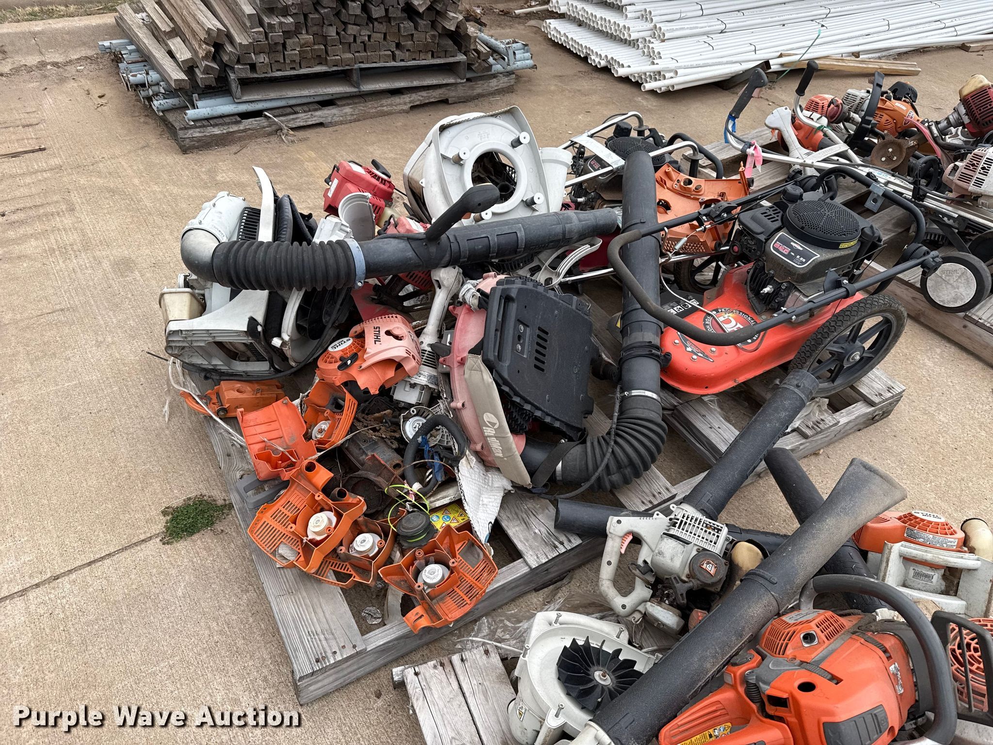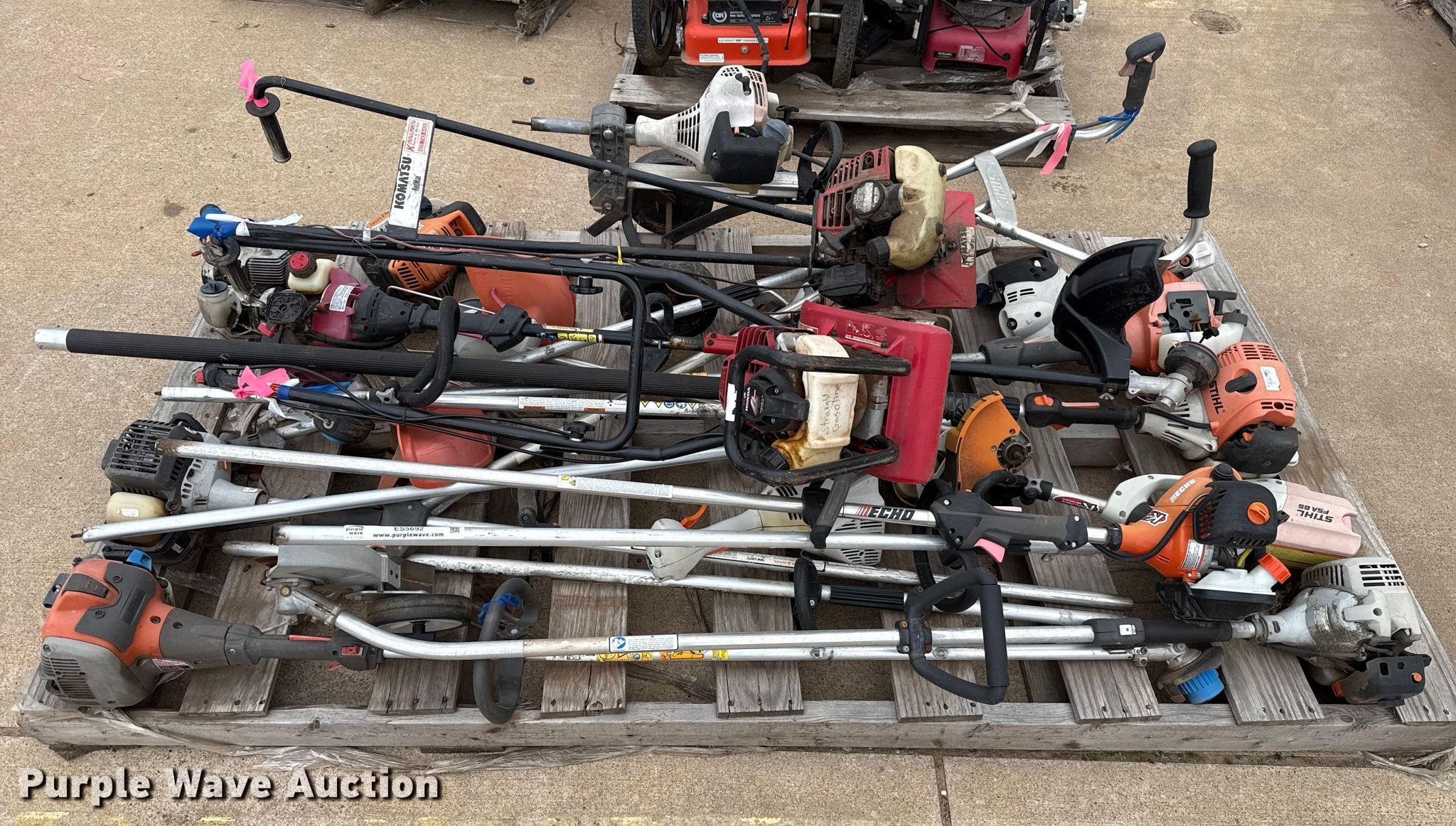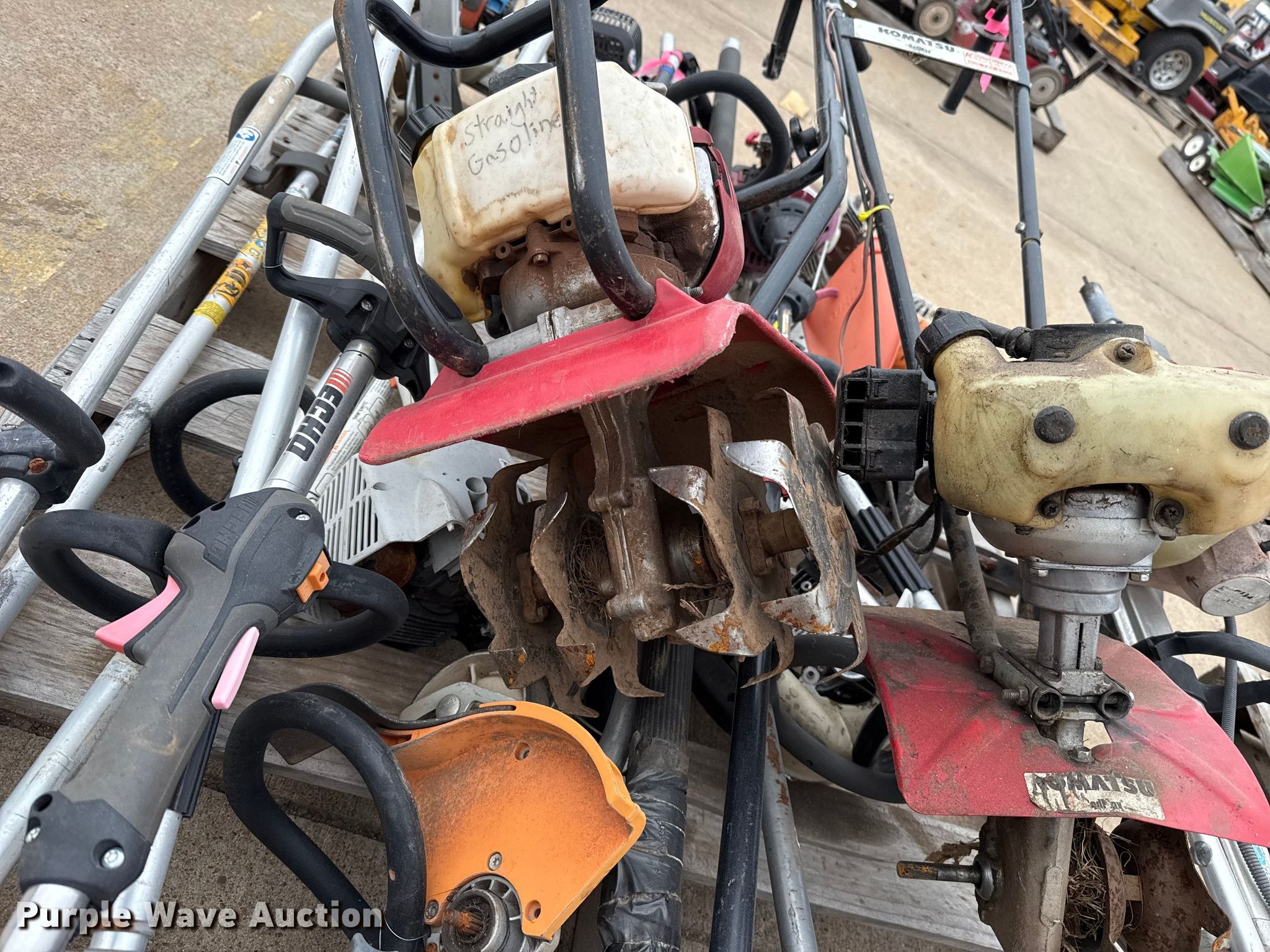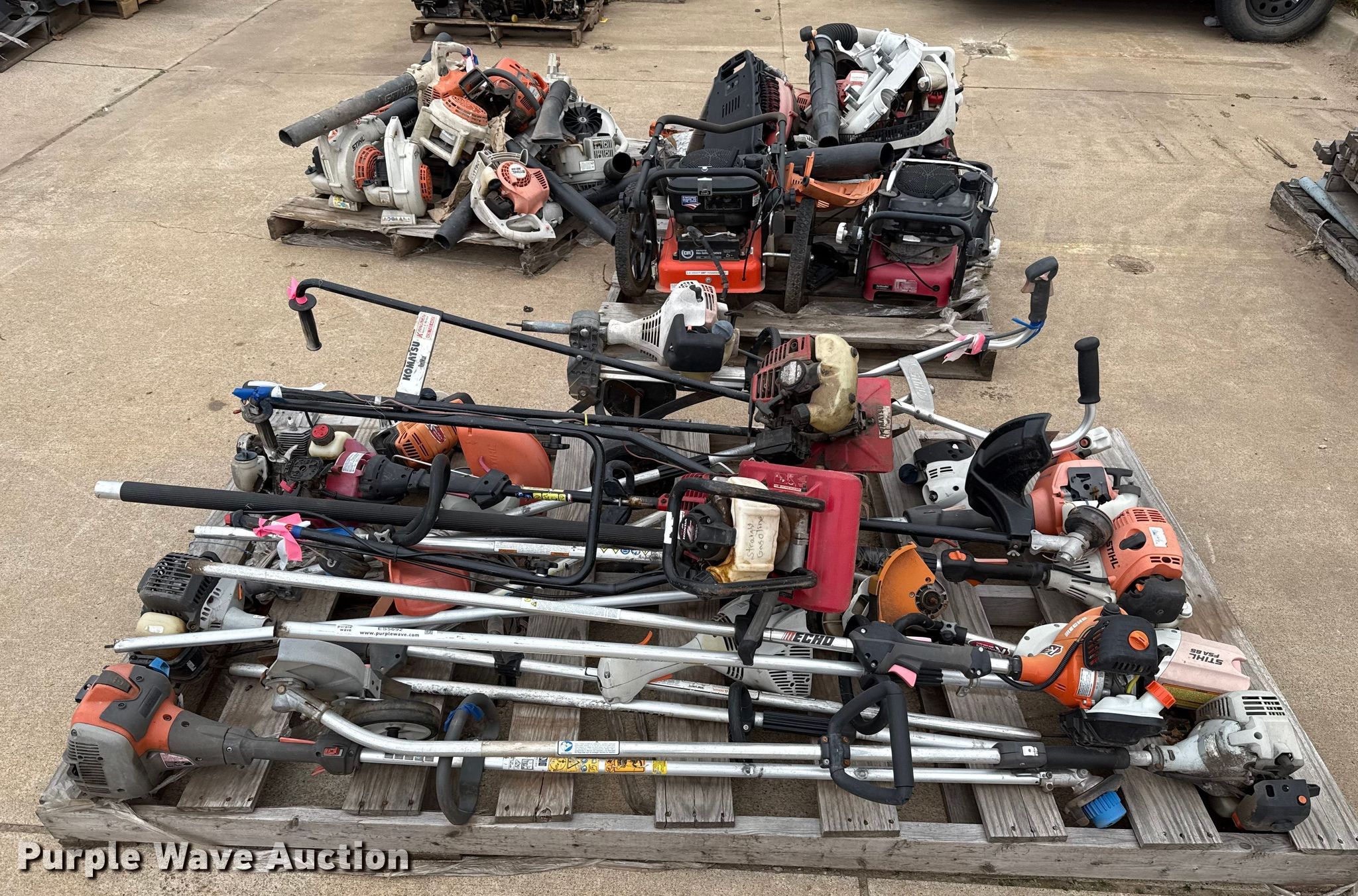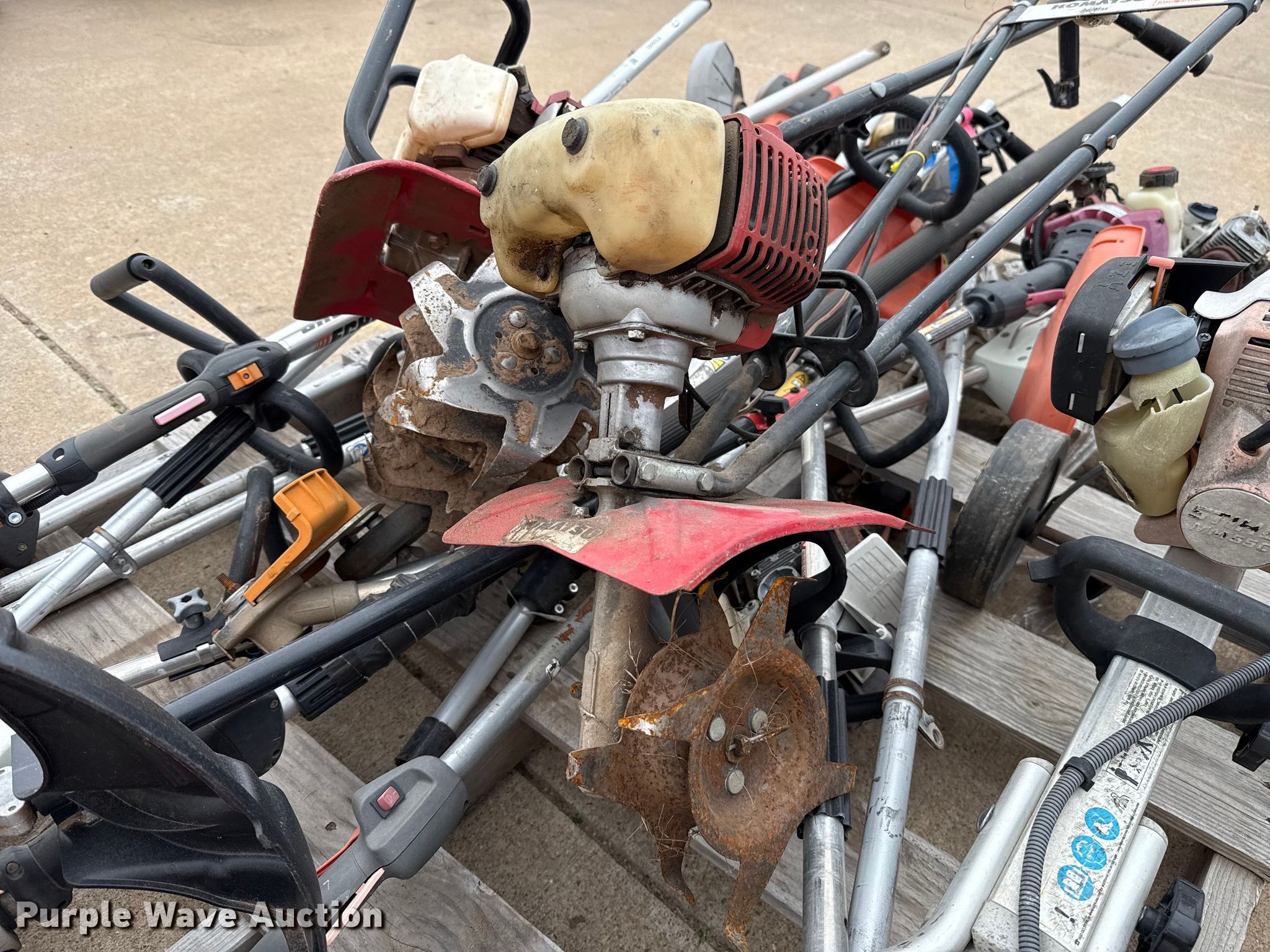 Purple Wave is selling a used Lawn and Garden in Oklahoma. This item is a Yard tools with the following: (2) rototillers, Approximately (7) weed eaters/edgers, (2) walk behind weed eaters, (14) blowers