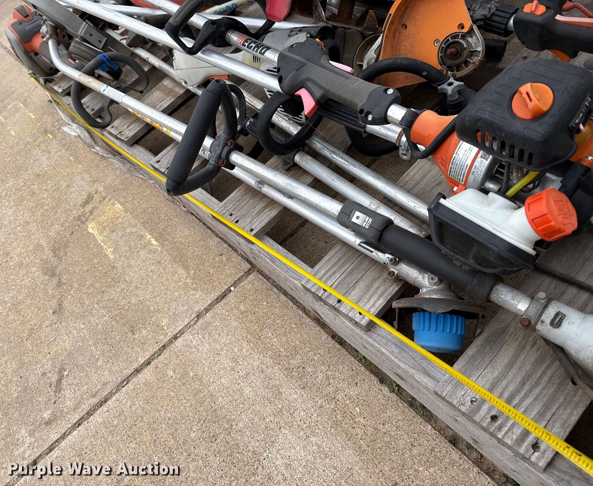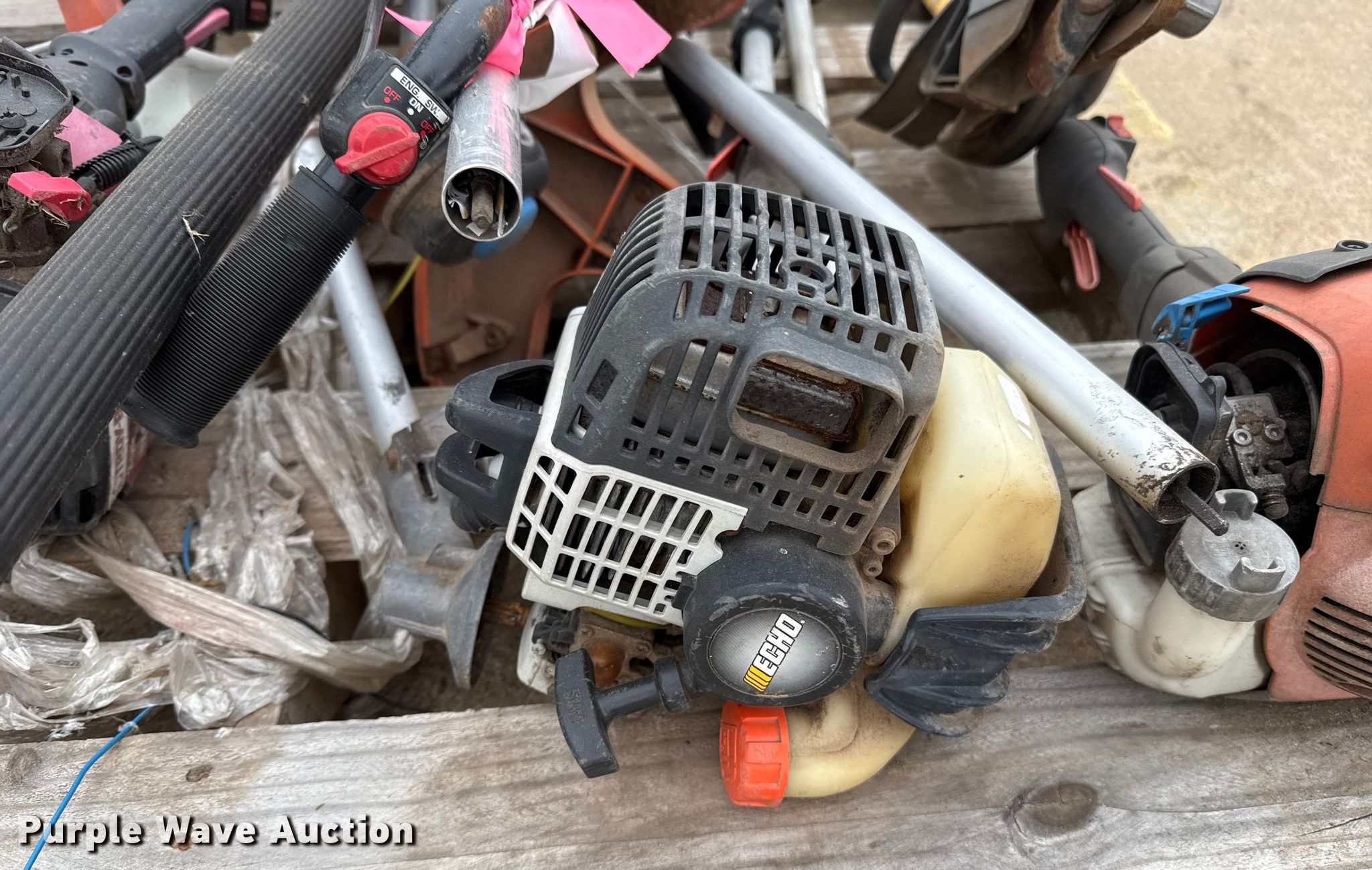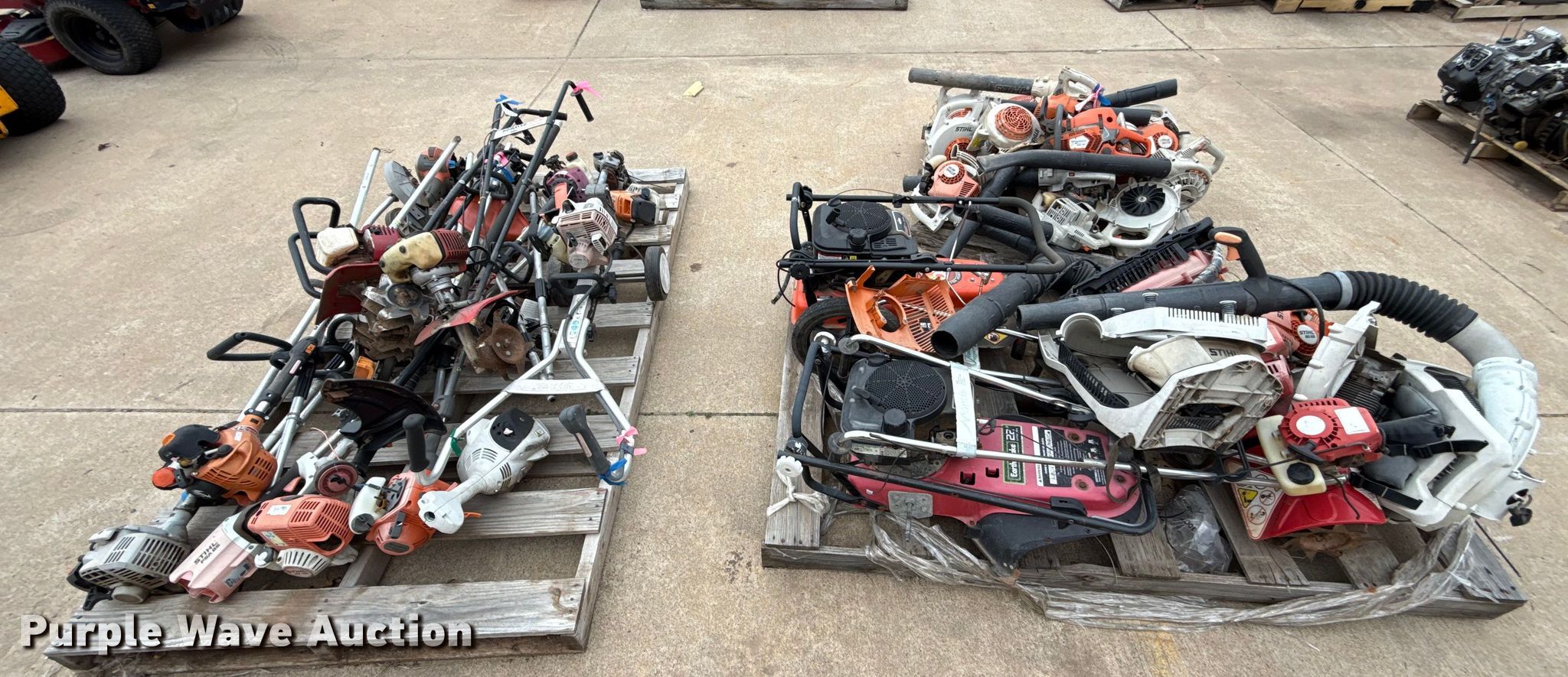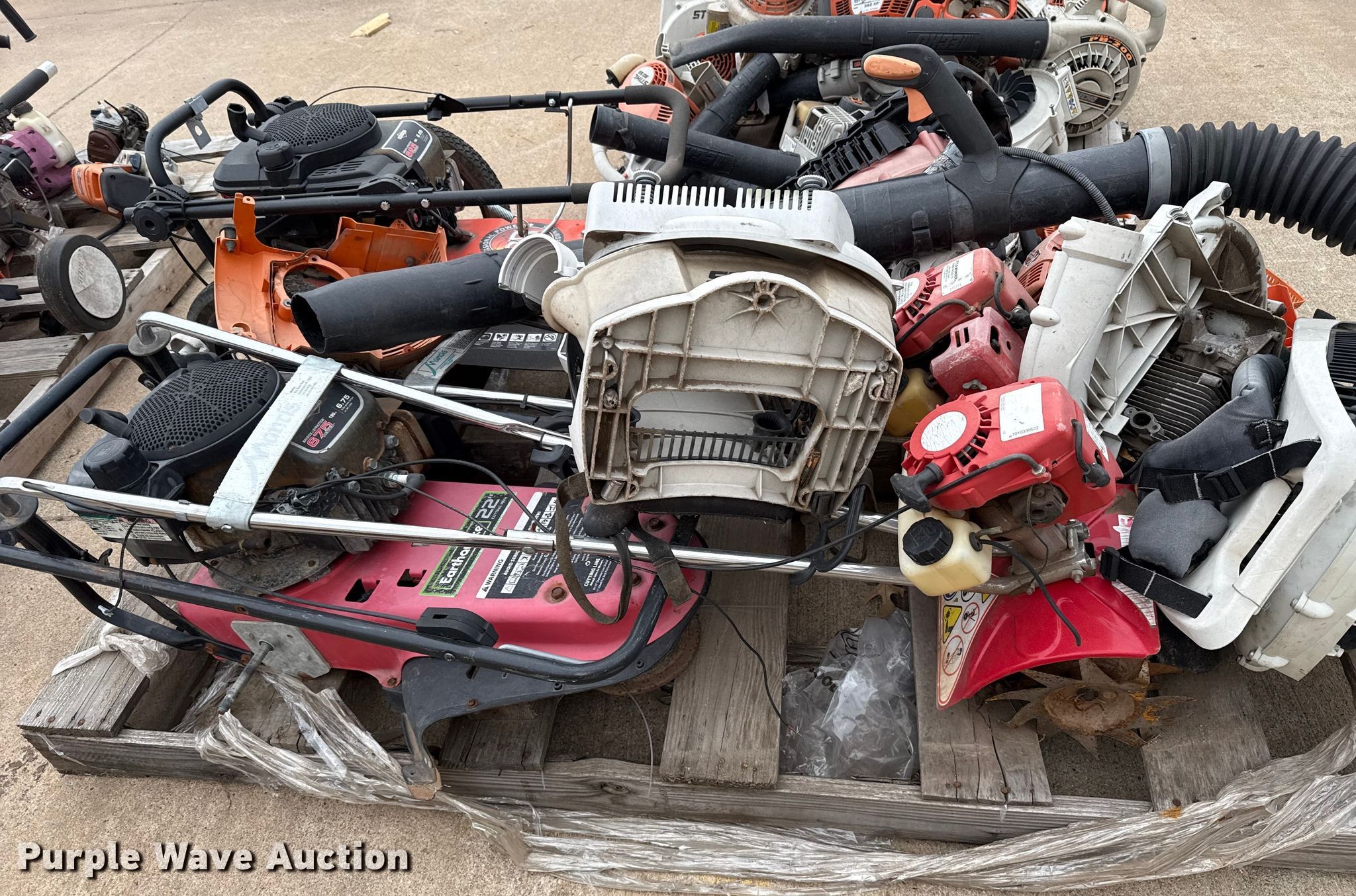 Purple Wave is selling a used Lawn and Garden in Oklahoma. This item is a Yard tools with the following: (2) rototillers, Approximately (7) weed eaters/edgers, (2) walk behind weed eaters, (14) blowers