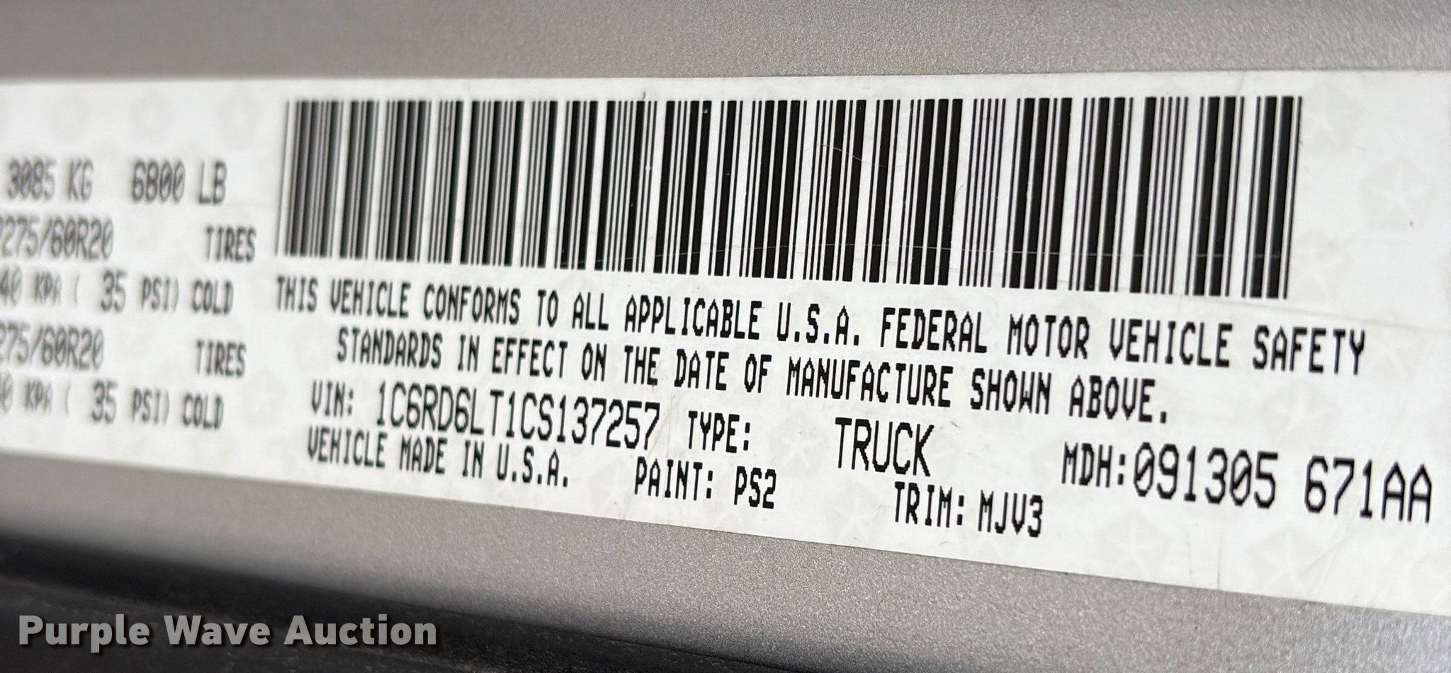 2012 Dodge Ram 1500 Crew Cab pickup truck. Miles: 214,128 on odometer, Miles or hours may vary, unit still in use, VIN: 1C6RD6LT1CS137257. Engine Displacement: 5.7L, Cylinders: 8, Fuel type: Gas. Transmission Automatic. Interior AC, Heat, Seat: Power driver, Heated mirrors, Power windows, Power locks, Cruise control, Backup camera. Tires Size: 275/60R20. Notes Dash warning indicator: TPMS, ABS, Traction control. Title distribution may be delayed up to 14 days from verification of funds. Bruckner's Truck & Equipment. Monroe, LA 71202