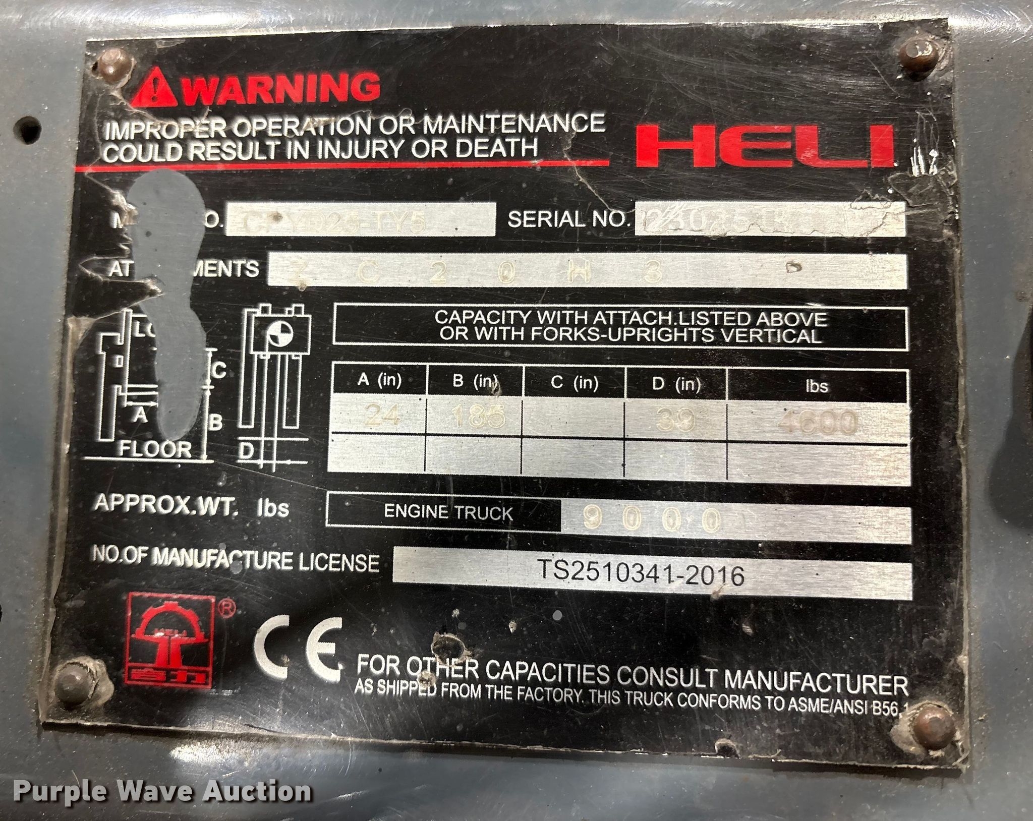 Purple Wave is selling a used Cushion Tire or Pneumatic Forklift in Massachusetts. This item is a 2016 Heli CPYD25 forklift with the following: Hours: 4,489 on meter, Serial: 230251K5125, Unit #: SFS2860
