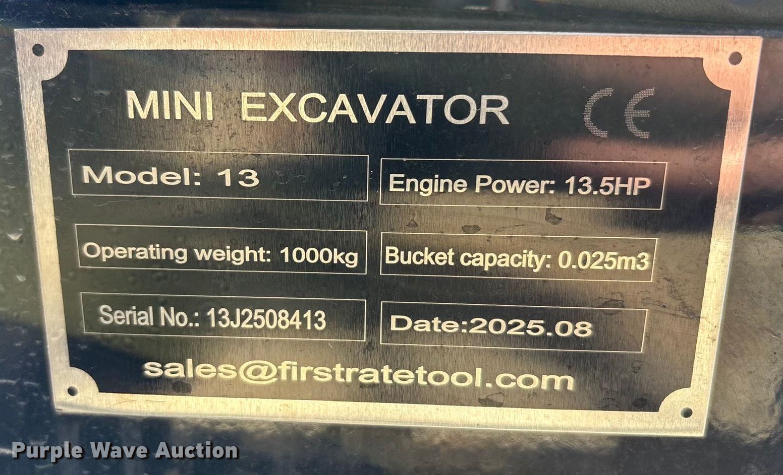 Purple Wave is selling a used Mini Excavator in Texas. This item is a 2025 Future 13 mini excavator with the following: Hours: 1 on meter, Serial: 13J2508413