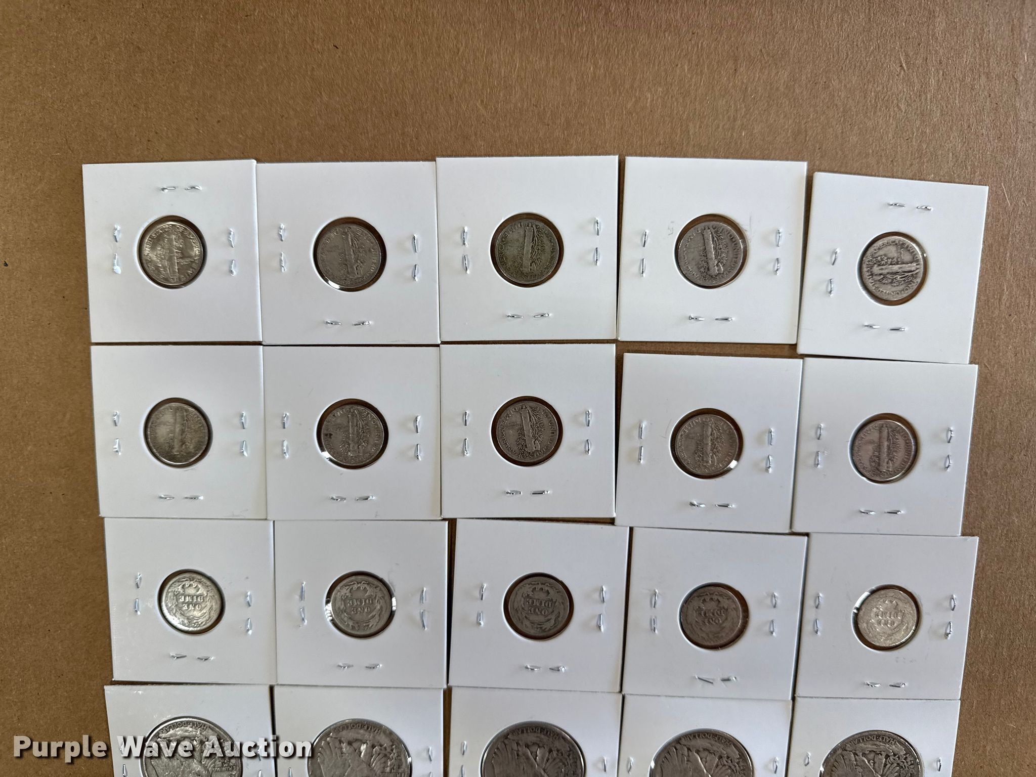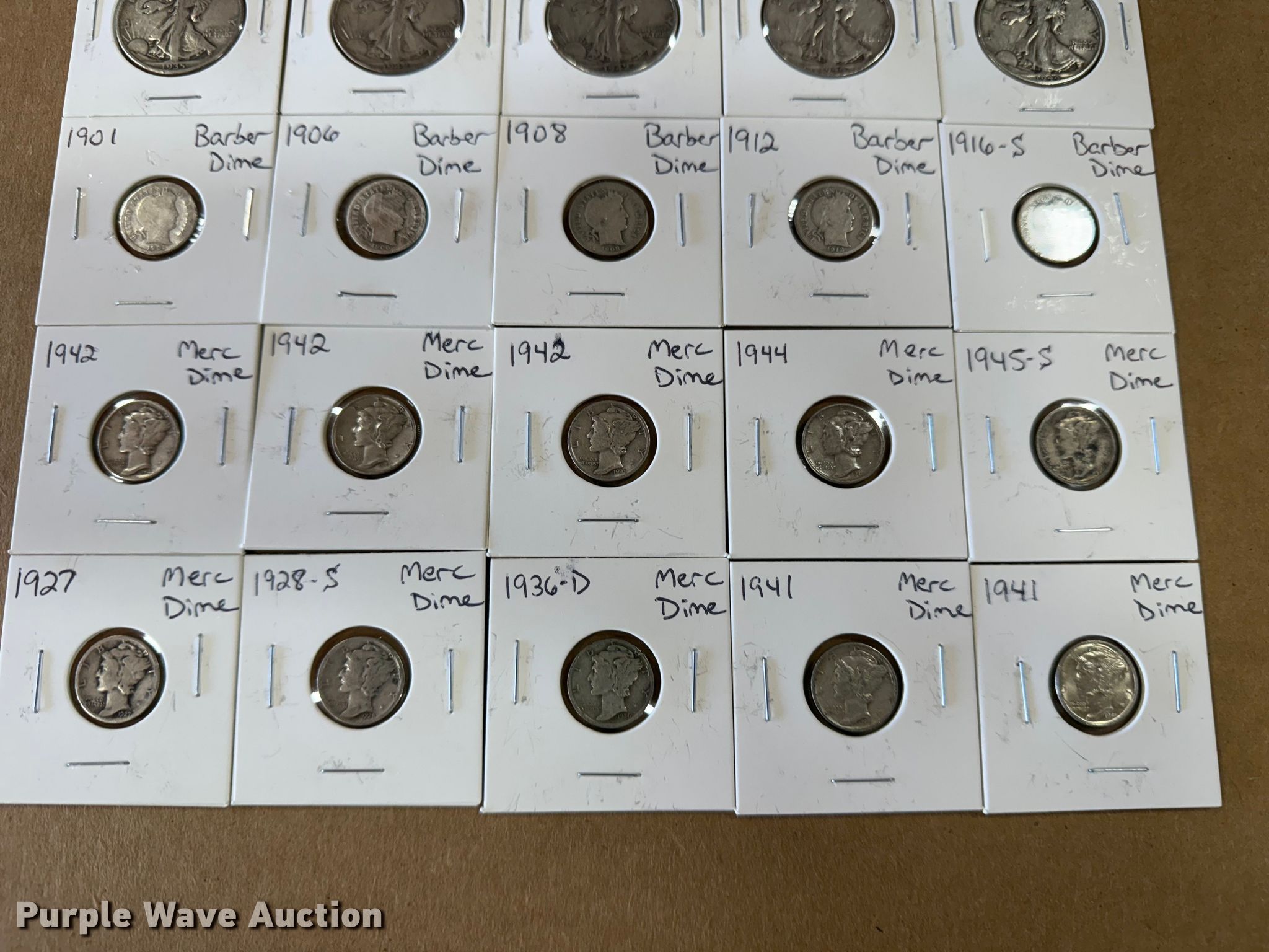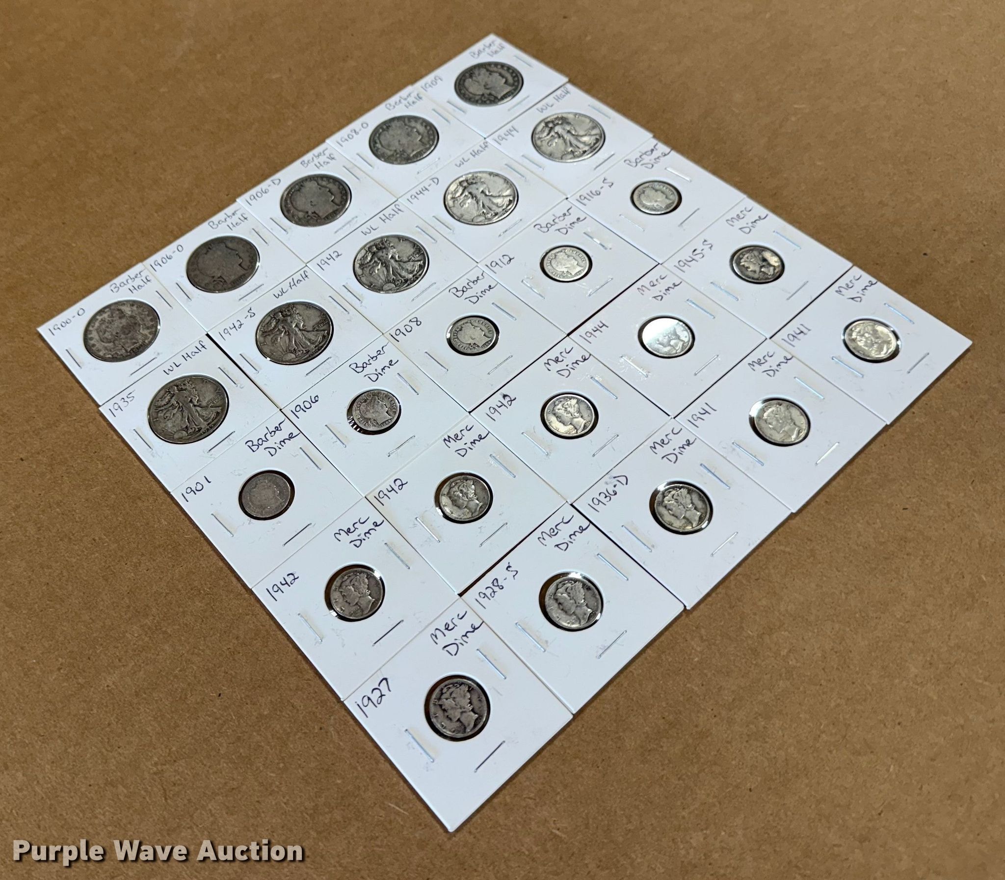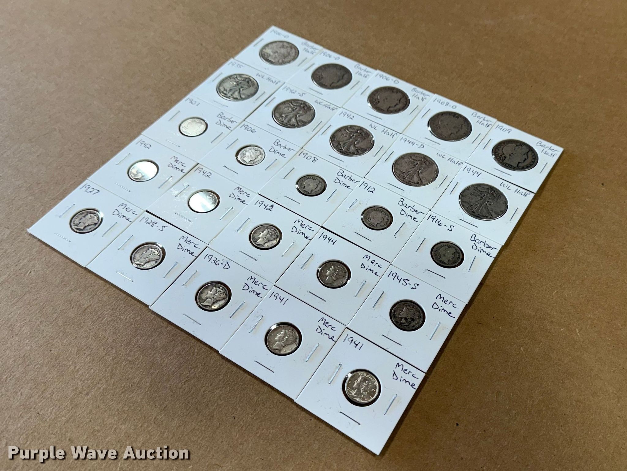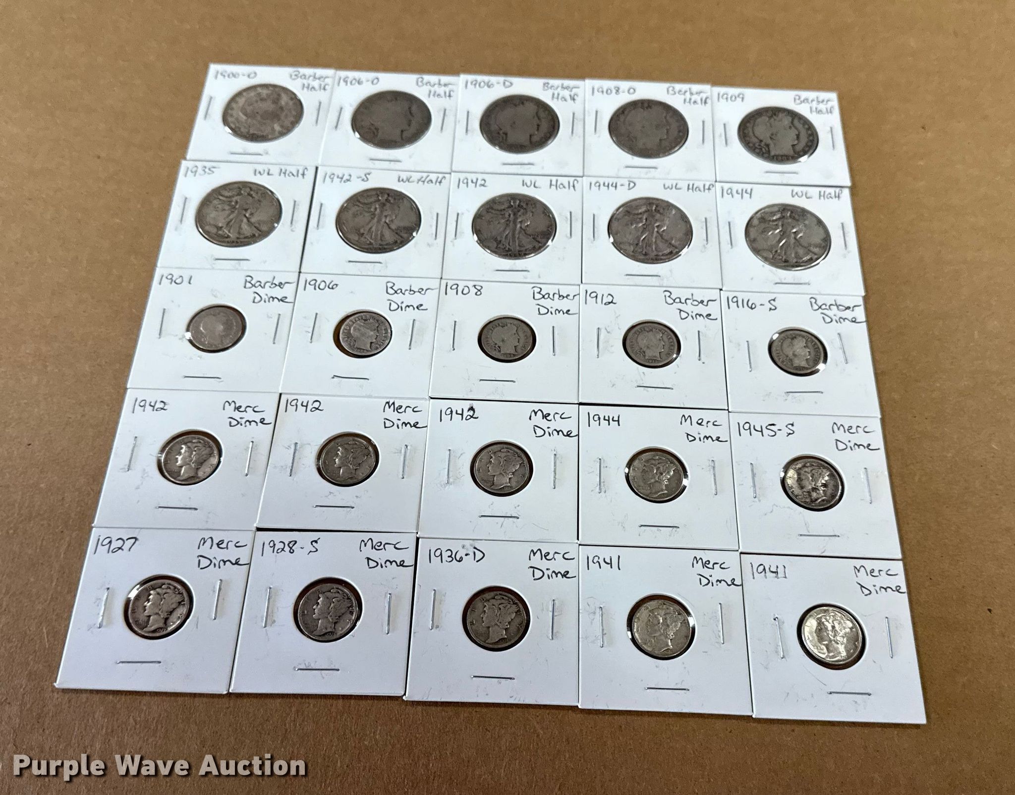 Purple Wave is selling a used Jewelery in Oklahoma. This item is a (25) Silver coins with the following: Walking Liberty, Mercury dimes, Barber halves, Barber dimes
