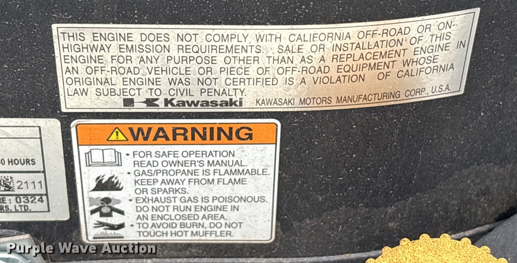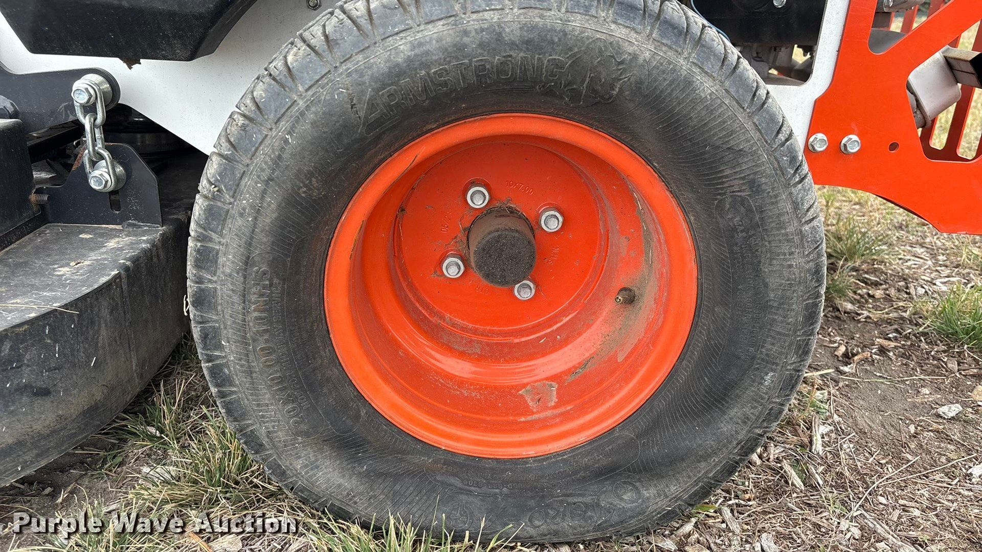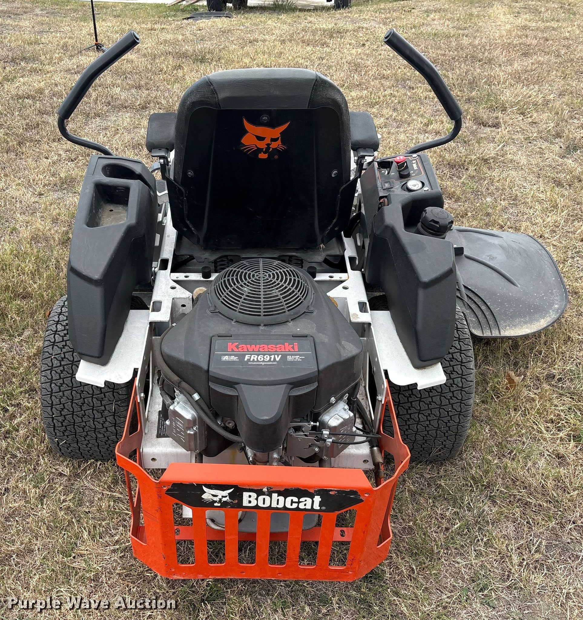 Bobcat M62017872219 ZTR lawn mower. Hours: 62 on meter, Cutting width: 48", Serial: B6H511820. Engine Kawasaki FR691V, Serial: B6H511820, Displacement: 726cc, Cylinders: 2, Fuel type: Gas. Transmission Hydrostatic. Tires Front: 11x6.00-5, Rear: 20x10.00-10. Notes Flat tires. Lender Owned. 162 Commercial Drive. Buda, TX 78610