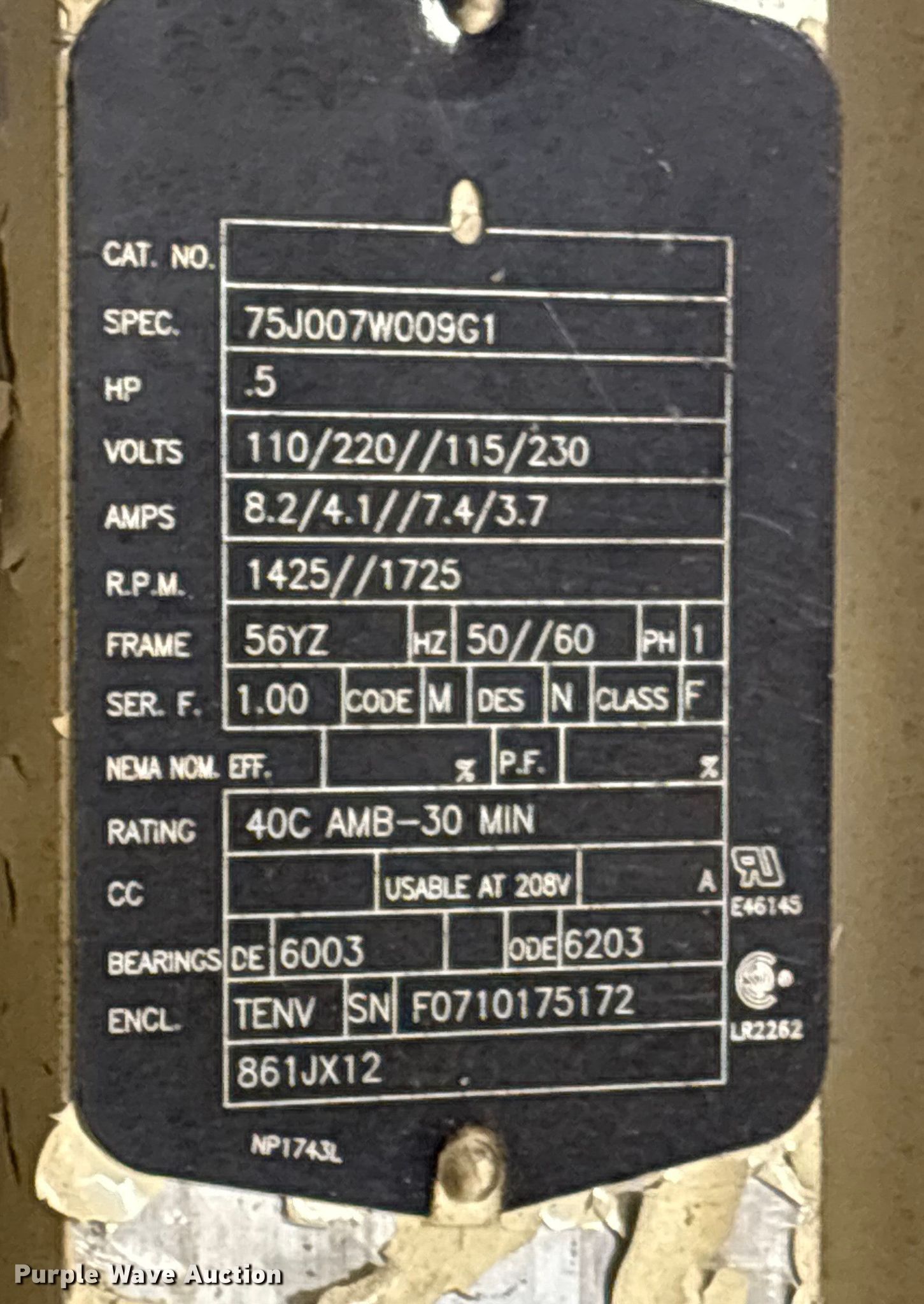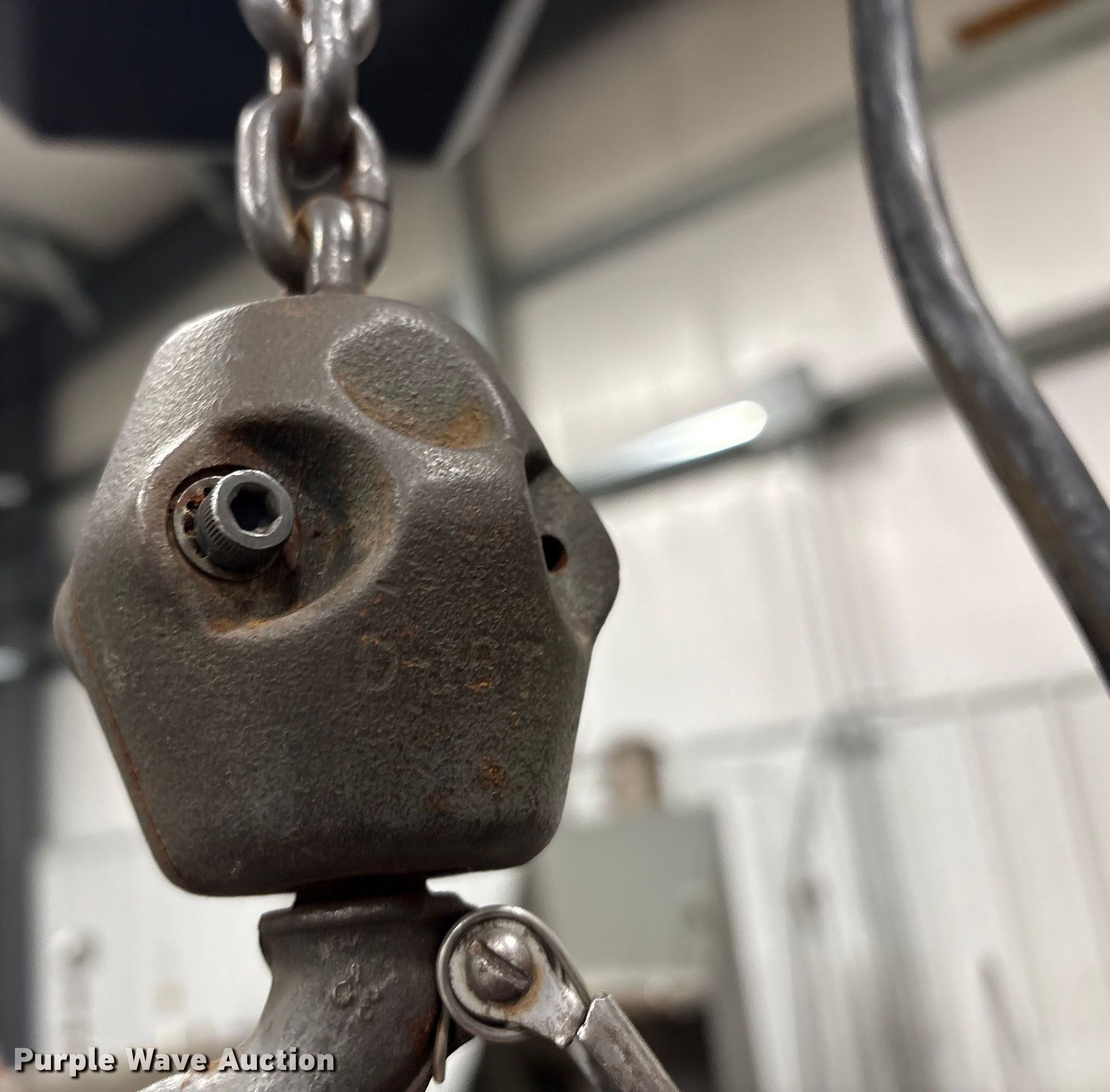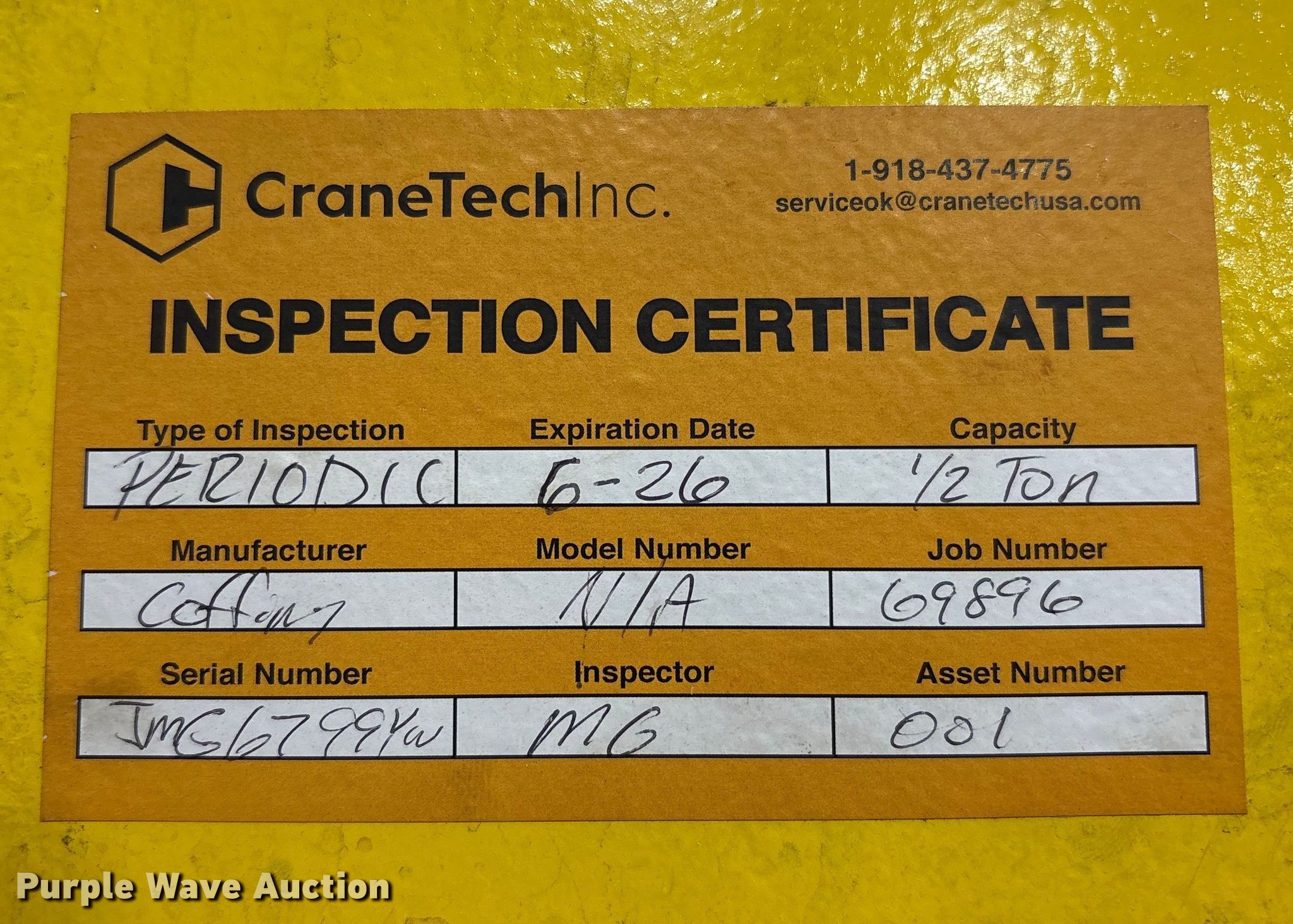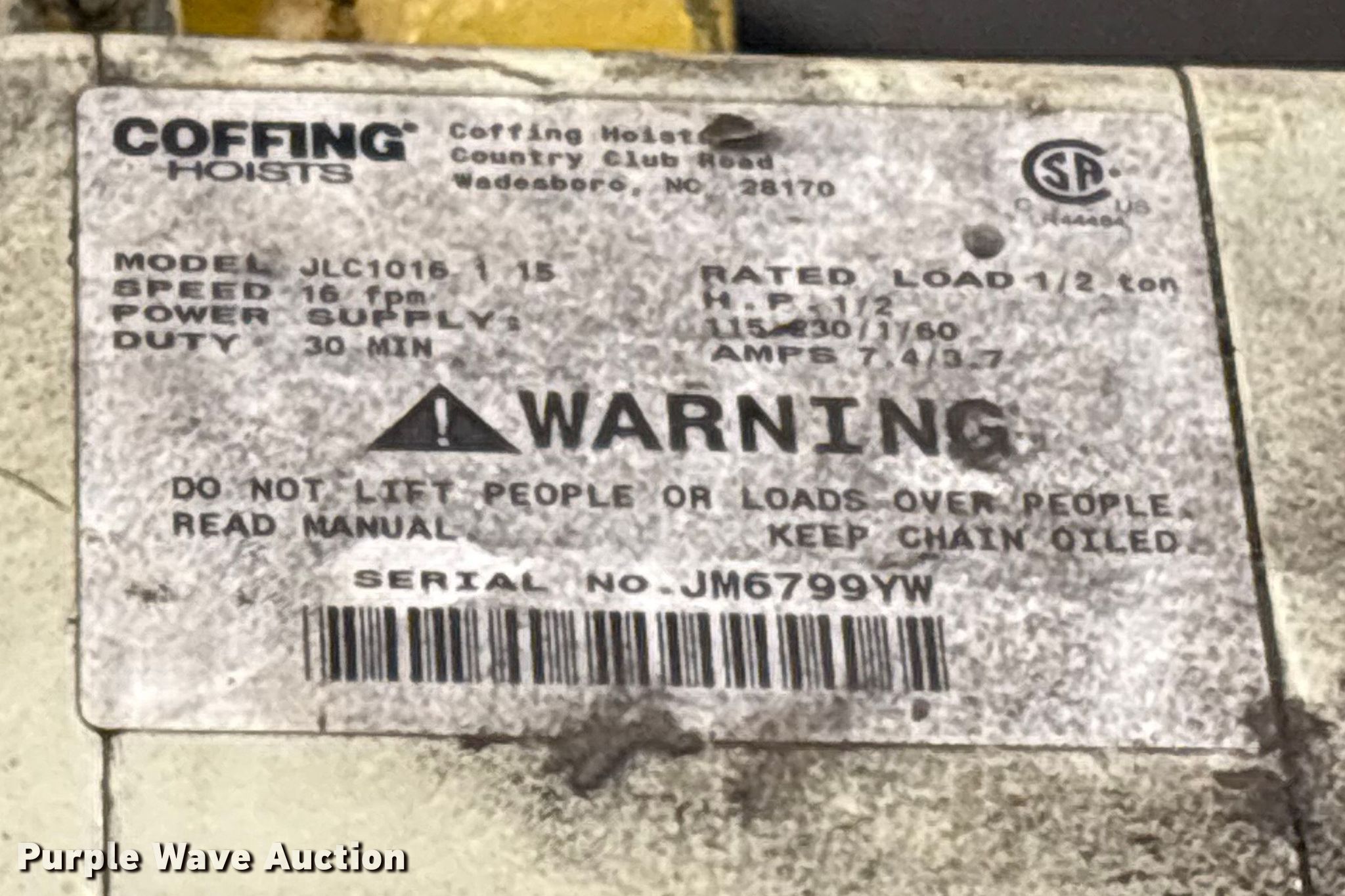 Louden jib crane. Dimensions. Overall Length: 11' 9", Width: 36", Height: 9' 10". Electric Motor Louden JLC Serial: F0710175172, Phase: Single. Features Coffing JLC1016115 hoist Serial: JM6799YW, Capacity: 1/2 ton, HP: 0.5. Myers-Aubrey Co. Broken Arrow, OK 74012