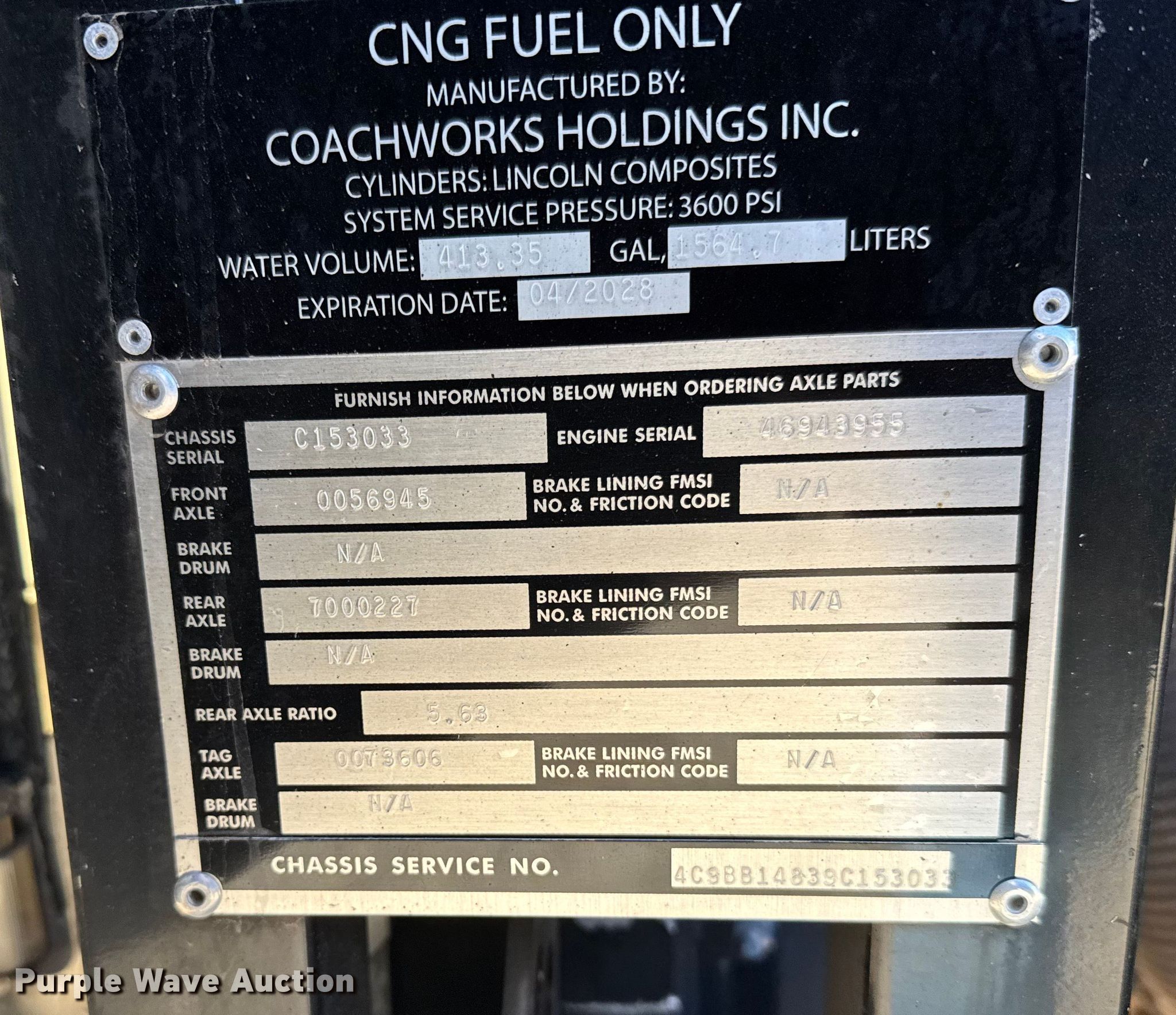 2009 Blub Coachworks M4411 coach bus. Miles: 28,294 on odometer, VIN: 4C9BB14839C153033. Engine Cylinders: 6, Fuel type: CNG. Transmission Automatic. Chassis Axles: Single, Tag axle, Suspension: Air, Brakes: Air, GVWR: 52,000 lbs. Interior AC, Heat, Heated mirrors, Cruise control, Passengers: 48. Tires Front: 315/80R22.5, Rear: 315/89R22.5, Rear: 12R22.5. Notes Dash warning indicator: Check engine. Kansas title. Title distribution may be delayed up to 14 days from verification of funds. Ryan Roofing. Salina, KS 67401