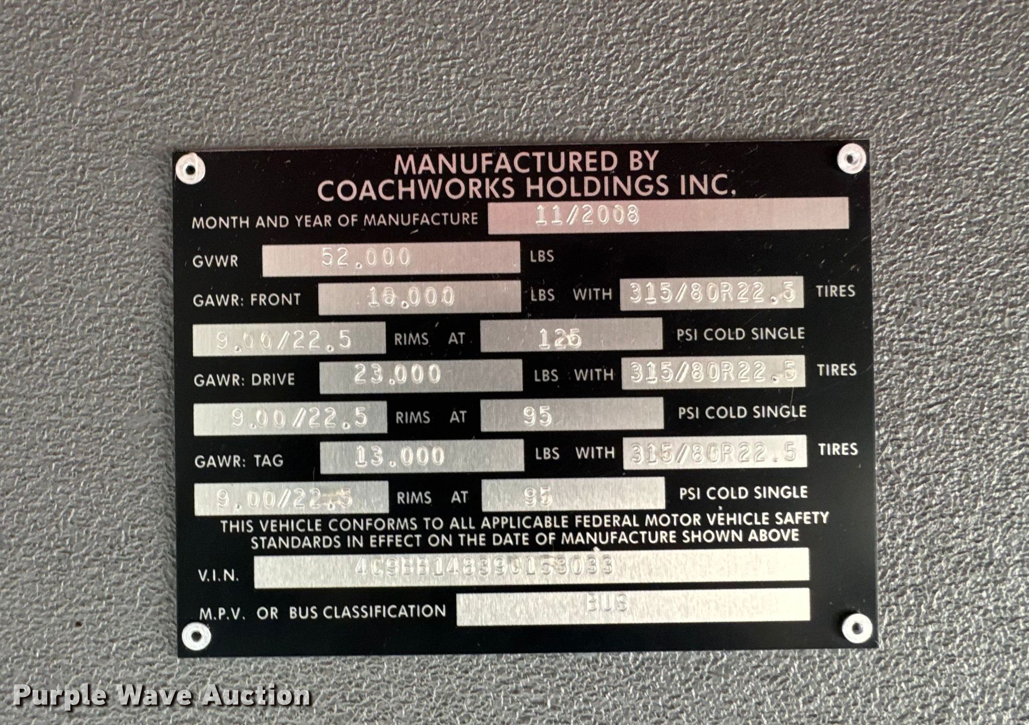 Purple Wave is selling a used Bus in Kansas. This item is a 2009 Blub Coachworks M4411 coach bus with the following: Miles: 28,294 on odometer, VIN: 4C9BB14839C153033