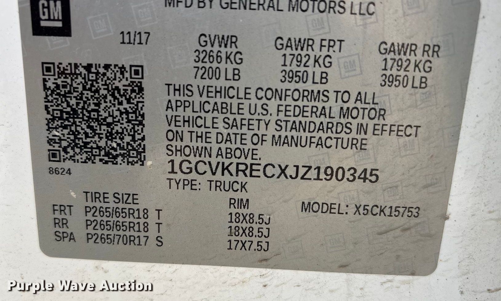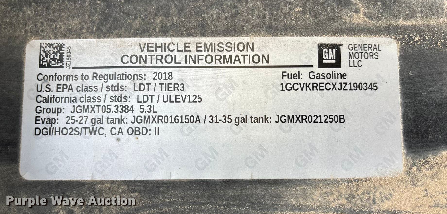 2018 Chevrolet Silverado Ext. Cab pickup truck. Miles: 140,957 on odometer, VIN: 1GCVKRECXJZ190345. Engine Displacement: 5.3L, Cylinders: 8, Fuel type: Gas. Transmission Automatic, Four wheel drive. Interior AC, Heat, Seat: Power driver, Heated mirrors, Power windows, Power locks, Cruise control, Backup camera, Brake controller. Tires Size: 265/65R18. Iowa title. Title distribution may be delayed up to 14 days from verification of funds. AgriVision Equipment Group. Pacific Junction, IA 51561