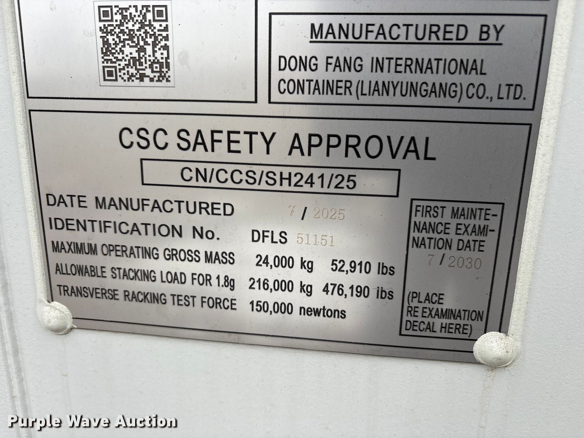 Purple Wave is selling a used Storage or Shipping Container in Ohio. This item is a 2025 Dong Fang SLY23-A15 shipping container with the following: Serial: DFLS51151