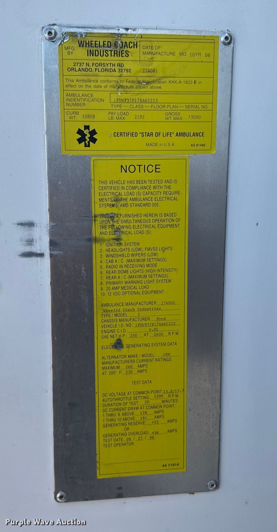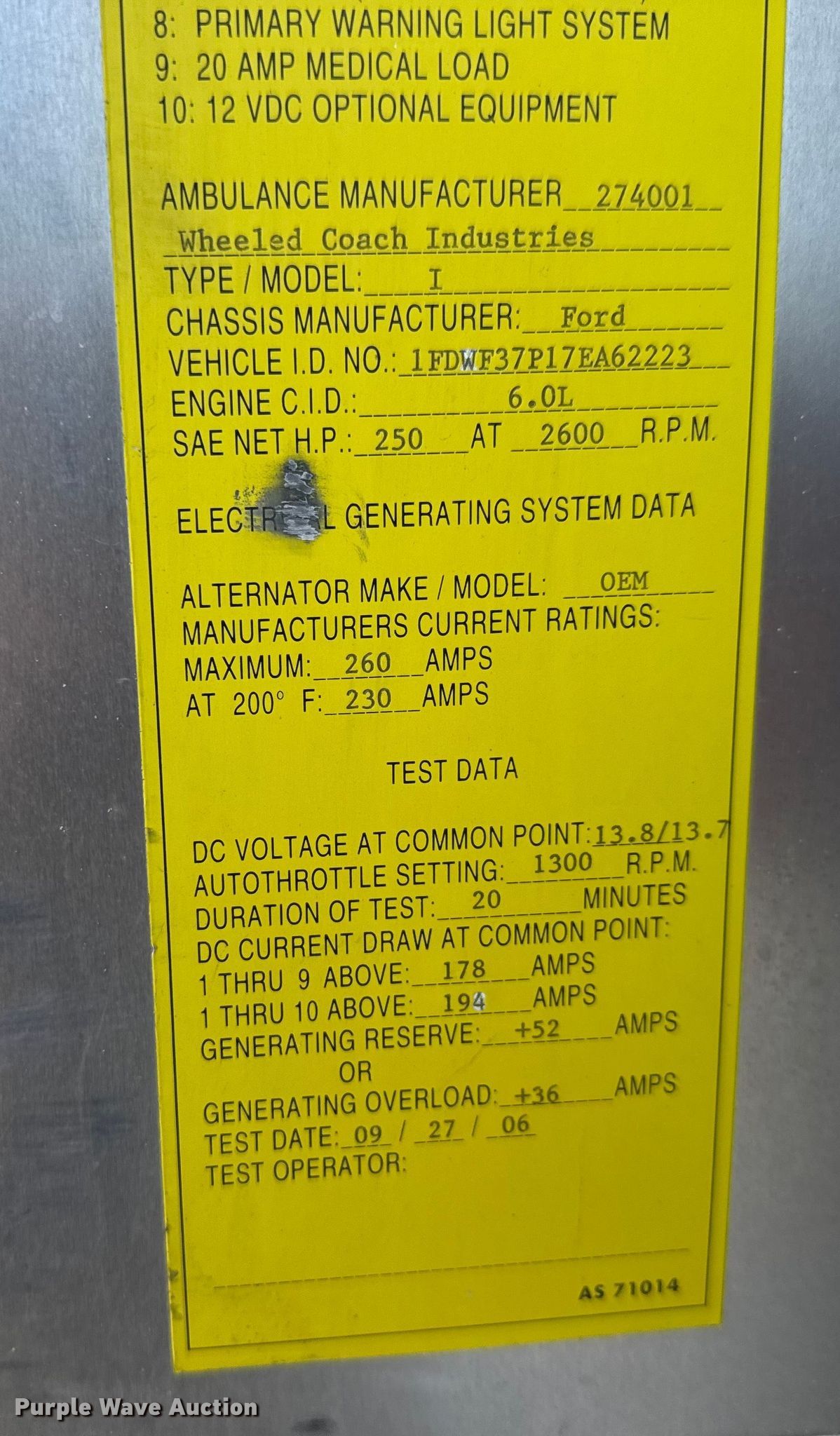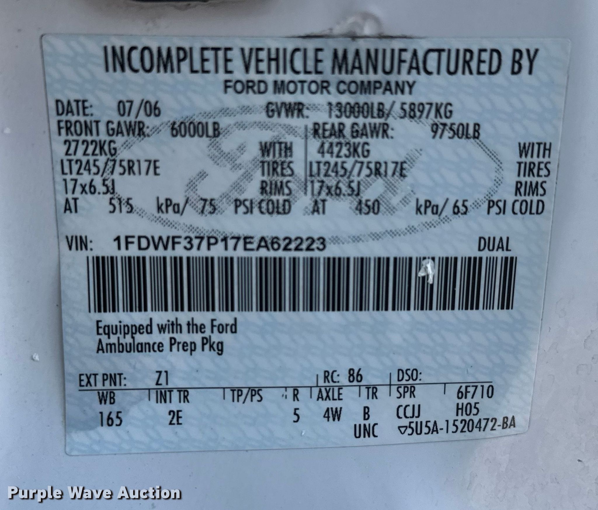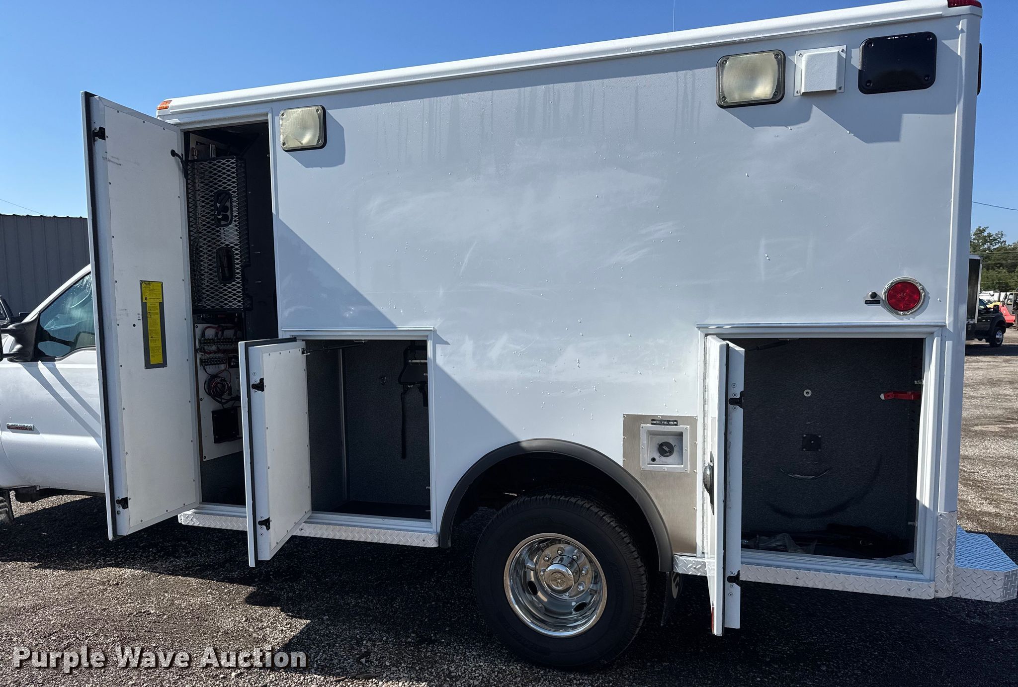 Purple Wave is selling a used Fire Truck or Emergency Vehicle in Oklahoma. This item is a 2007 Ford F350 Super Duty ambulance with the following: Miles: 81,774 on odometer, Hours: 3,860 on meter, VIN: 1FDWF37P17EA62223