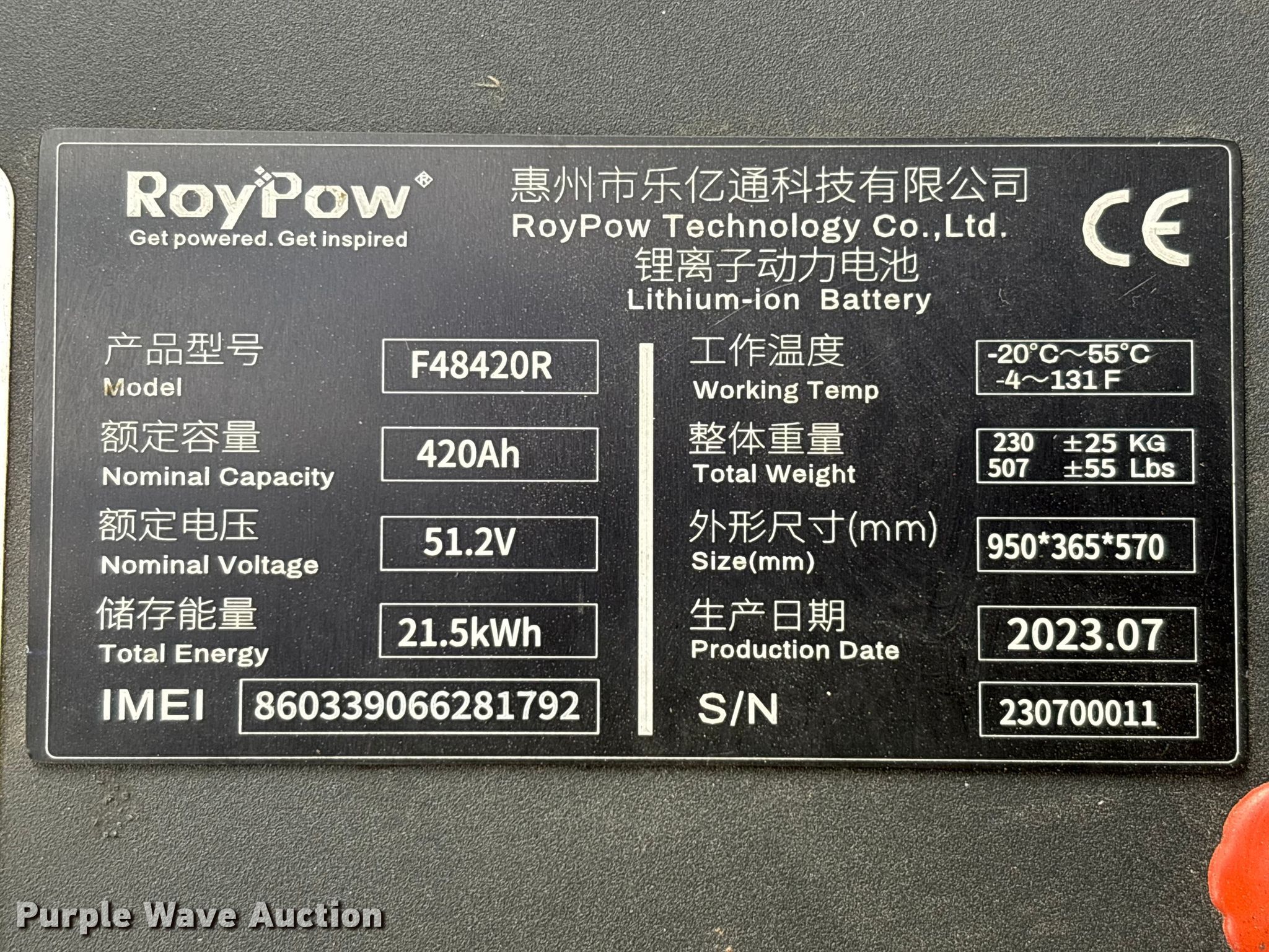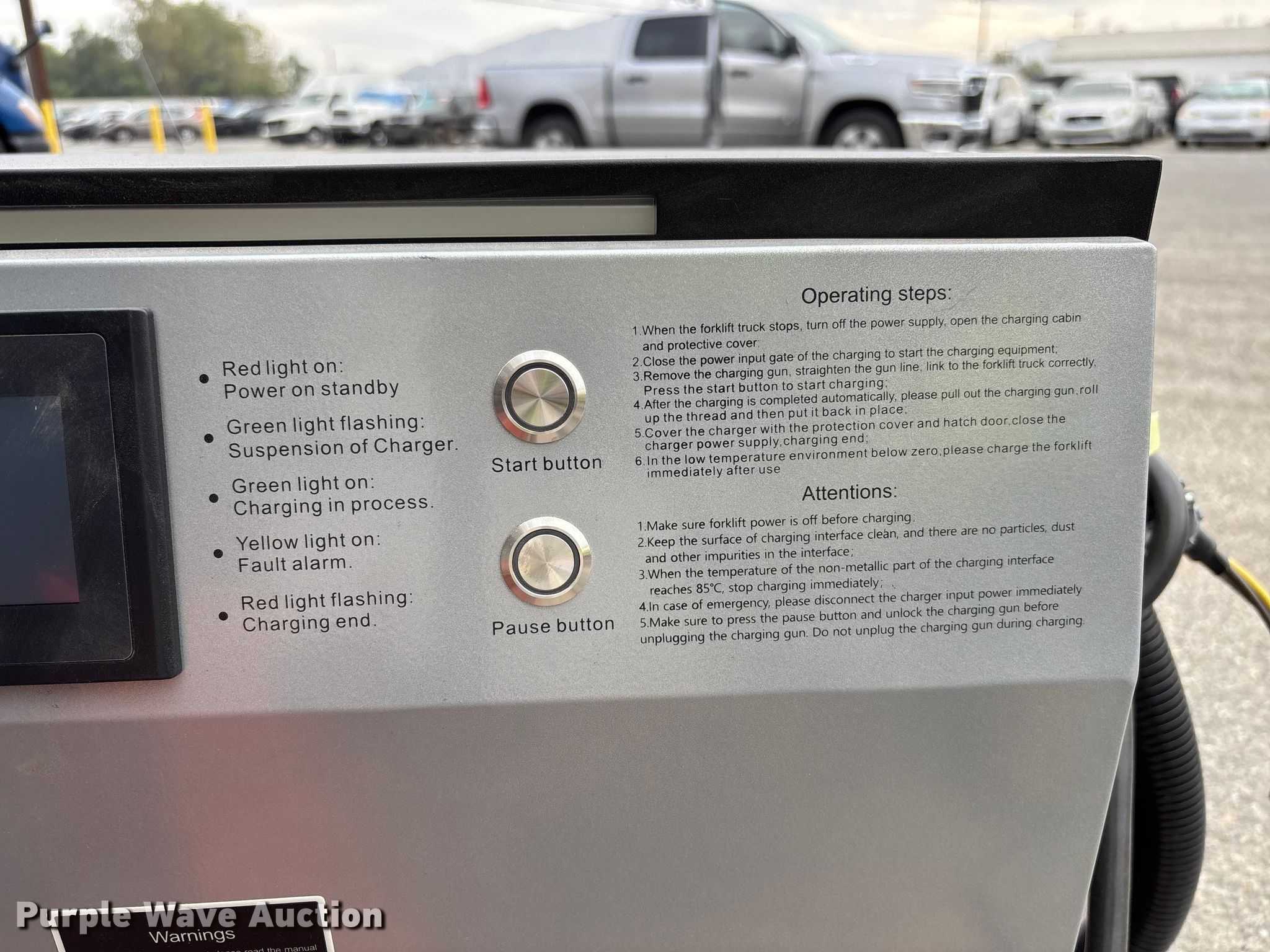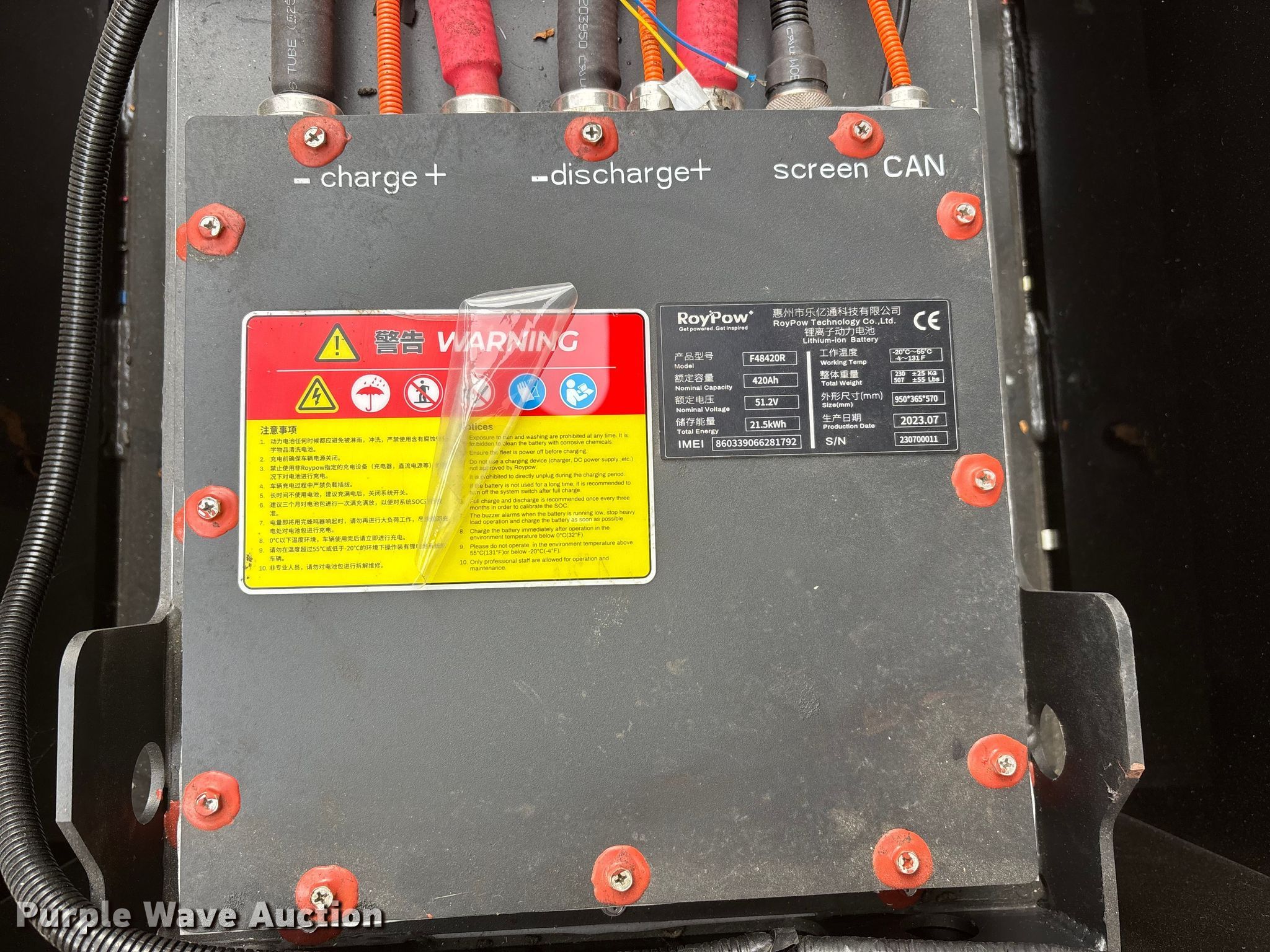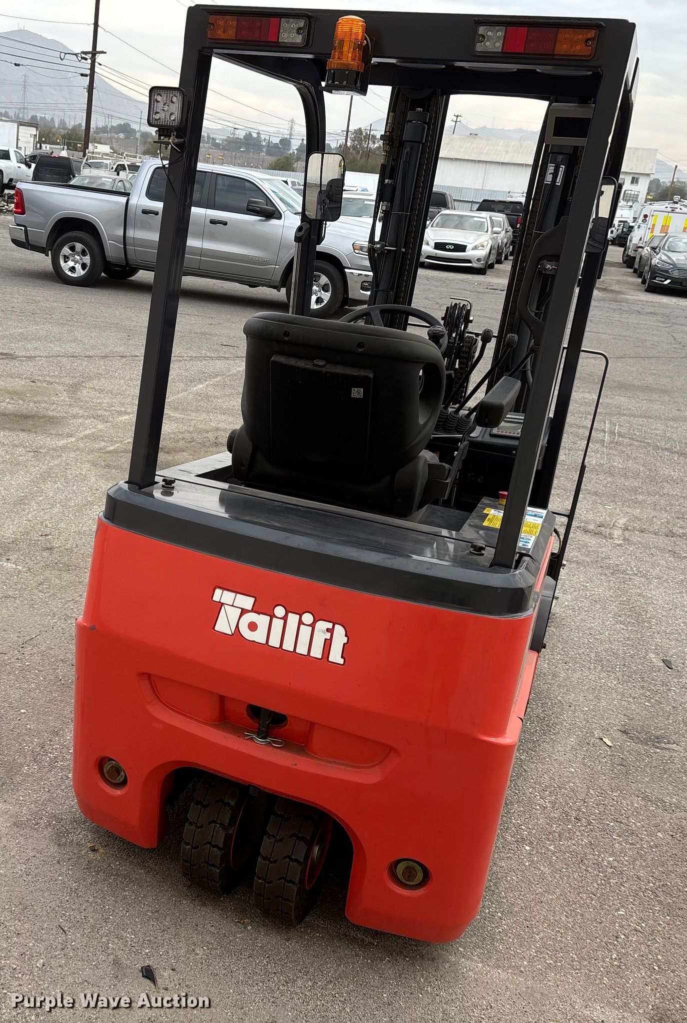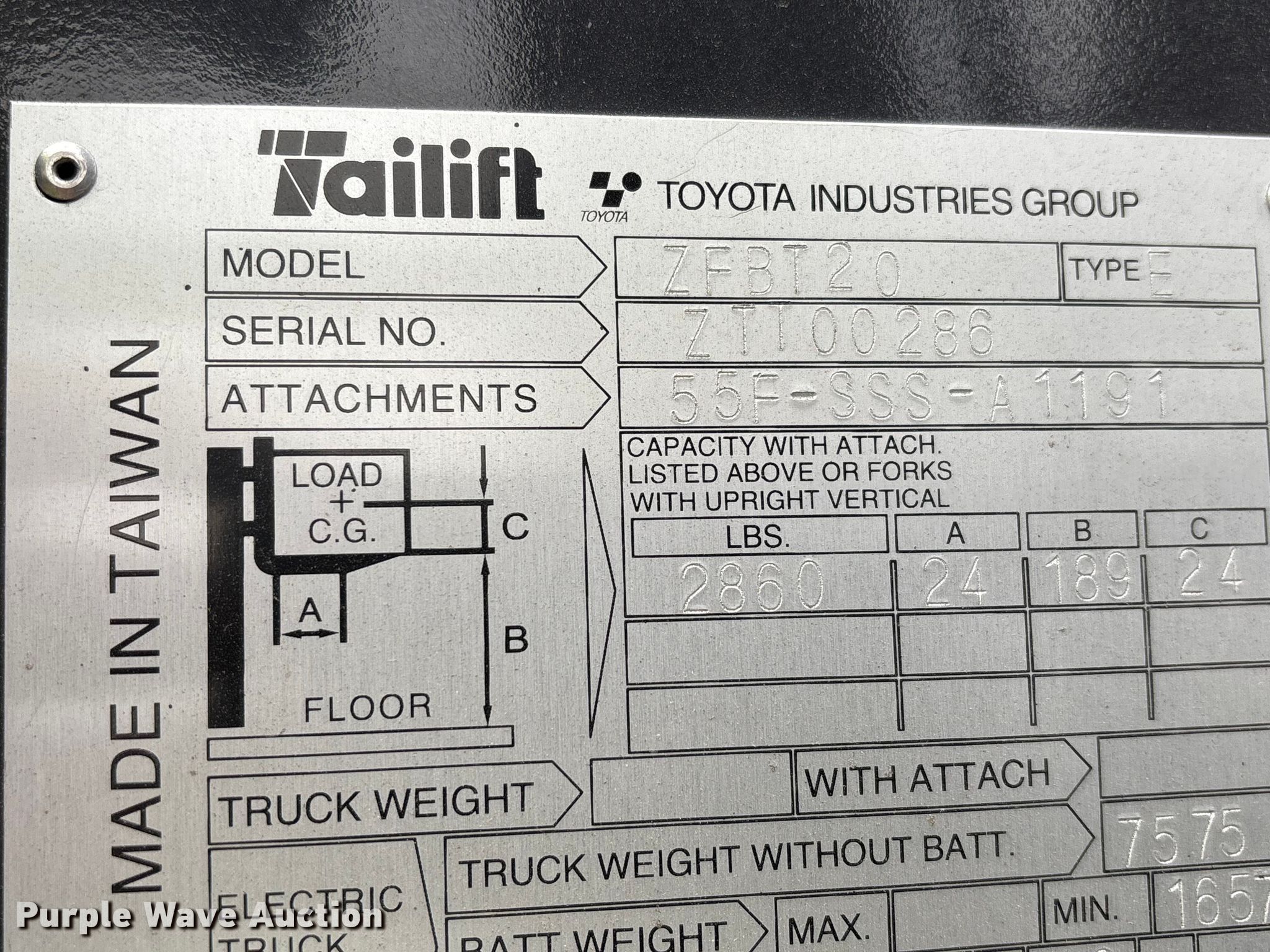 Tailift ZFBT20 forklift. Hours: Unknown, Serial: ZTT00286, Unit #: 70203445. Electric Motor Roy Pow F48420R, Volts: 51.2, Charger: Three phase. Transmission Electric drive. Operators station OROPS. Features Maximum lift capacity: 2,860 lbs, Maximum lift height: 189", Mast stages: 2, Side shift, Mast tilt, Fork length: 48". Tires Front: 18X7-8, Rear: 15X41/2-8, Solid. Notes Dead battery, Unknown operating condition. Repossessed item, stored at a secured facility. Please review REQUIRED REMOVAL INSTRUCTIONS. Lender Owned. Colton, CA 92324