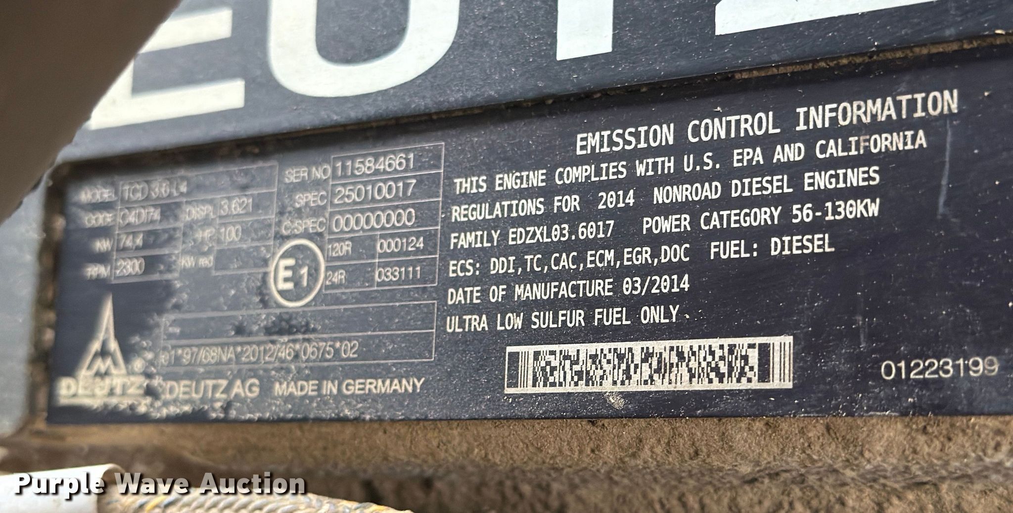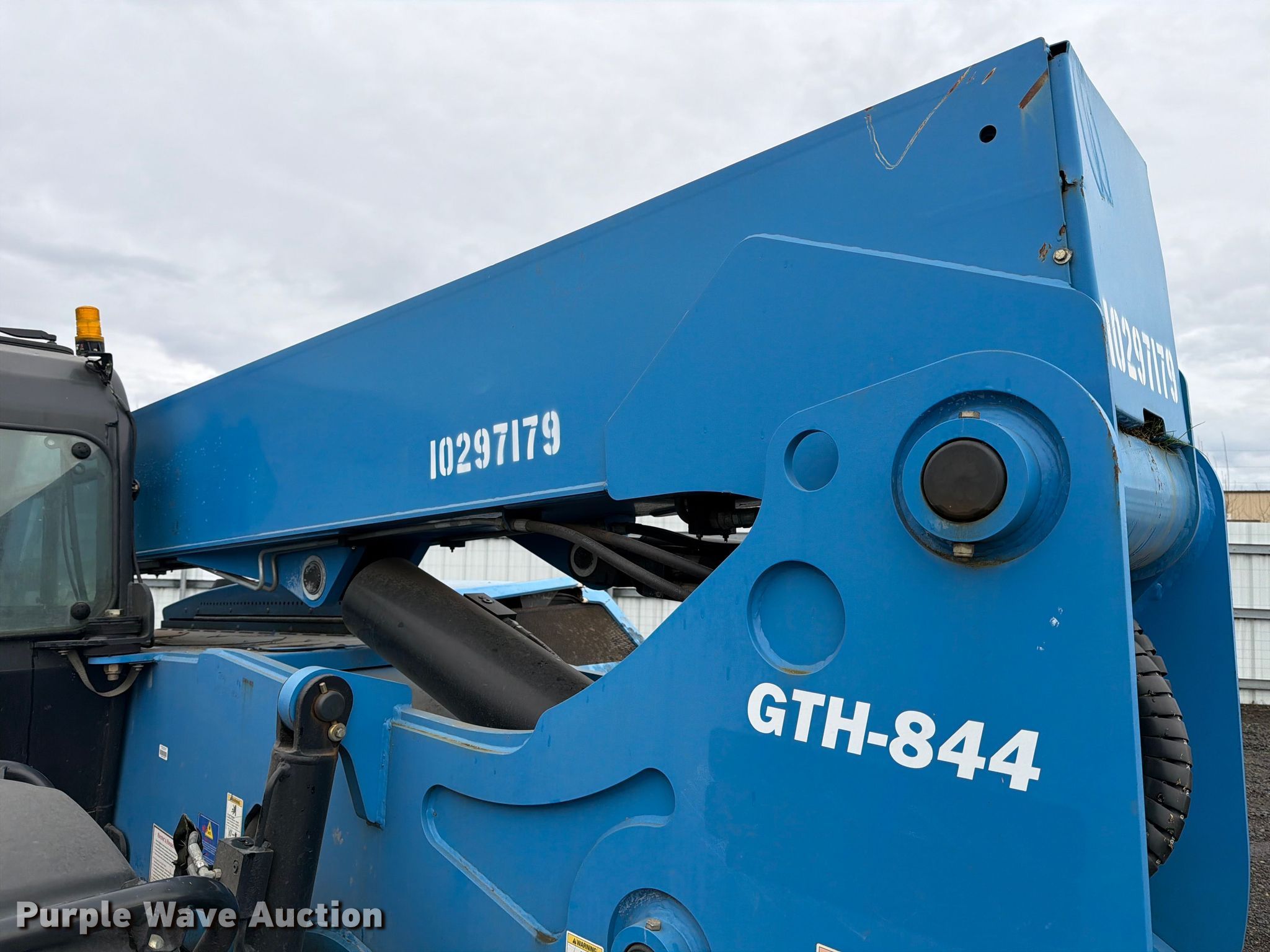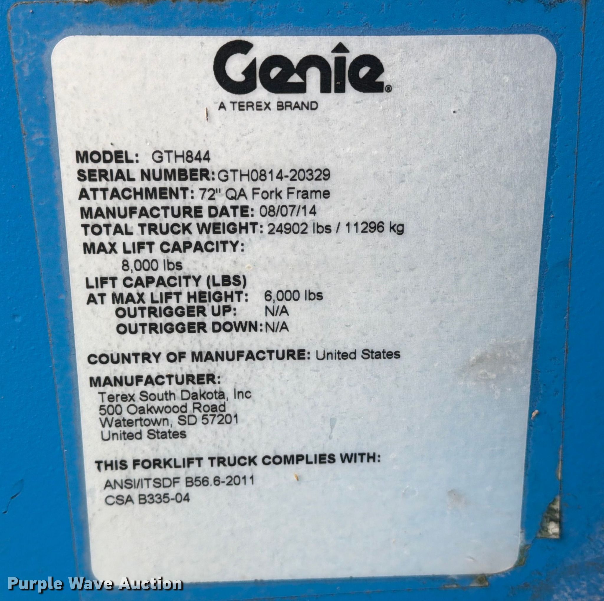 2014 Genie GTH-844 telehandler. Hours: 2,565 on meter, Serial: GTH081420329, Unit #: 95956125. Engine Deutz TCD 3.6 L4, Serial: 11584661, Displacement: 3.621L, Cylinders: 4, Fuel type: Diesel. Transmission Powershift, 3F - 3R, Four wheel drive. Operators station Enclosed cab, AC, Heat, Steering: Crab, Four wheel. Features Maximum lift capacity: 8,000 lbs, Maximum lift height: 44', Boom stages: 3, Fork length: 30", Auxiliary hydraulics, Hydraulic leveling, Quick attach: Manual. Tires Size: 13.00-24, Foam filled. Notes Glass missing. Repossessed item, stored at a secured facility. Please review REQUIRED REMOVAL INSTRUCTIONS. Lender Owned. 2885 National Way. Woodburn, OR 97071