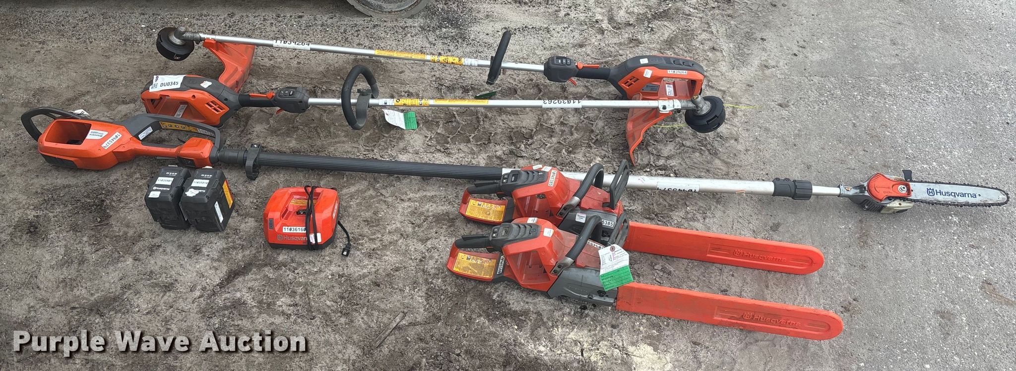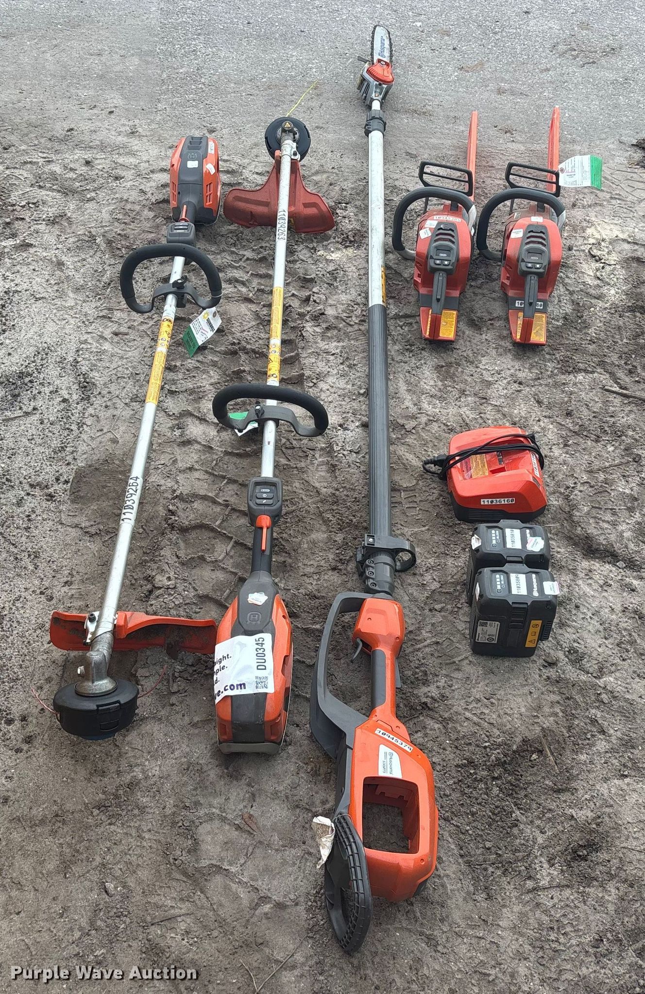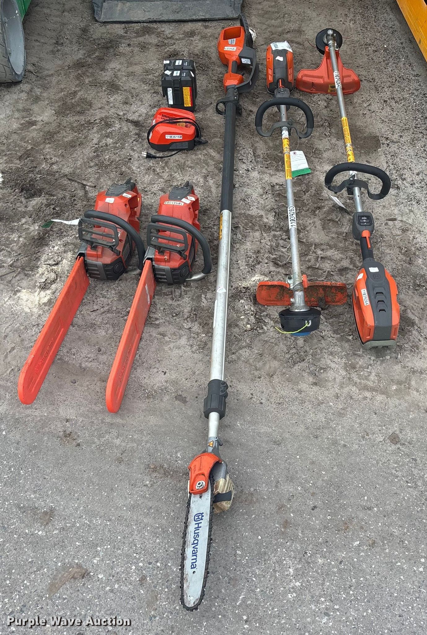 Lawn equipment. (2) Husqvarna 525iLST string trimmers. Unit #: 11039264, 11039263. (2) Husqvarna BLi300 batteries Unit #: 11035809, 11035810. (2) Husqvarna 540i XP chainsaws Unit #: 10945380, 10945385. Husqvarna 530iPTS pole saw Unit #: 10945379. Husqvarna QC330 charger Unit #: 11036160. Sunbelt Rentals. Palatka, FL 32177