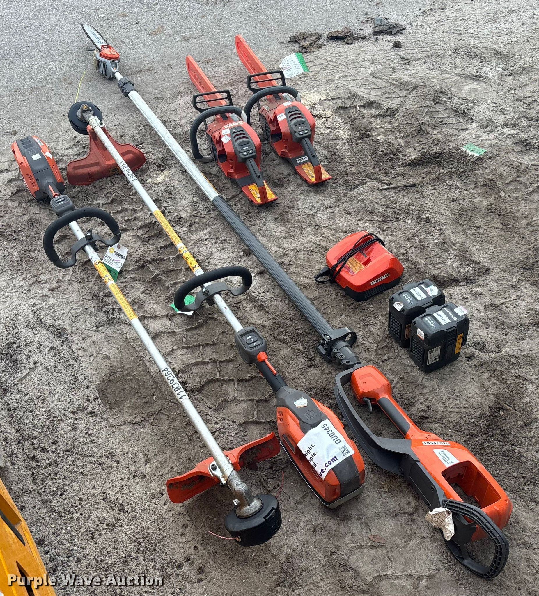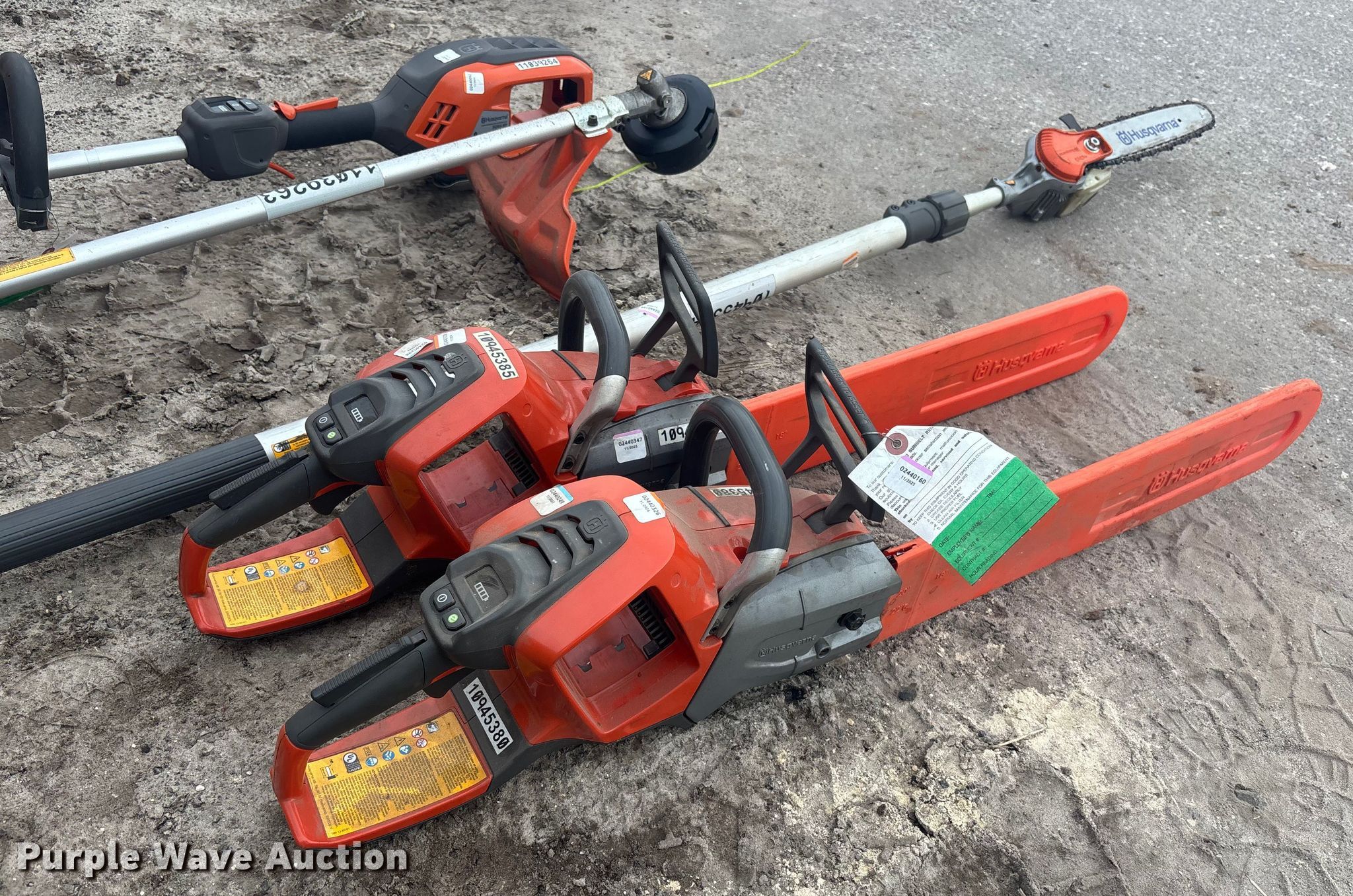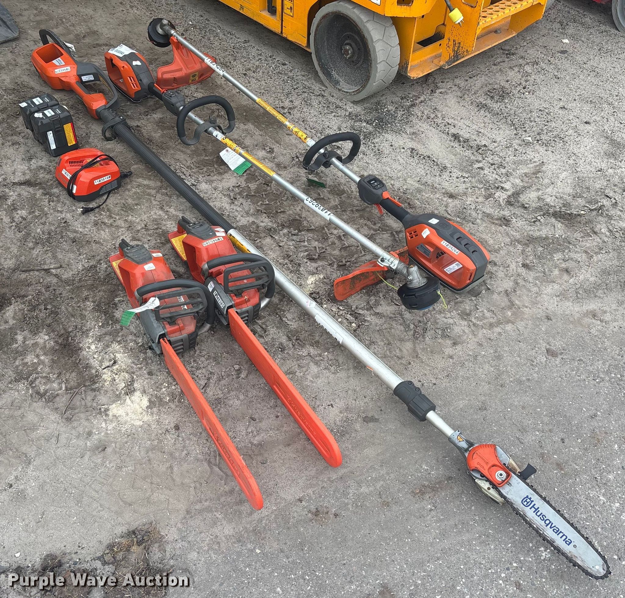 Lawn equipment. (2) Husqvarna 525iLST string trimmers. Unit #: 11039264, 11039263. (2) Husqvarna BLi300 batteries Unit #: 11035809, 11035810. (2) Husqvarna 540i XP chainsaws Unit #: 10945380, 10945385. Husqvarna 530iPTS pole saw Unit #: 10945379. Husqvarna QC330 charger Unit #: 11036160. Sunbelt Rentals. Palatka, FL 32177