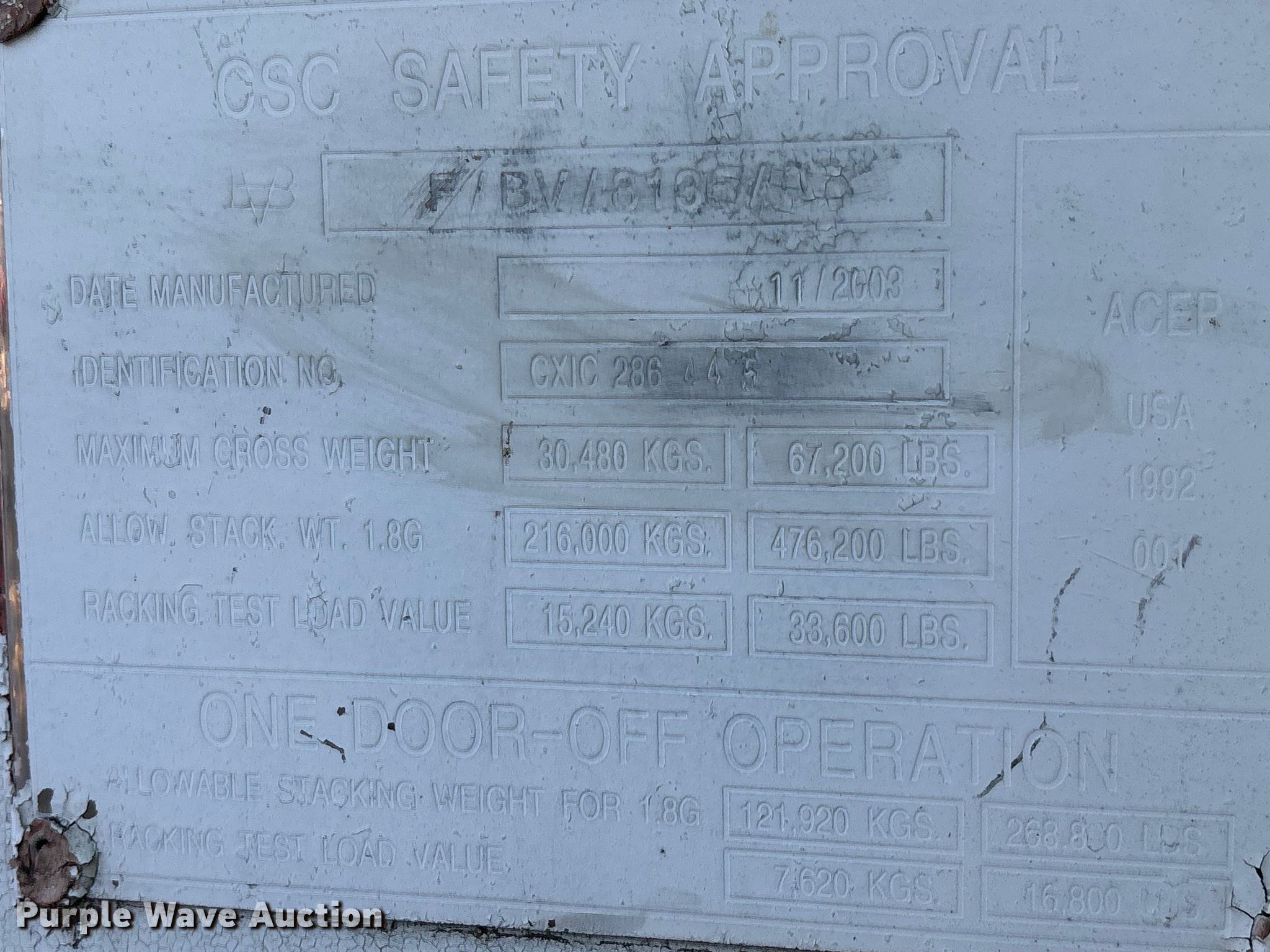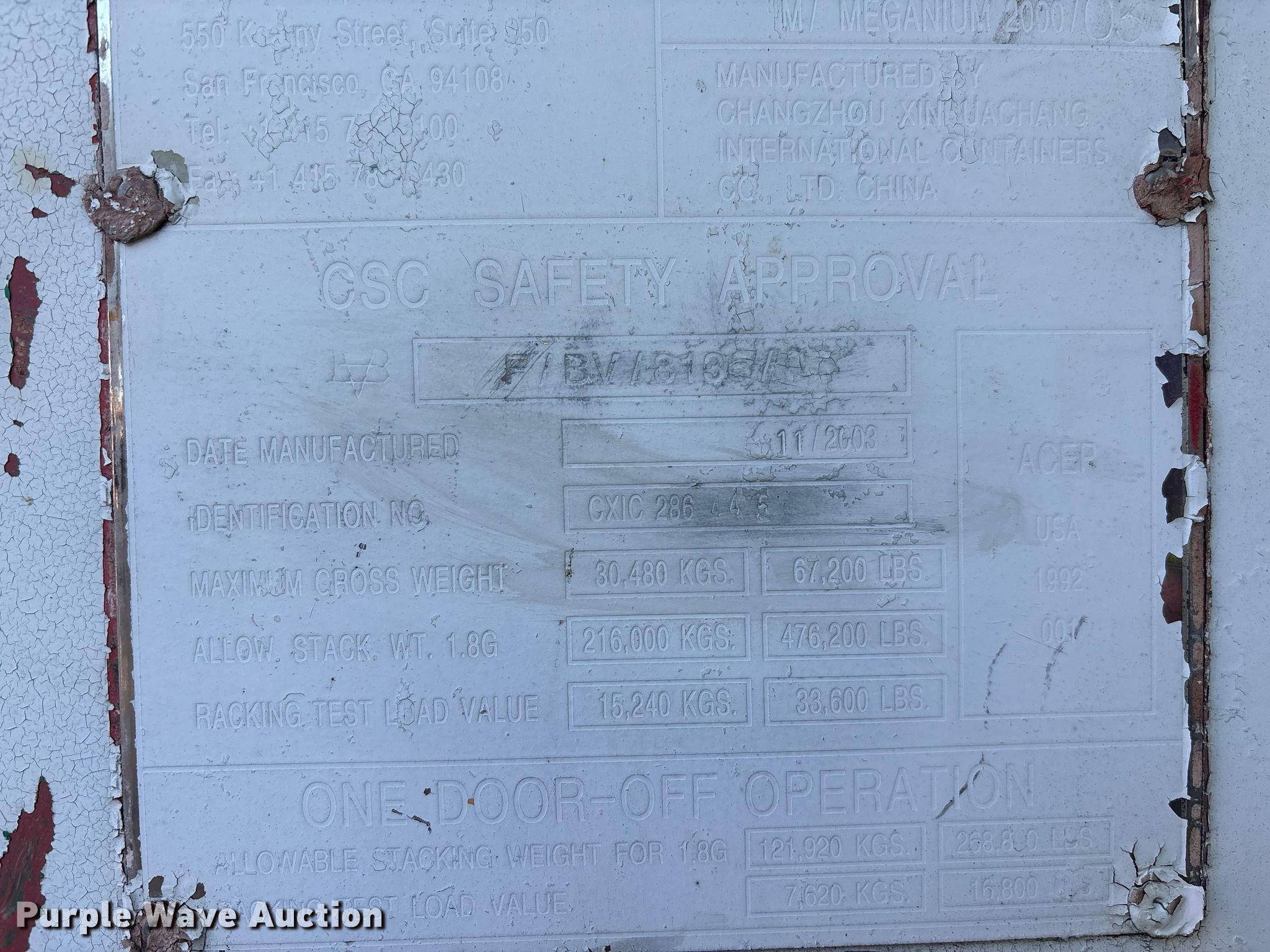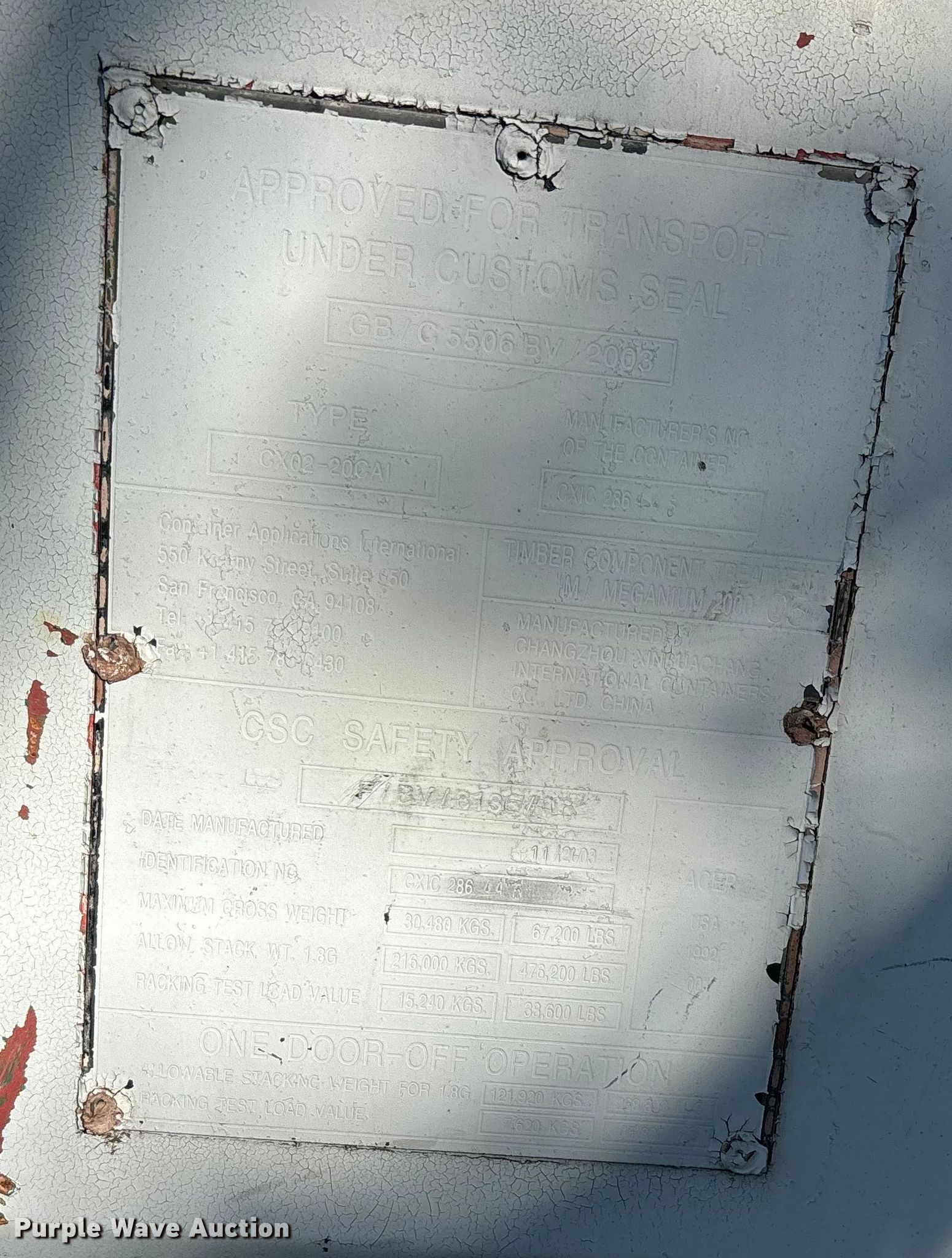 Purple Wave is selling a used Storage or Shipping Container in California. This item is a Shipping container with the following: Overall, Length: 20'