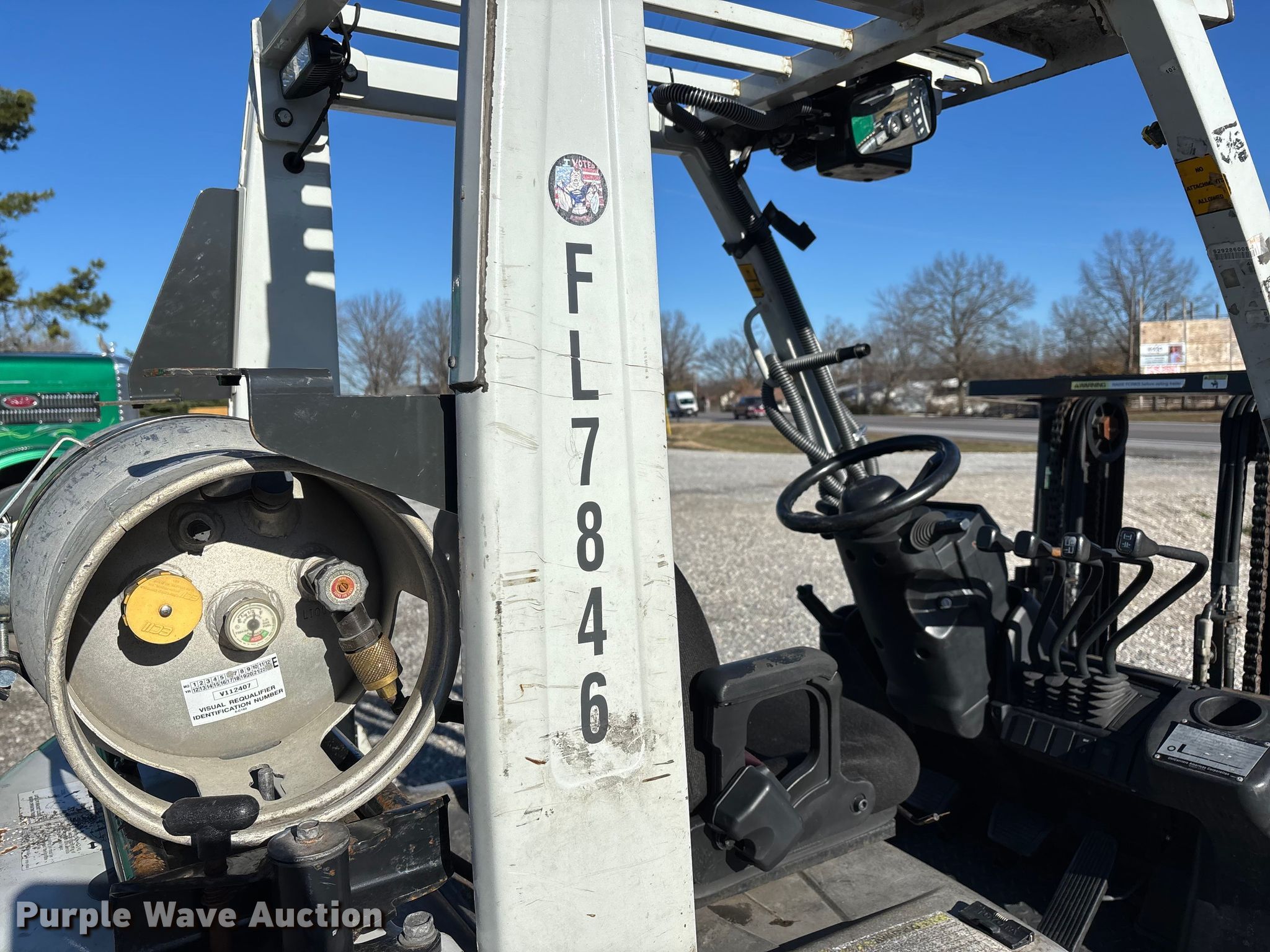 Nissan MCP1F2A20LV forklift. Hours: Unknown, Serial: CP1F2-9W2366, Unit #: FL7846. Engine GCT DNFXB02.147D, Displacement: 2.1L, Cylinders: 4, Fuel type: LPG LP bottle: Included. Transmission Shuttle shift. Features Maximum lift capacity: 4,000 lbs, Maximum lift height: 80", Mast stages: 2, Side shift, Mast tilt. Tires Front: 21x7x15, Rear: 413/152-285.8, Solid. Notes Dead battery. Marion, IL 62959