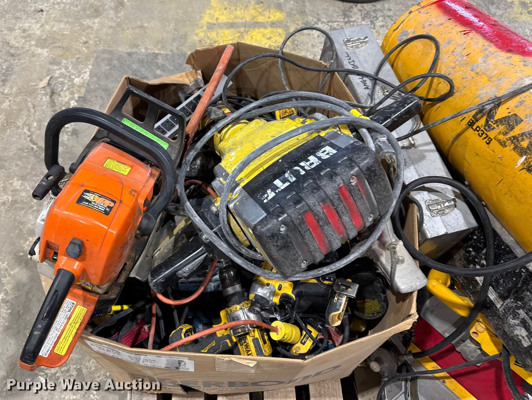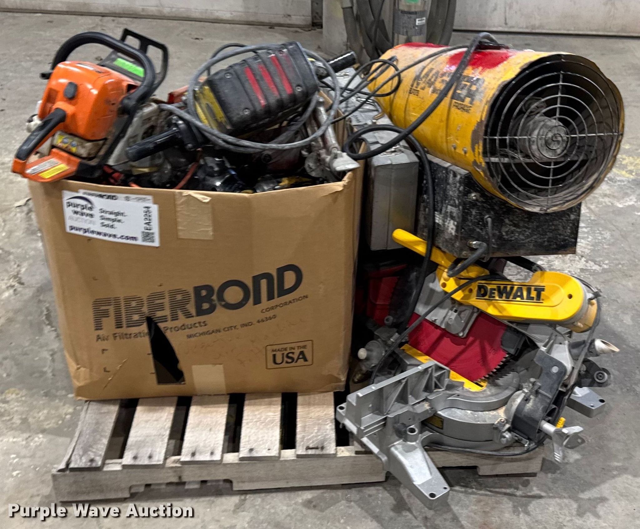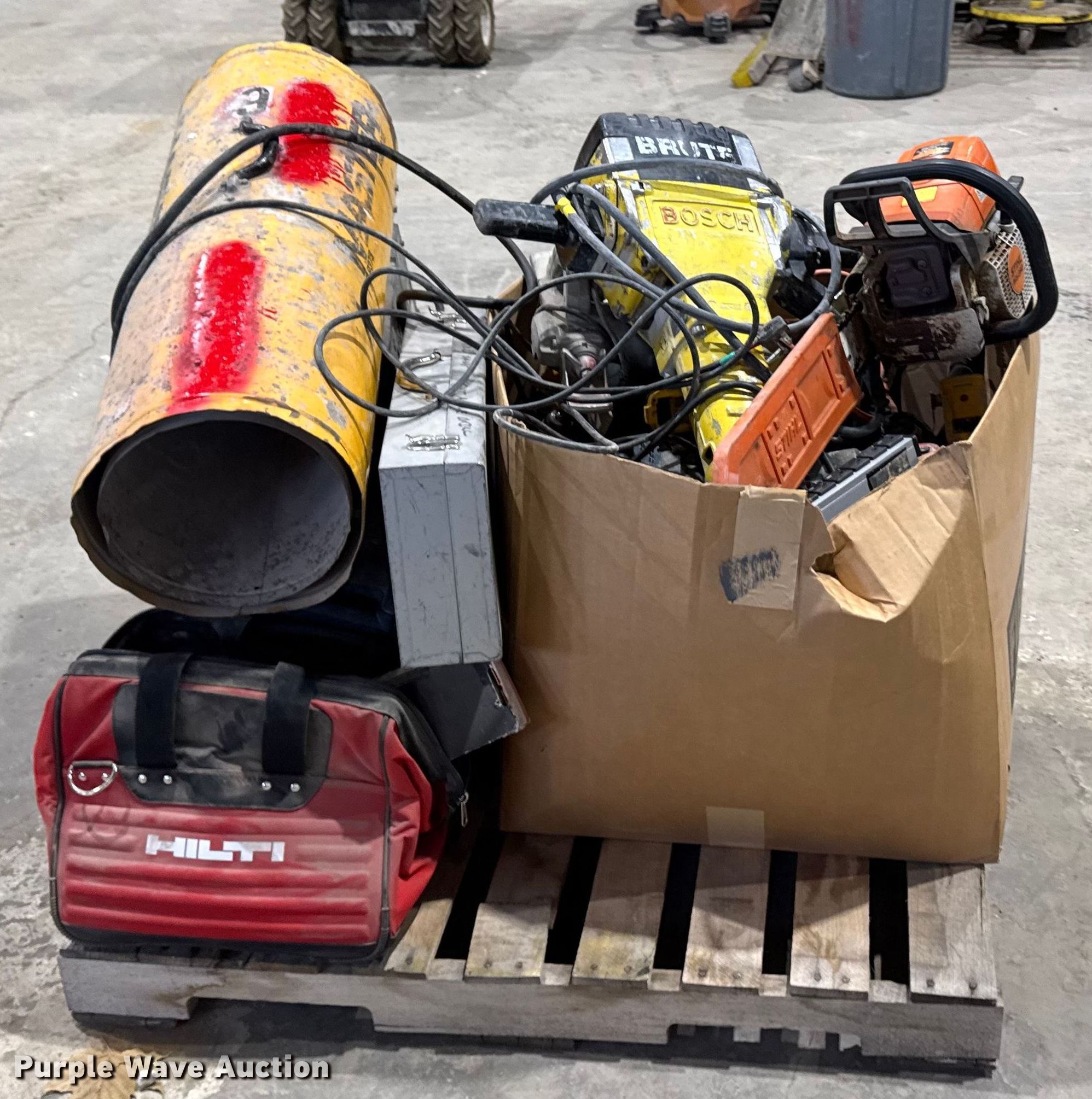 Purple Wave is selling a used Tools in Iowa. This item is a Tools with the following: Hand tools, Drills, Saws, Jack hammer, LP heater