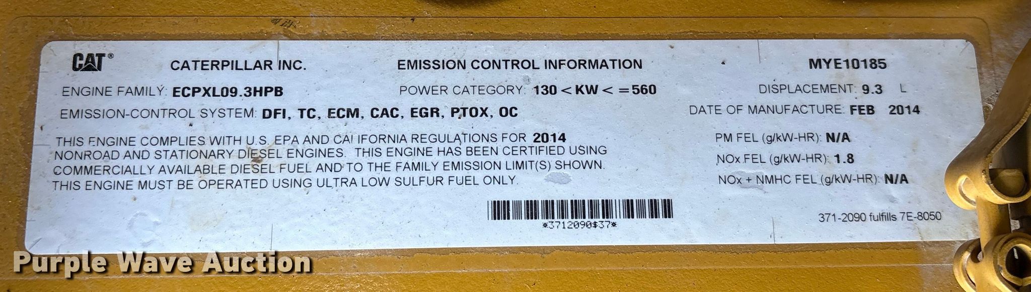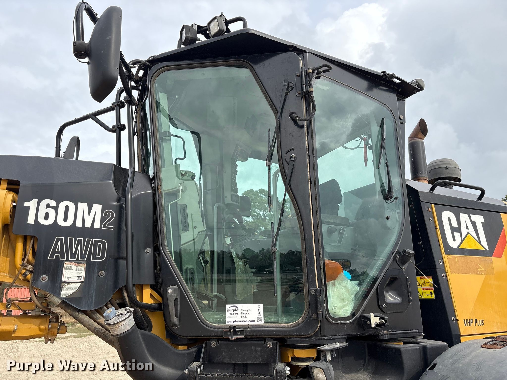 2014 Caterpillar 160M2 motor grader. Hours: 5,473 on meter, Serial: CAT0160MTR9T00310. Engine Cat ECPXL09.3HPB, Displacement: 9.3L, Cylinders: 6, Fuel type: Diesel. Transmission Powershift. Chassis All wheel drive, Differential lock. Operators station Enclosed cab, AC, Heat, Backup camera, Steering: Joystick. Features Moldboard: Tip control, Side shift, Blade accumulators, Rear ripper Ripper shanks: 3, Scarifier teeth: 6. Tires Size: 17.5T25, Brand: Maxam. Wallisville, TX 77597