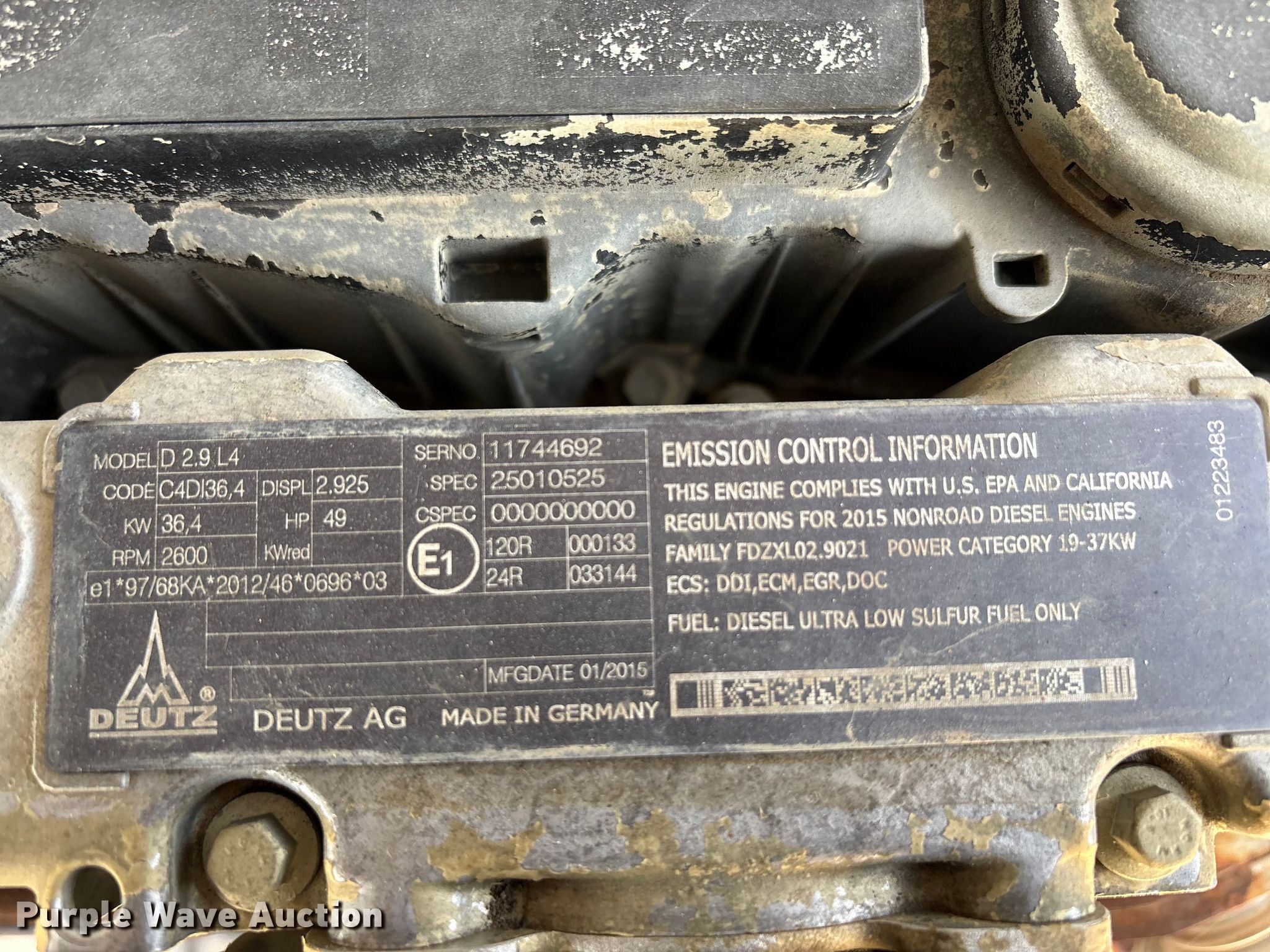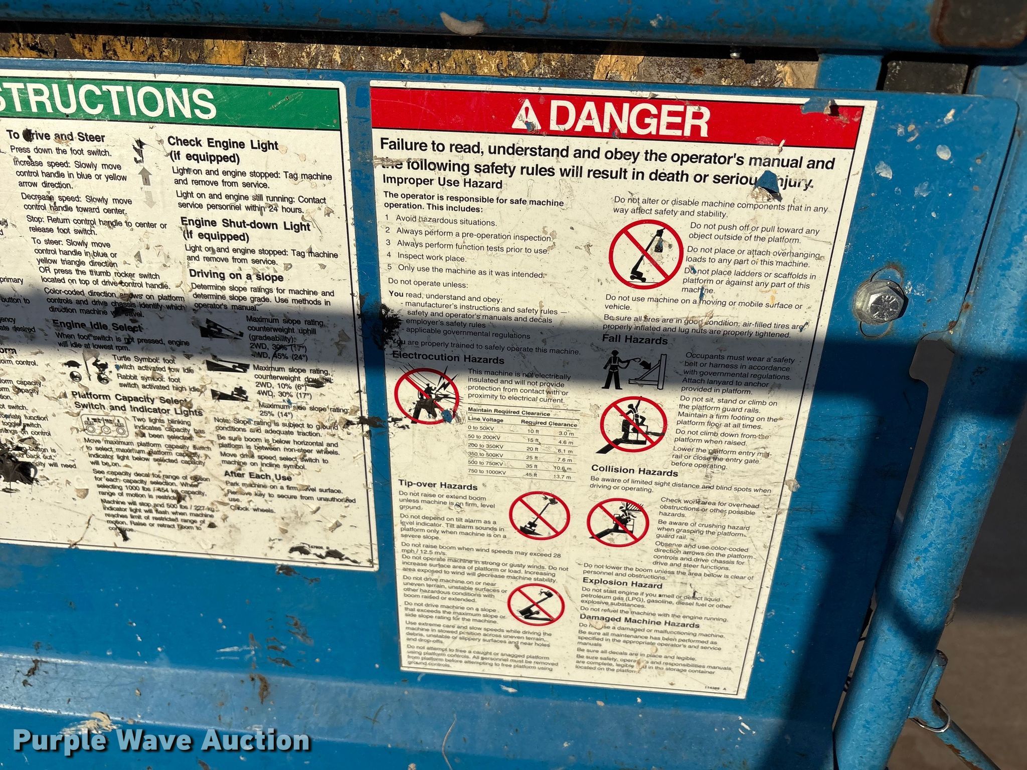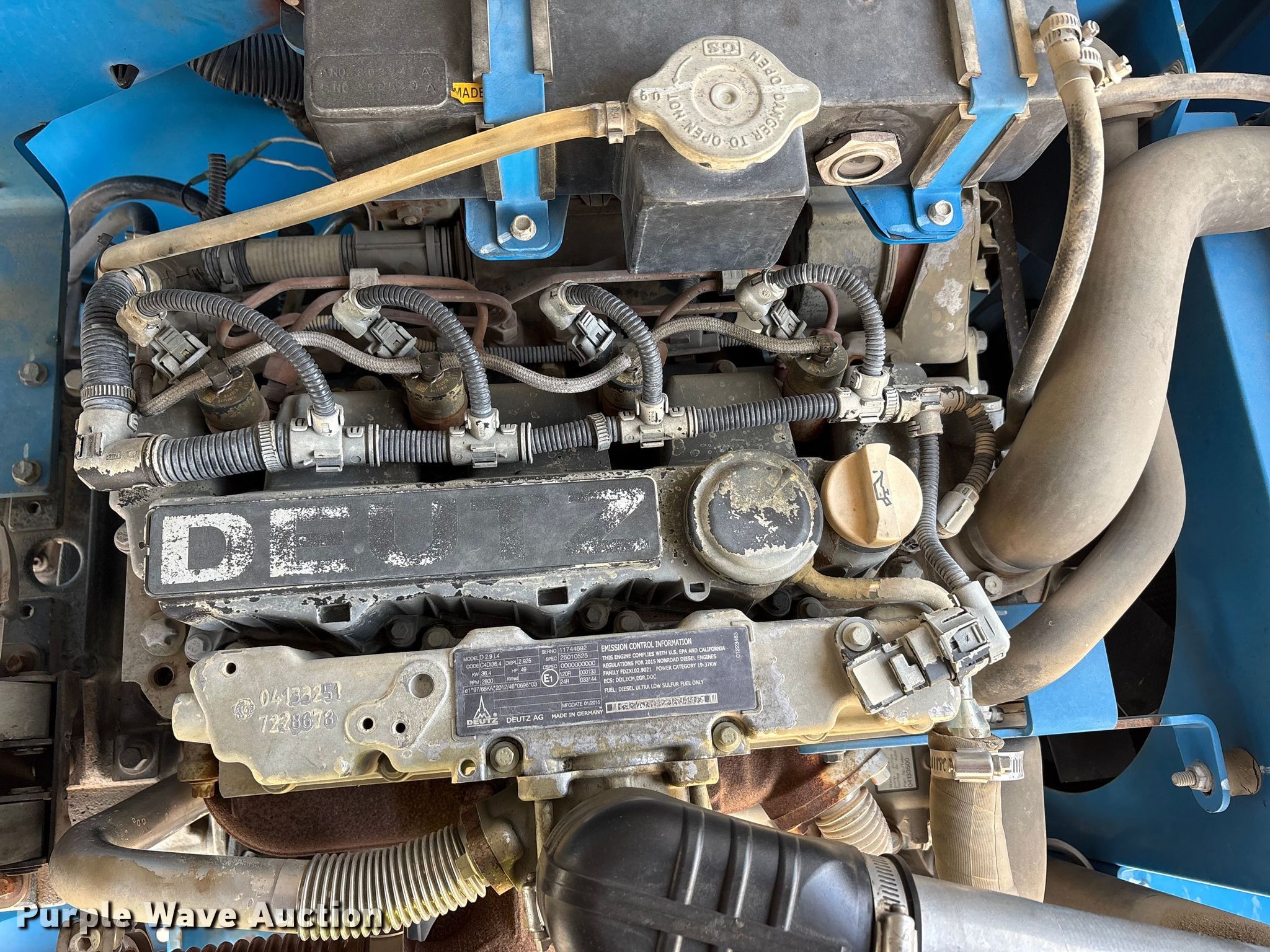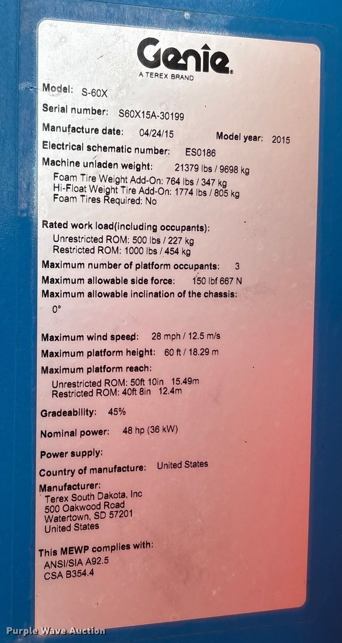 2015 Genie S-60X boom lift. Hours: 4,570 on meter, Serial: S60X15A30199, Unit #: 144583. Engine Deutz D2.9L4, Serial: 11744692, Displacement: 2.9L, Cylinders: 4, Fuel type: Diesel, HP: 49. Chassis Four wheel drive. Features Rough terrain, Boom type: Articulating, Telescopic, Maximum lift capacity: 1,000 lbs, Maximum reach length: 50' 10", Maximum lift height: 60', Hydraulic leveling, Platform: 93" L x 33" W, AC power outlet, Controls: Platform, Ground, Platform rotation: Hydraulic, Safety alarm. Tires Tire size: 355/55D625, Foam filled. Notes Possible engine issues Intermittent low power issues , Intermittent fuel codes. Sunstate. Fort Worth, TX 76134