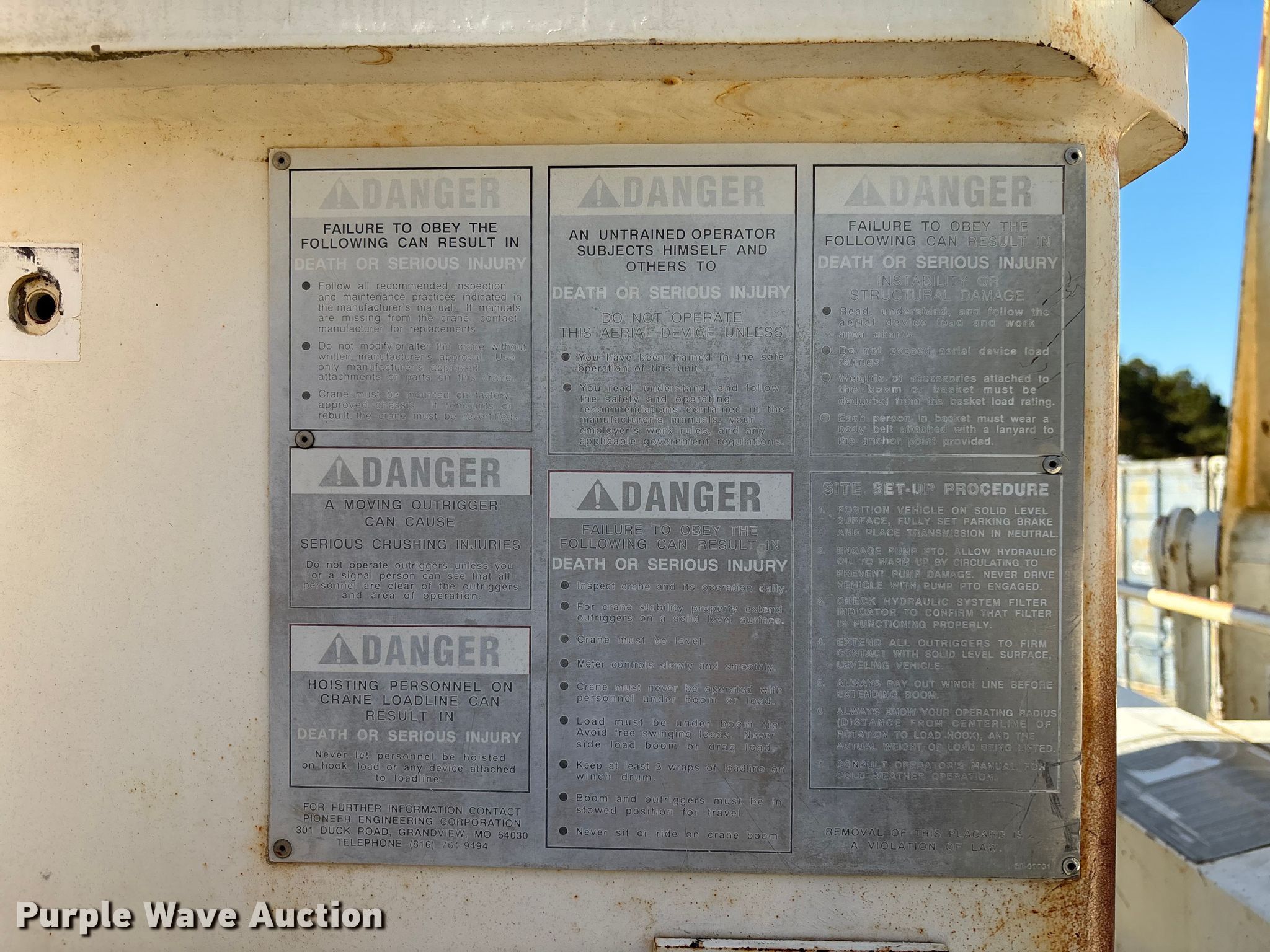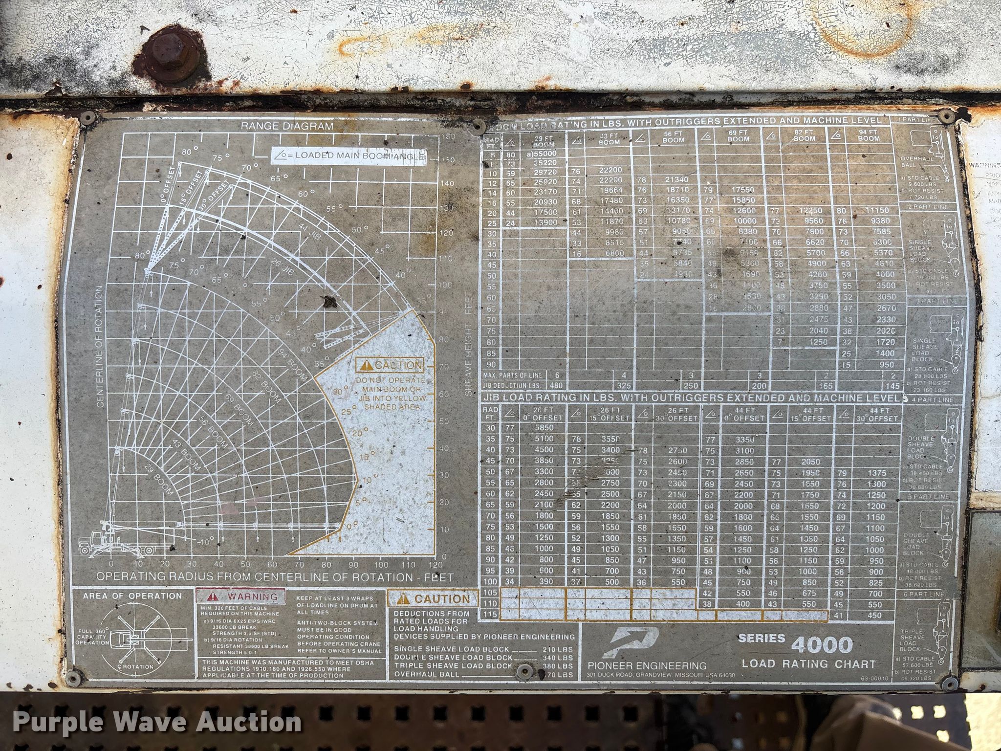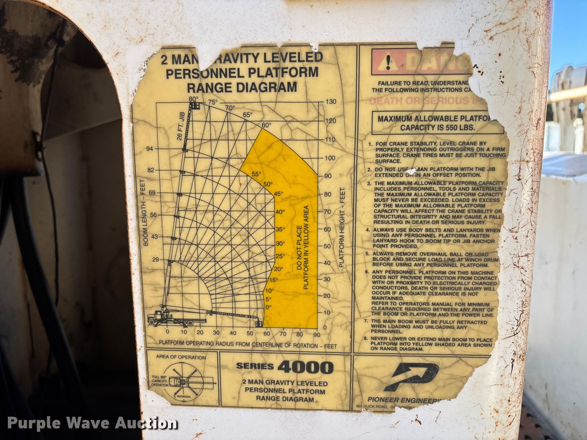 1998 Ford LNT8000 crane truck. Kilometers: 78,884 on odometer, Hours: 12,206 on meter, VIN: 1FDZX86F7WVA33680. Engine Caterpillar 3126, Displacement: 7.2L, Cylinders: 6, Fuel type: Diesel. Transmission Eaton Fuller RT/RTO-8 LL, Manual, Speed: 10. Chassis Axles: Tandem, Differential lock: Full, Suspension: Spring over walking beam, Brakes: Air, PTO, GVWR: 66,000 lbs FAWR: 20,000 lbs, RAWR: 46,000 lbs. Interior AC, Heat, Cruise control. Features Bed Flatbed, KNAPHEIDE, Length: 18' 3", Width: 96", Crane 1998 Pioneer 4000, Boom Telescopic, Maximum boom length: 94' Sections: 4, Maximum lift capacity: 55,000 lbs, Jib: 44' Sections:2, Boom controls Ground, Sheaves: 3, Capacity: 28 tons, Crane ball & hook, Manuals, Lift chart, Man basket. Tires Front: 425/65R22.5, Rear: 11R22.5. Notes Remote missing, Dash warning indicator: Coolant light flashes, Possible pump issues, Coolant leak, Non-operational AC, Unknown operating condition , Unit must be towed or hauled. South Carolina title. Title distribution may be delayed up to 14 days from verification of funds. American Steel Erectors Inc. Aiken, SC 29805