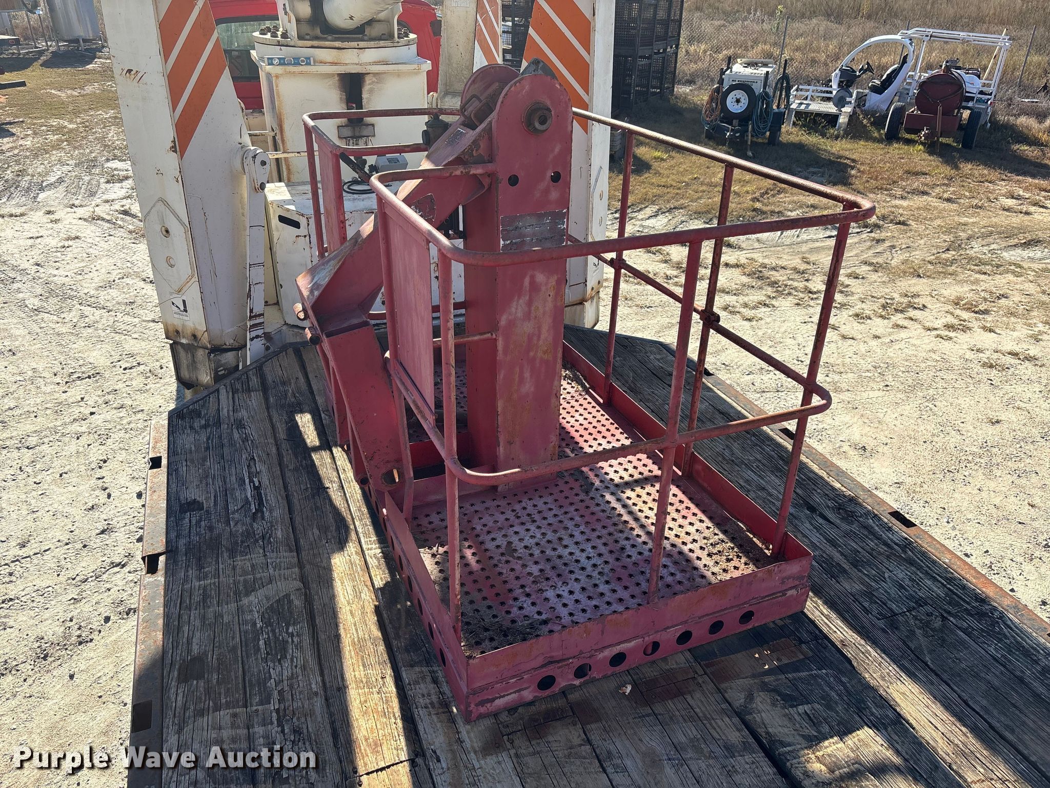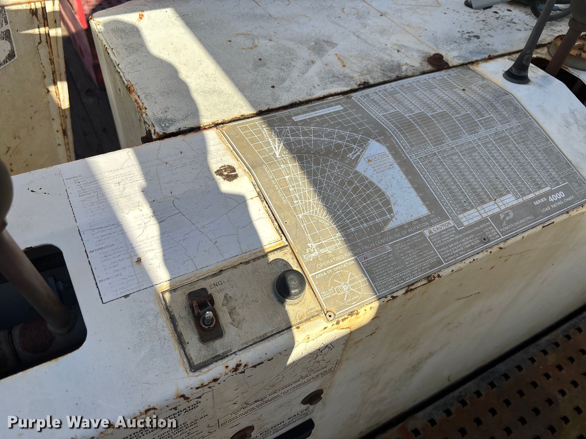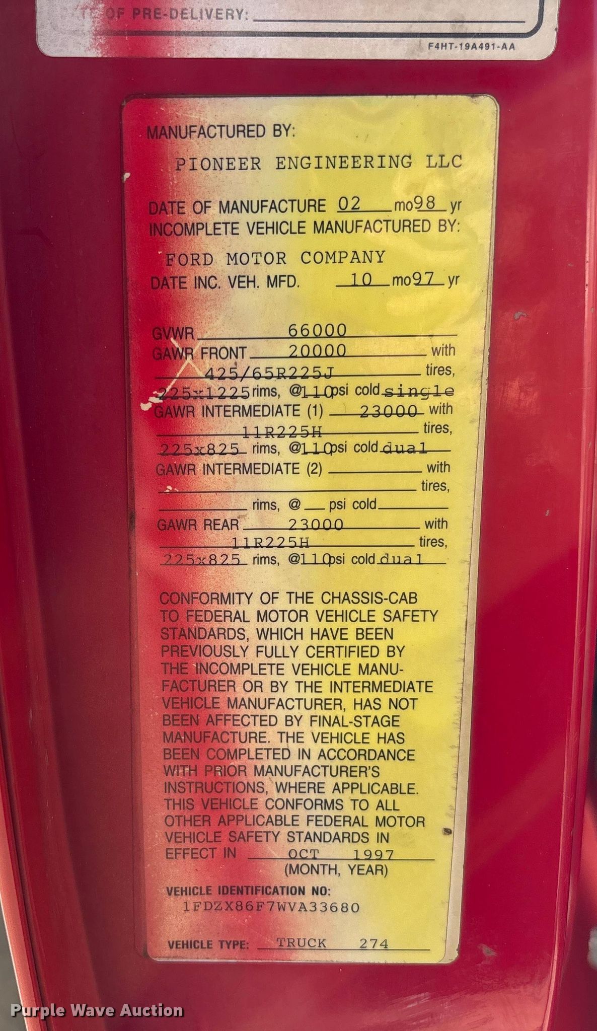 1998 Ford LNT8000 crane truck. Kilometers: 78,884 on odometer, Hours: 12,206 on meter, VIN: 1FDZX86F7WVA33680. Engine Caterpillar 3126, Displacement: 7.2L, Cylinders: 6, Fuel type: Diesel. Transmission Eaton Fuller RT/RTO-8 LL, Manual, Speed: 10. Chassis Axles: Tandem, Differential lock: Full, Suspension: Spring over walking beam, Brakes: Air, PTO, GVWR: 66,000 lbs FAWR: 20,000 lbs, RAWR: 46,000 lbs. Interior AC, Heat, Cruise control. Features Bed Flatbed, KNAPHEIDE, Length: 18' 3", Width: 96", Crane 1998 Pioneer 4000, Boom Telescopic, Maximum boom length: 94' Sections: 4, Maximum lift capacity: 55,000 lbs, Jib: 44' Sections:2, Boom controls Ground, Sheaves: 3, Capacity: 28 tons, Crane ball & hook, Manuals, Lift chart, Man basket. Tires Front: 425/65R22.5, Rear: 11R22.5. Notes Remote missing, Dash warning indicator: Coolant light flashes, Possible pump issues, Coolant leak, Non-operational AC, Unknown operating condition , Unit must be towed or hauled. South Carolina title. Title distribution may be delayed up to 14 days from verification of funds. American Steel Erectors Inc. Aiken, SC 29805
