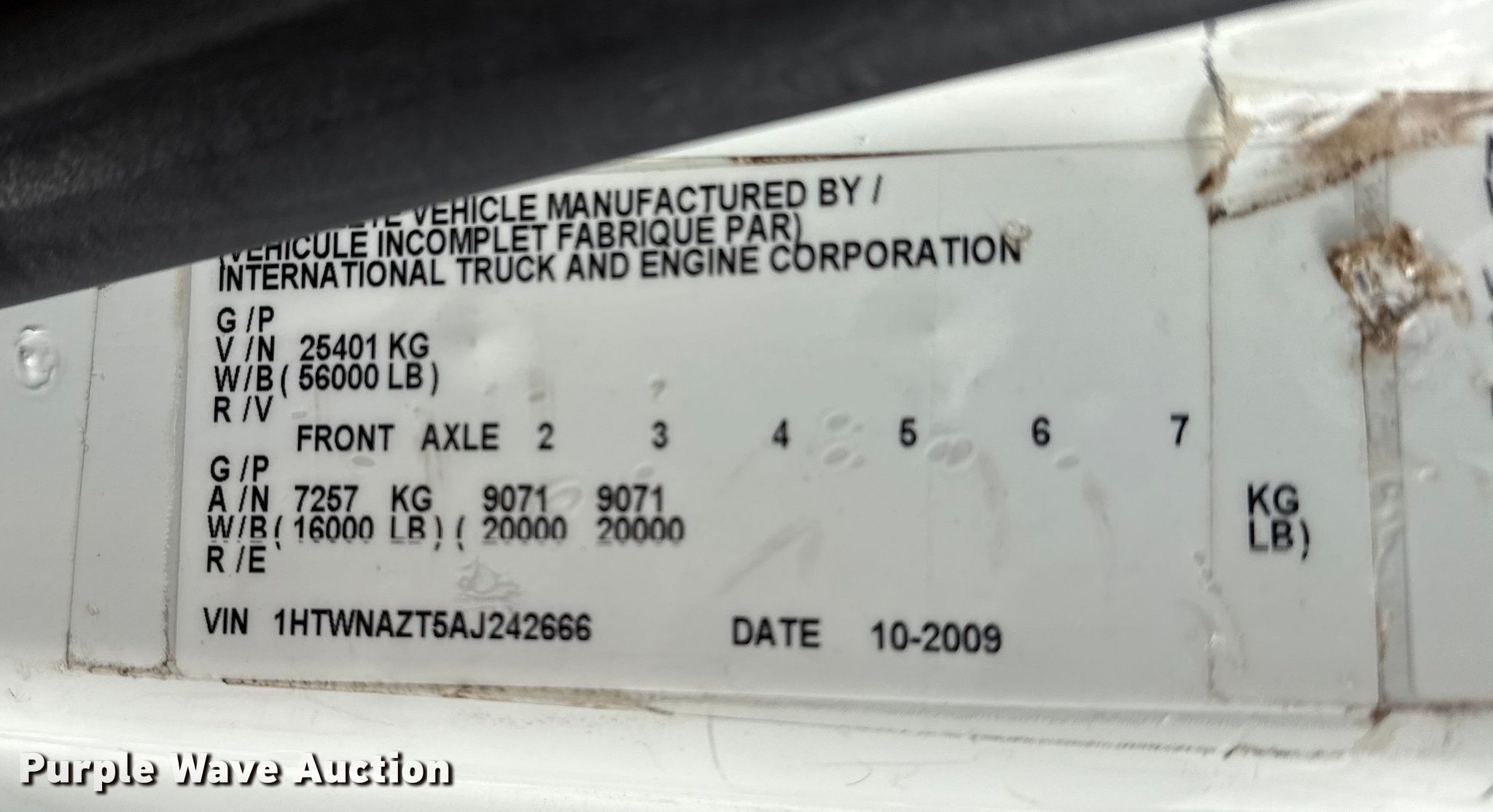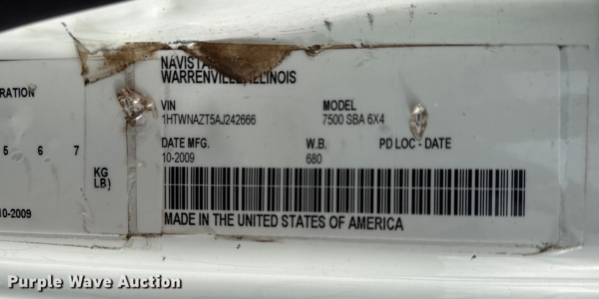 2010 International 7500 crane truck. Miles: 211,988 on odometer, Hours: 14,978 on meter, VIN: 1HTWNAZT5AJ242666. Engine International Maxxforce 10, Displacement: 9.3L, Cylinders: 6, Fuel type: Diesel, Engine brake. Transmission Eaton Fuller 8LL, Manual, Speed: 10. Chassis Hi-rail system, Axles: Tandem, Differential lock: Inter-axle, Suspension: Air, Brakes: Air, PTO, GVWR: 56,000 lbs FAWR: 16,000 lbs, IAWR: 20,000 lbs, RAWR: 20,000 lbs. Interior AC, Heat, Heated mirrors, Cruise control. Features Bed Flatbed, Length: 20' 7", Width: 96", Crane Palfinger PSC6000, Boom Telescopic, Maximum boom length: 24' Sections: 3, Maximum lift capacity: 3,300 lbs, Boom controls Ground, Remote control, Lift chart. Tires Size: 315/80R22.5. Oklahoma title. Seller is an Oklahoma licensed motor vehicle dealer. Buyers may be required to provide identification to the licensed dealer to comply with state laws. Title will be assigned and distributed by the dealer. Please contact the seller for distribution questions. Title distribution may be delayed up to 30 days from verification of funds. Collinsville, OK 74021