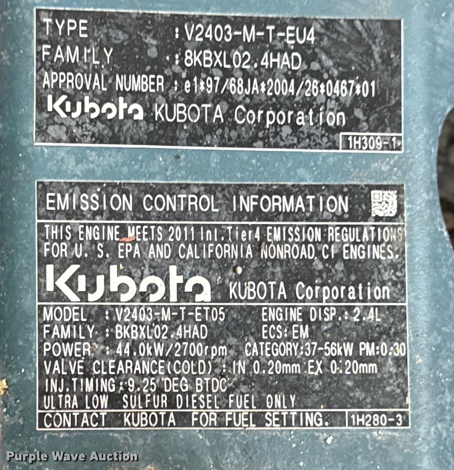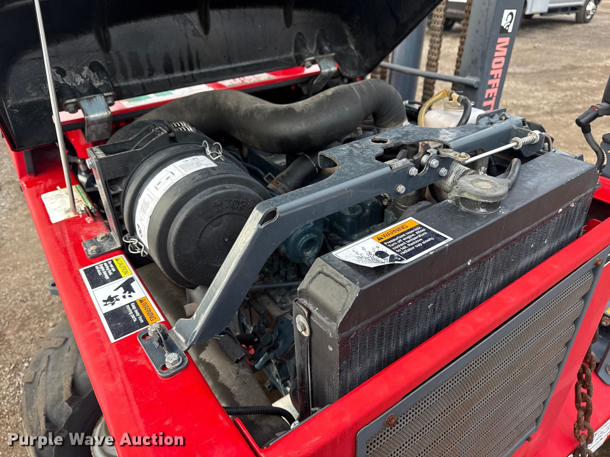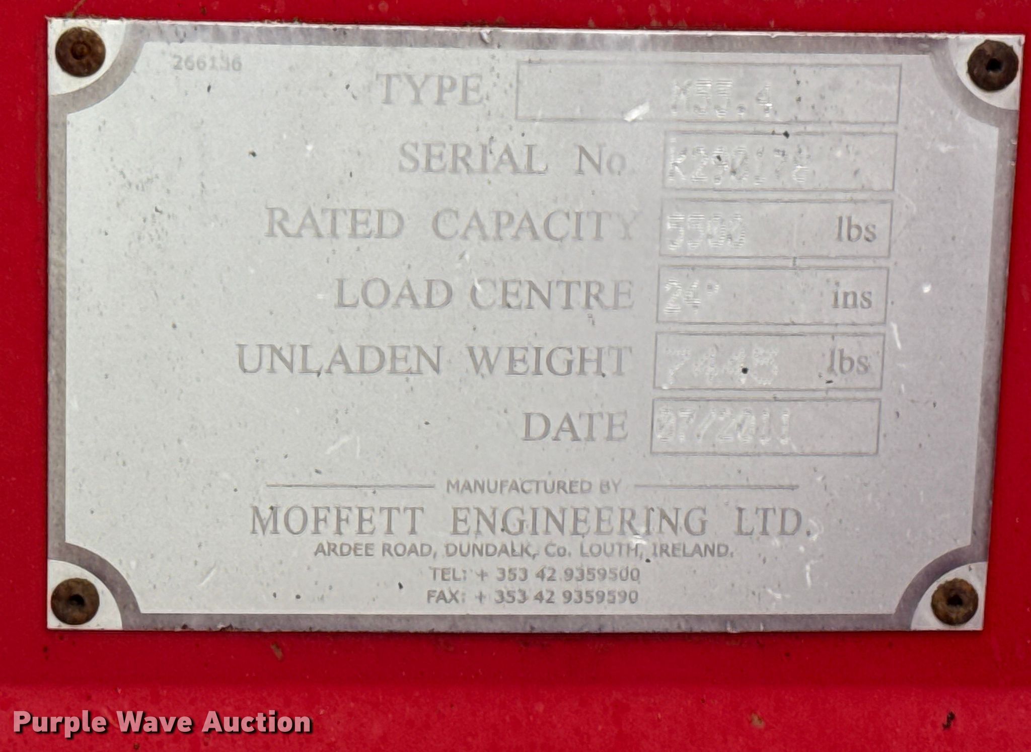 2011 Moffett M55.4 forklift. Hours: 1,710 on meter, Serial: K299178. Engine Kubota V2403-M-T-ET05, Serial: 165769, Displacement: 2.4L, Cylinders: 4, Fuel type: Diesel. Transmission Hydrostatic. Operators station OROPS, Steering: Crab. Features Maximum lift capacity: 5,500 lbs, Maximum lift height: 120", Collapsed mast height: 96", Mast stages: 1, Side shift, Mast tilt, Reach / retract, Fork length: 48". Tires Size: 31.5x13x16.5 NHS. Collinsville, OK 74021